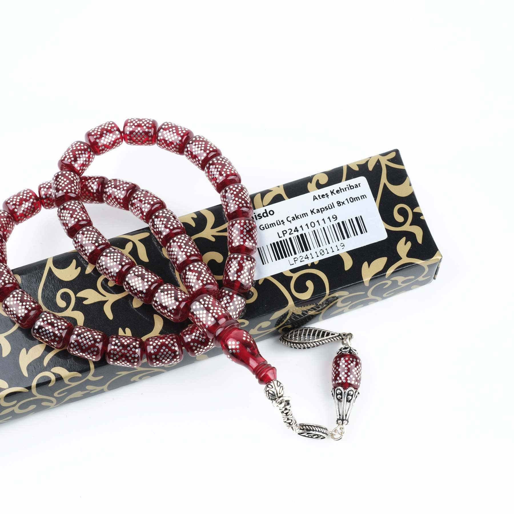 Ateş Kehribar 925Ayar Gümüş Çakım ve Gümüş Püskül Kapsül Kesim 8x10mm Tesbih - Kırmızı