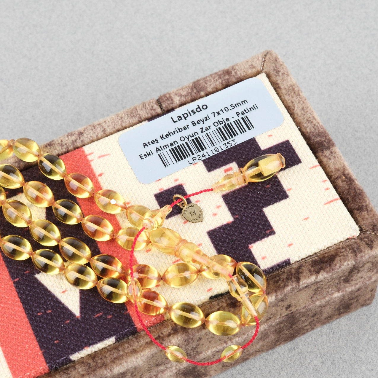 Ateş Kehribar Eski Oyun Zar Obje Patinli Beyzi Kesim 7x10.5mm Tesbih - Usta İşi İmzalı Dönem Yapı