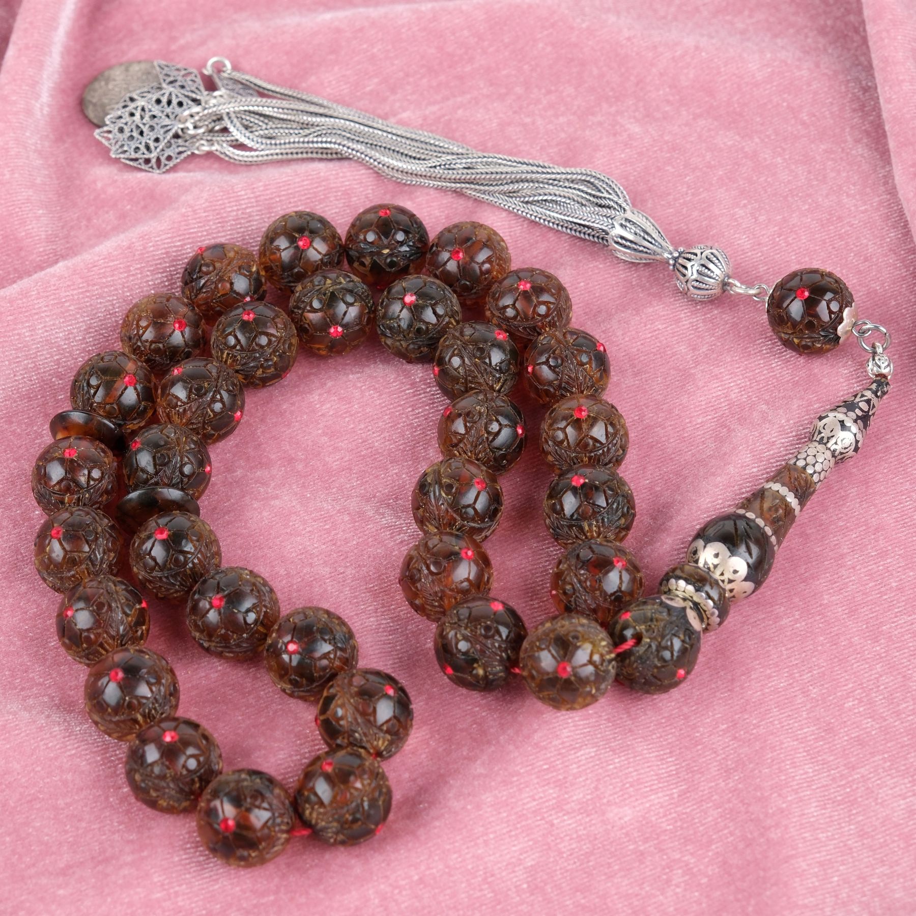 Domink Kaya Damla Kehribar 925Ayar Gümüş Püskül Kalem İşçilik Mine Taşı Taneli Nakkaş İmame Faseta Kesim 14mm Tesbih