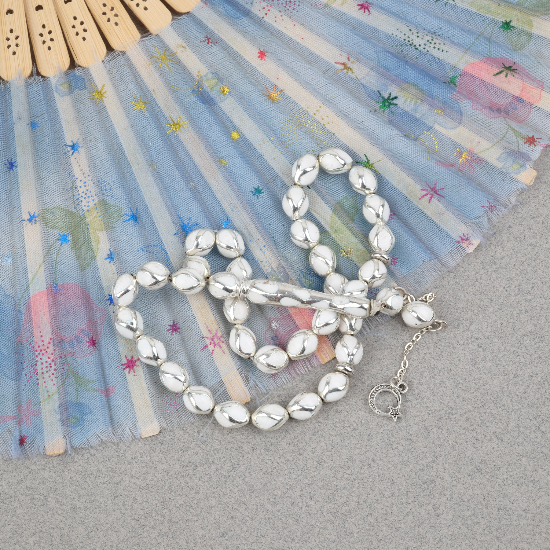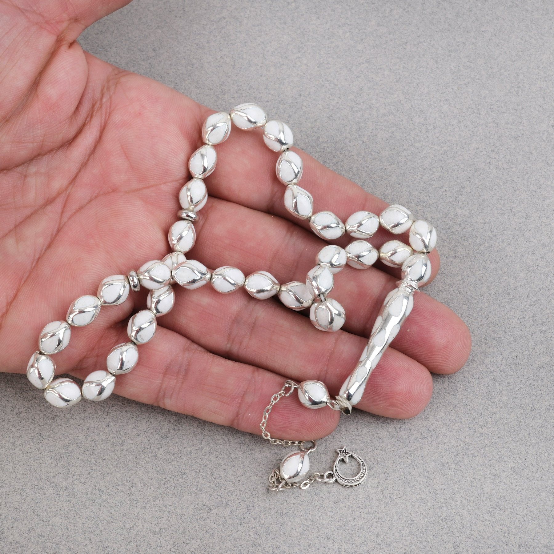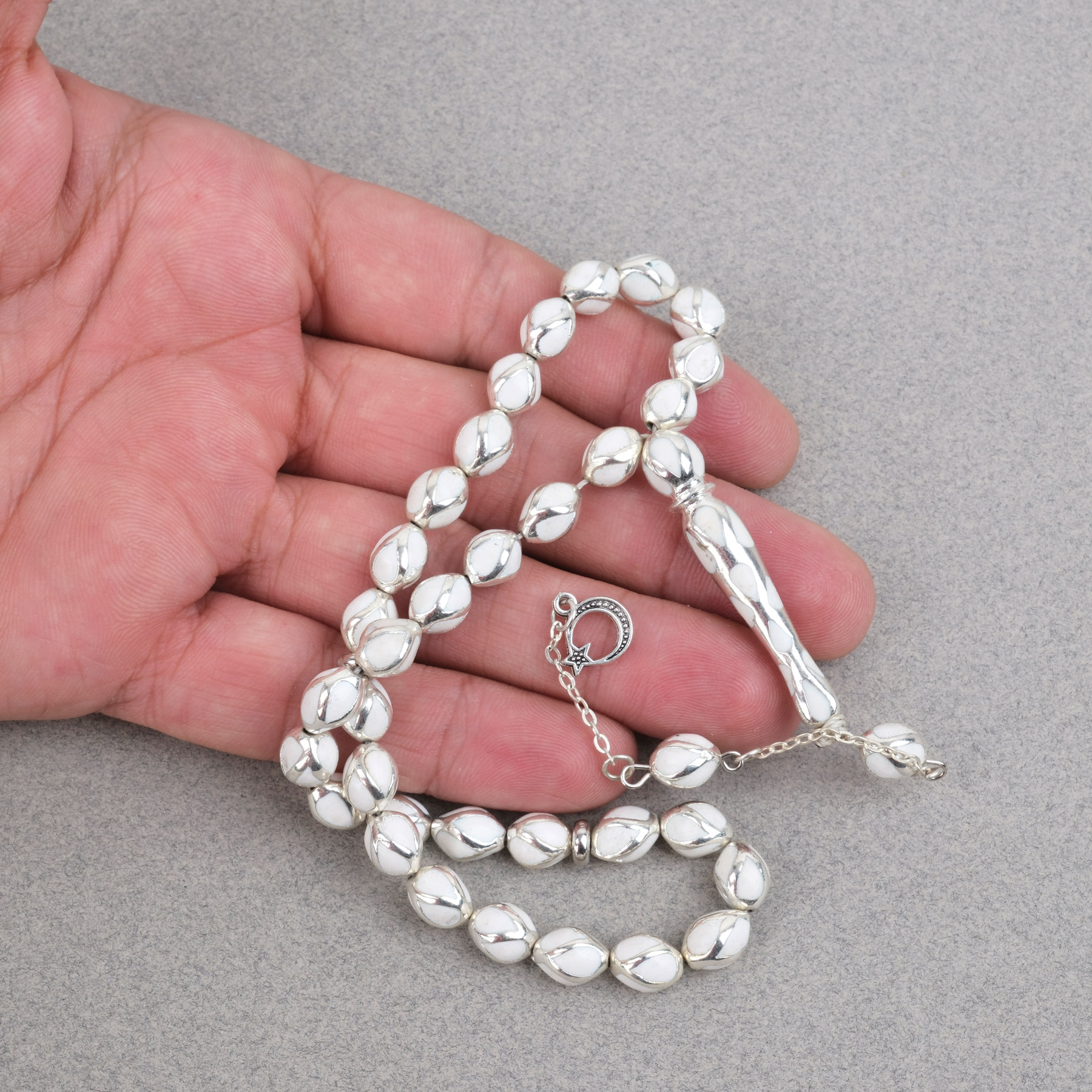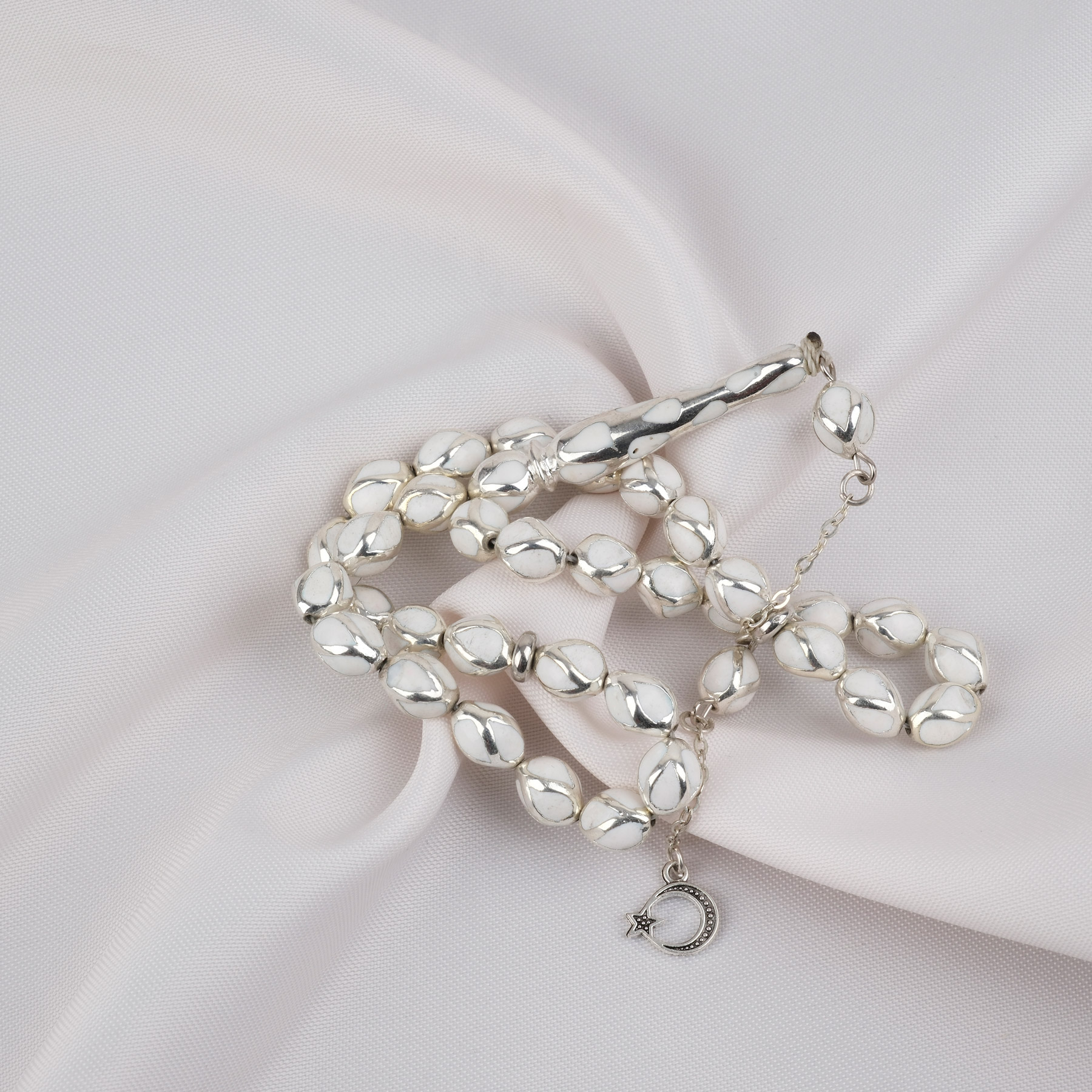Gümüş Kaplama Kafesli Mine Beyzi 7x9mm Tesbih - Beyaz