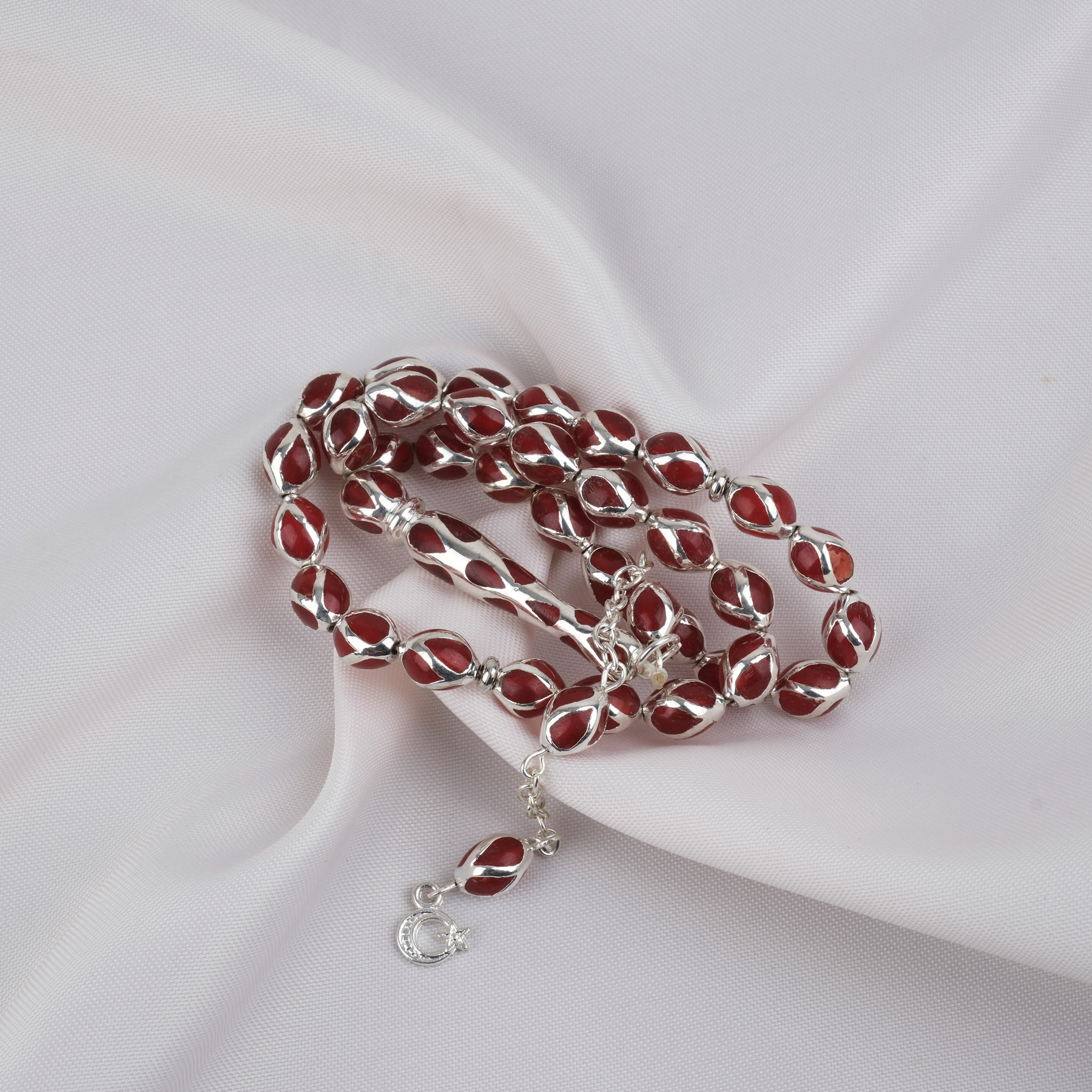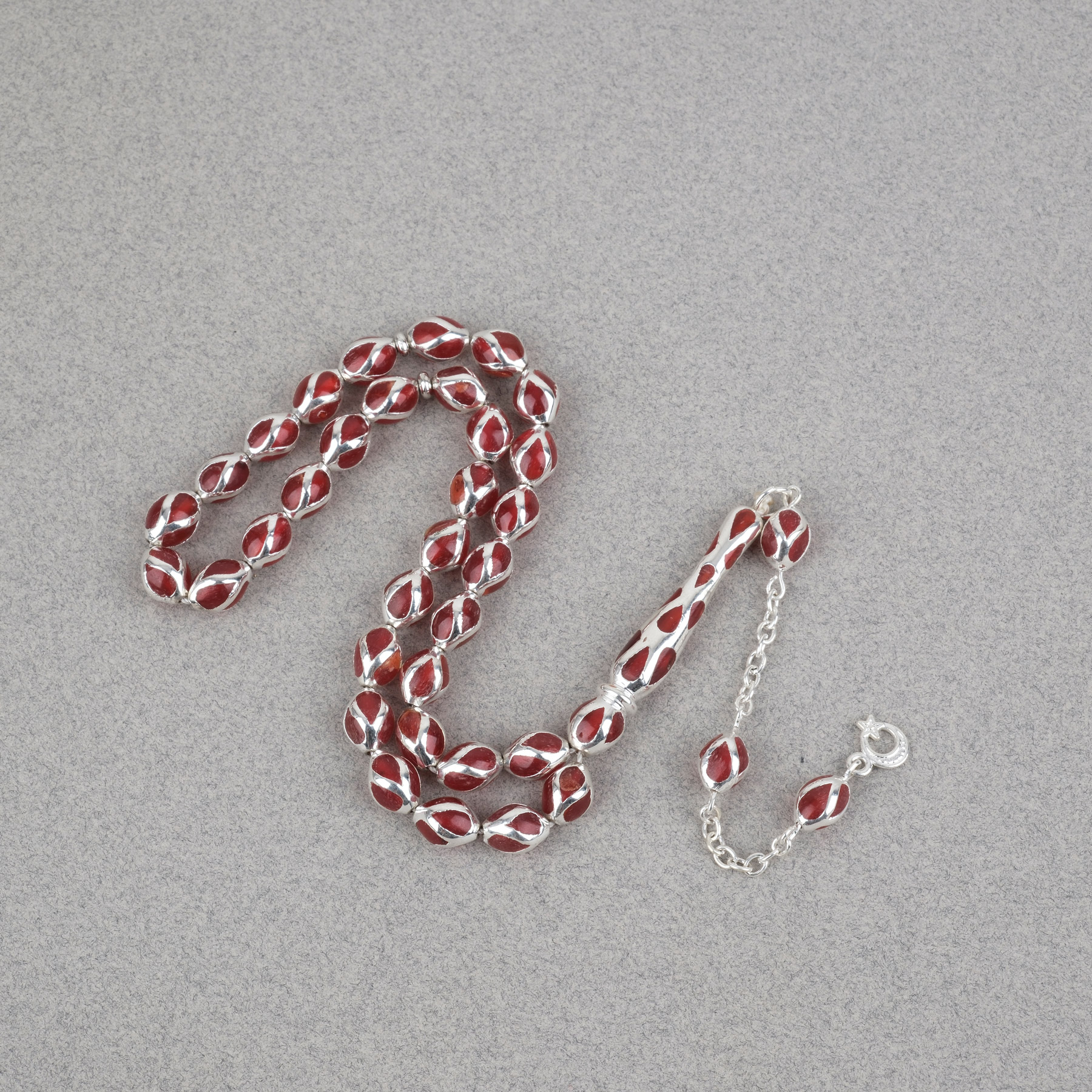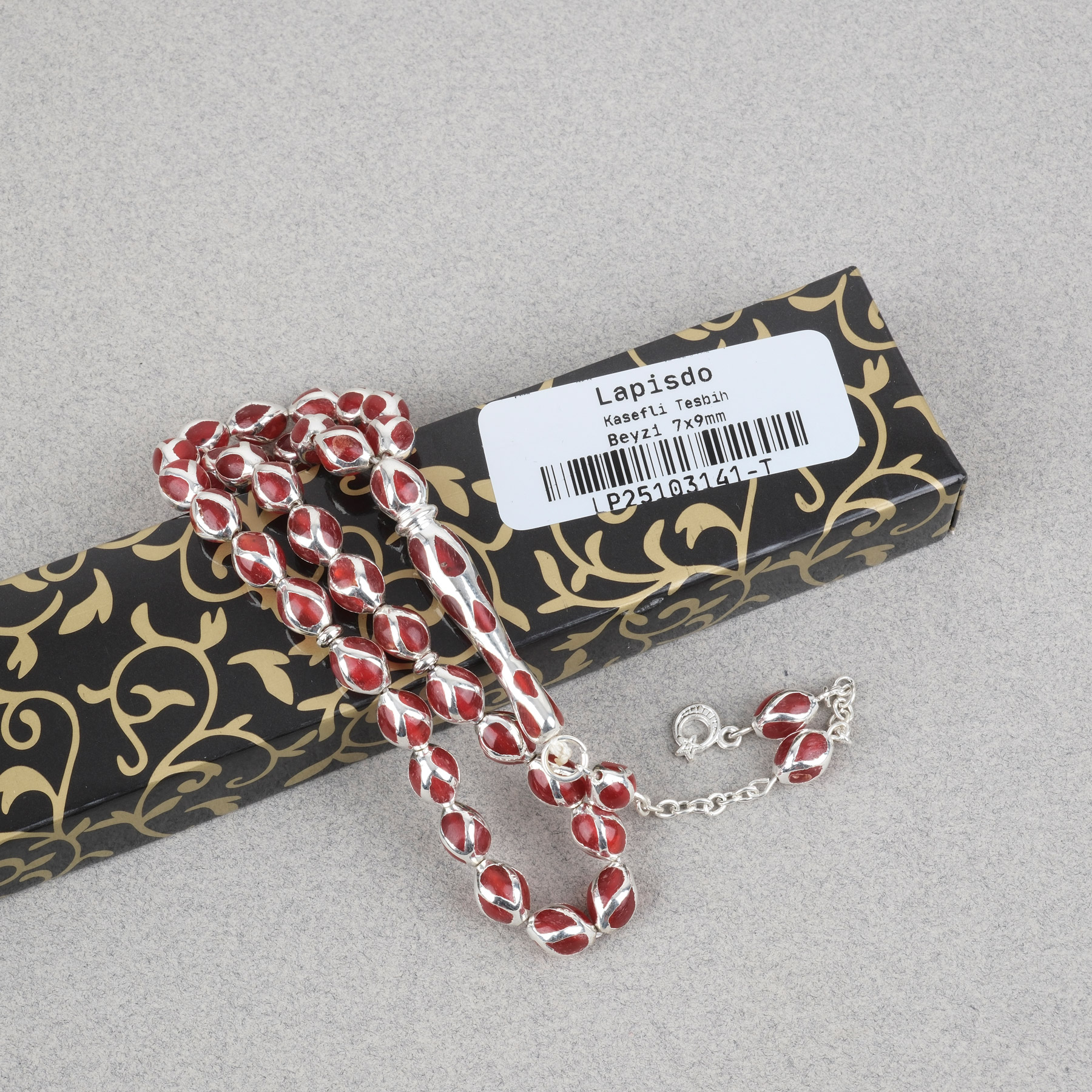 Gümüş Kaplama Kafesli Mine Beyzi 7x9mm Tesbih - Kırmızı