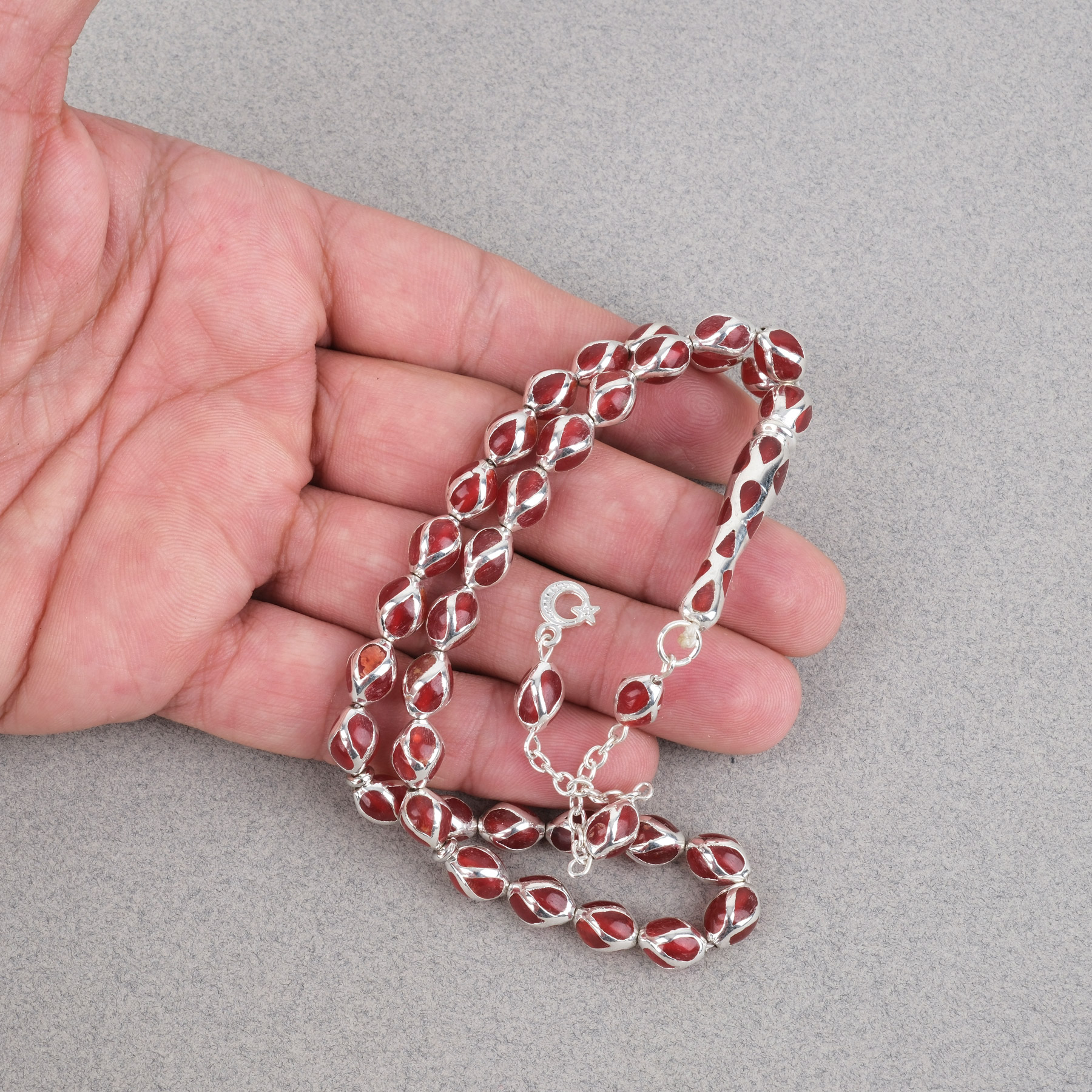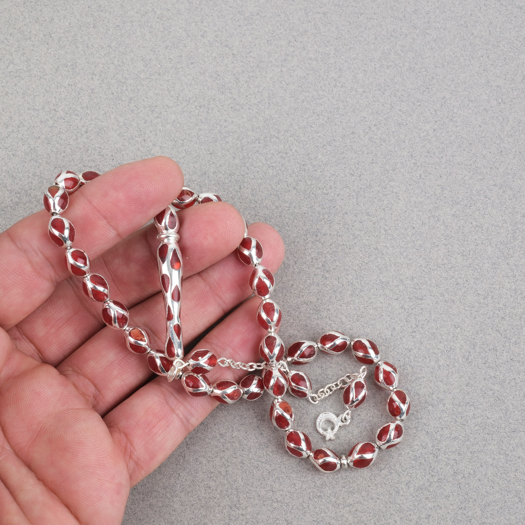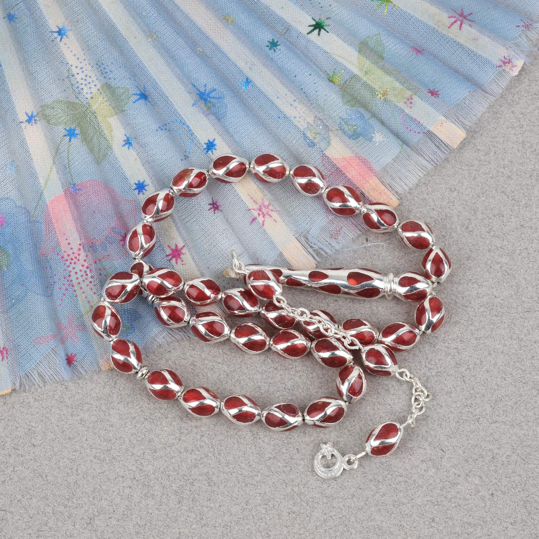 Gümüş Kaplama Kafesli Mine Beyzi 7x9mm Tesbih - Kırmızı