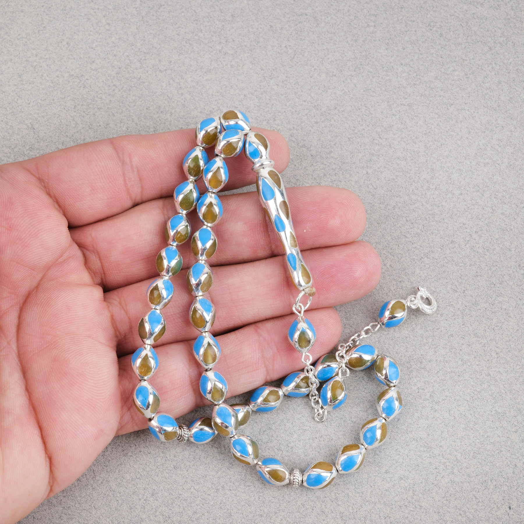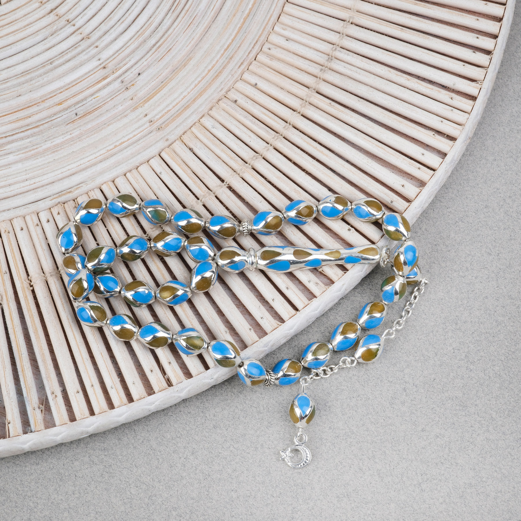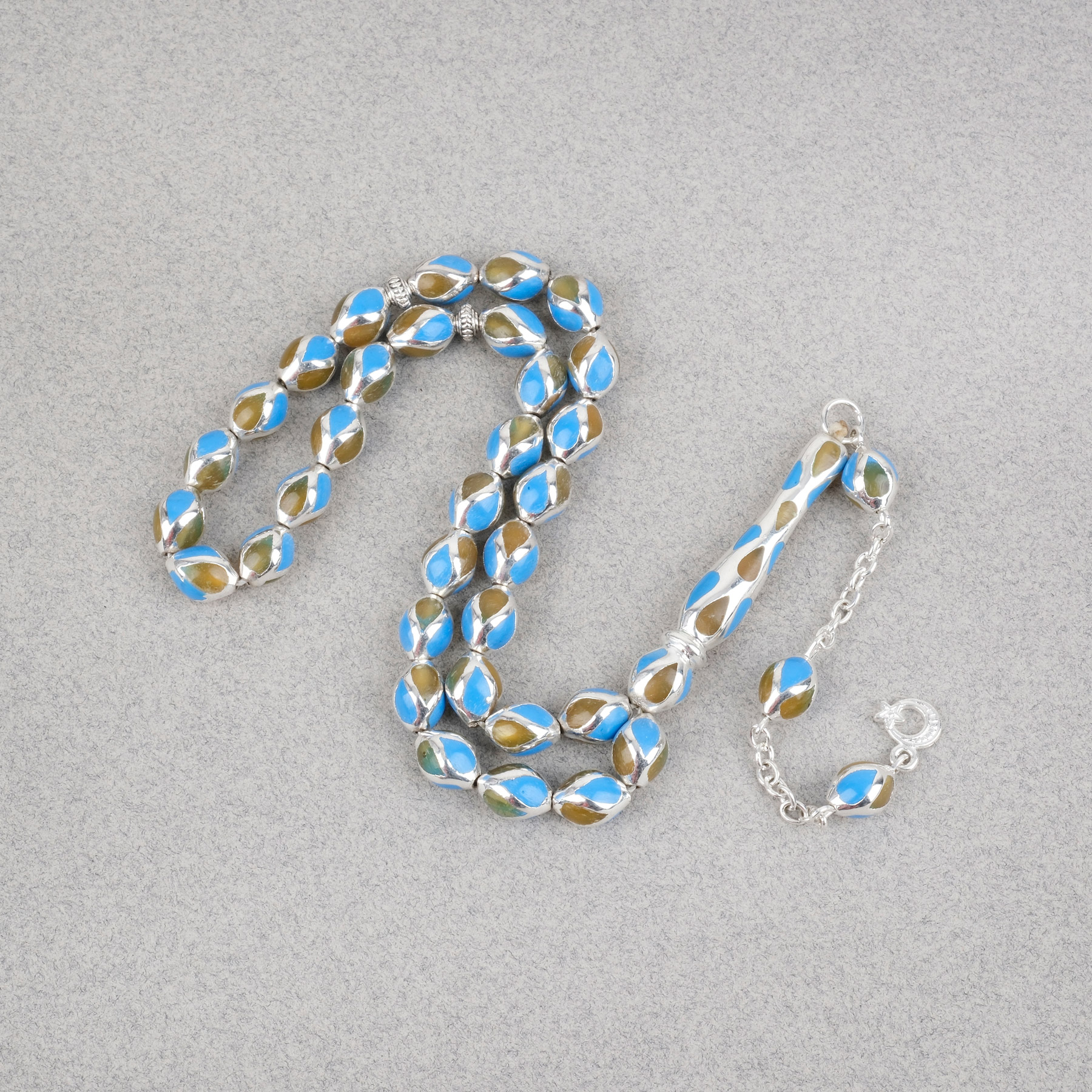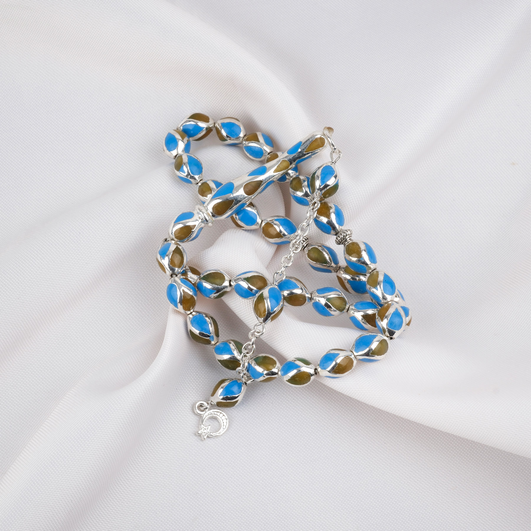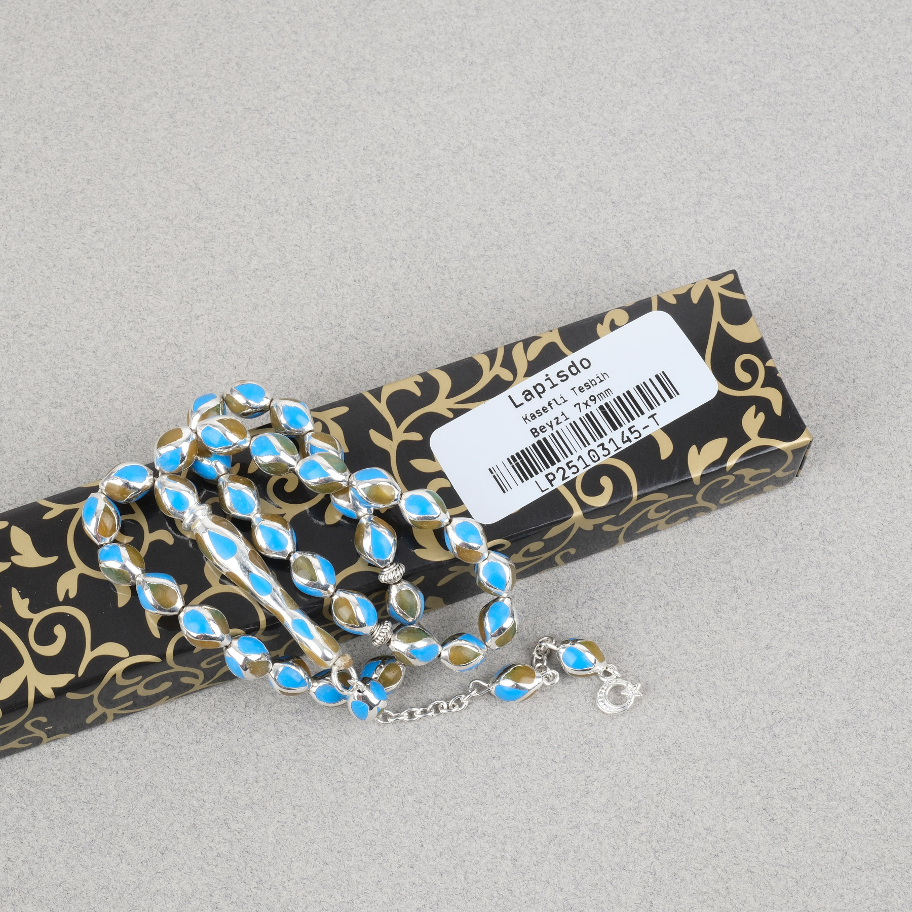Gümüş Kaplama Kafesli Mine Beyzi 7x9mm Tesbih - Mavi Sarı