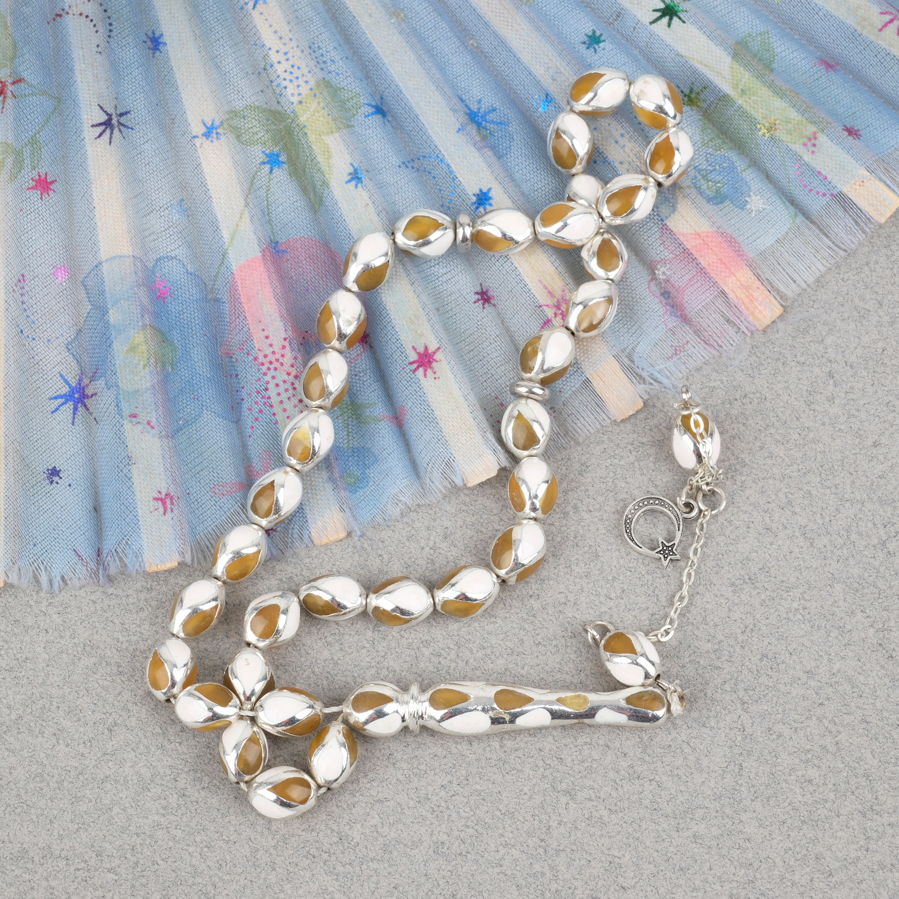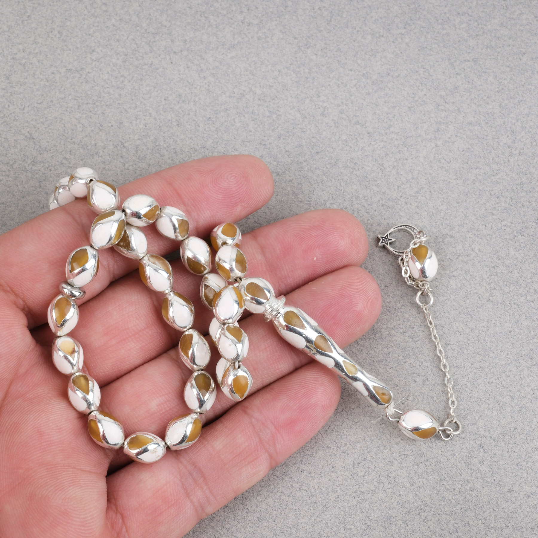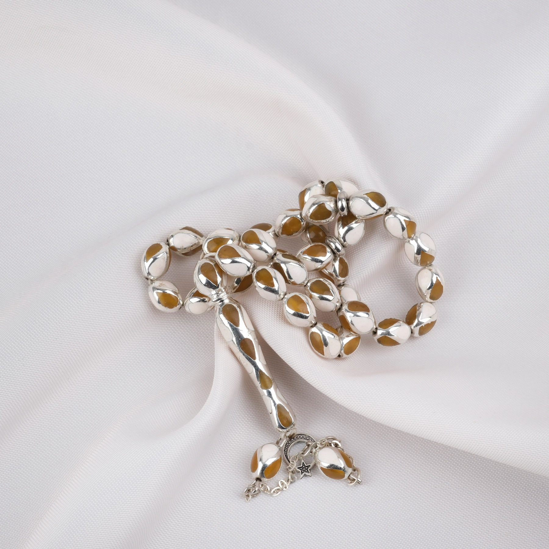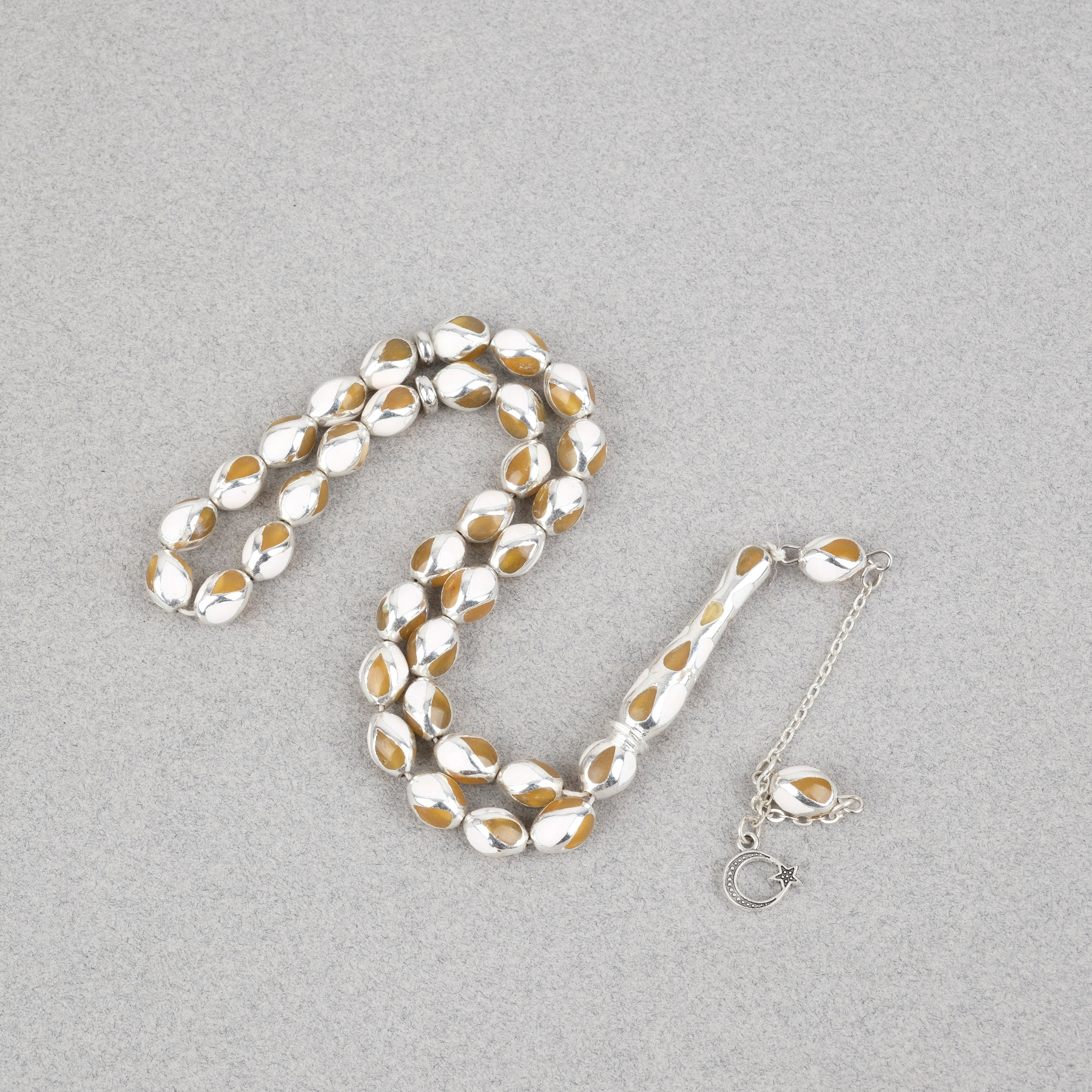 Gümüş Kaplama Kafesli Mine Beyzi 7x9mm Tesbih - Sarı Beyaz