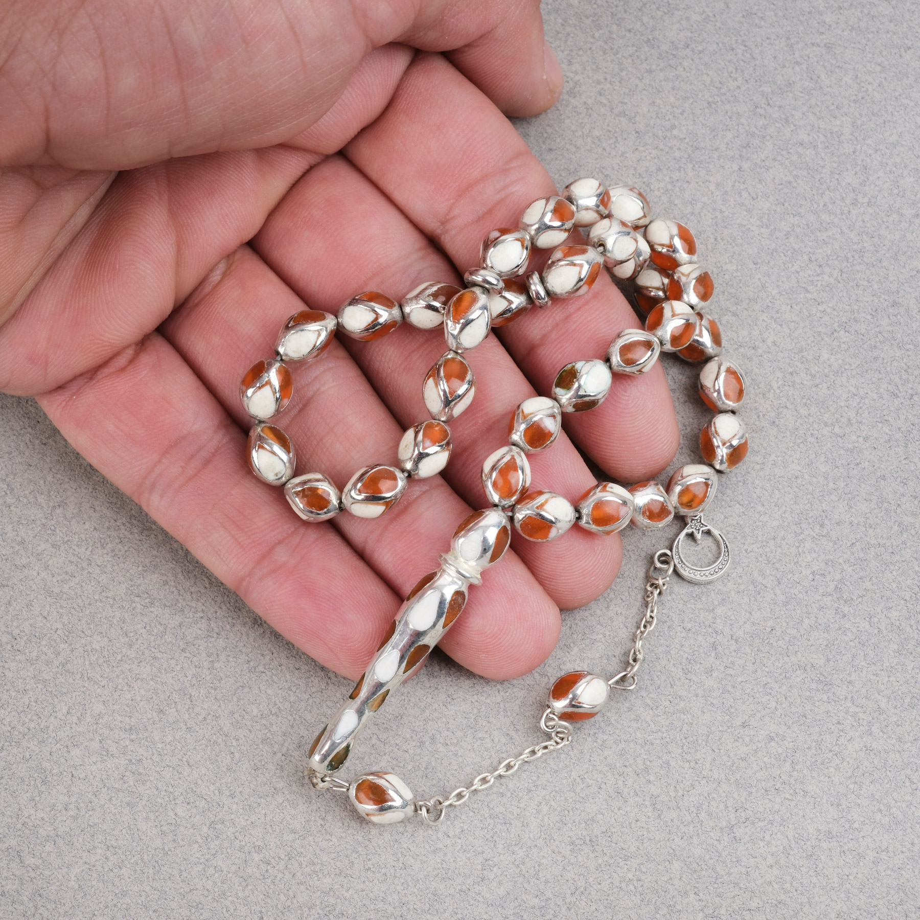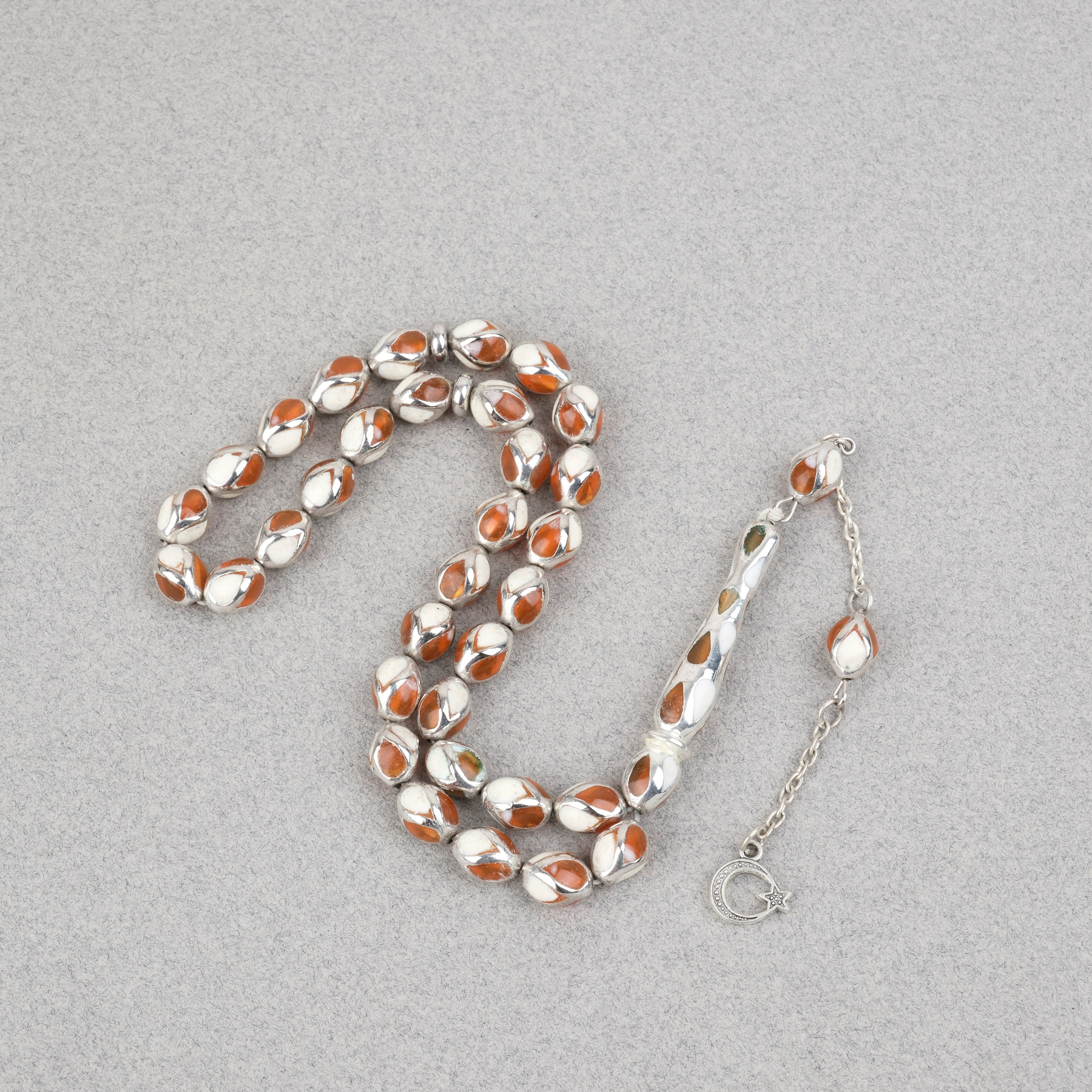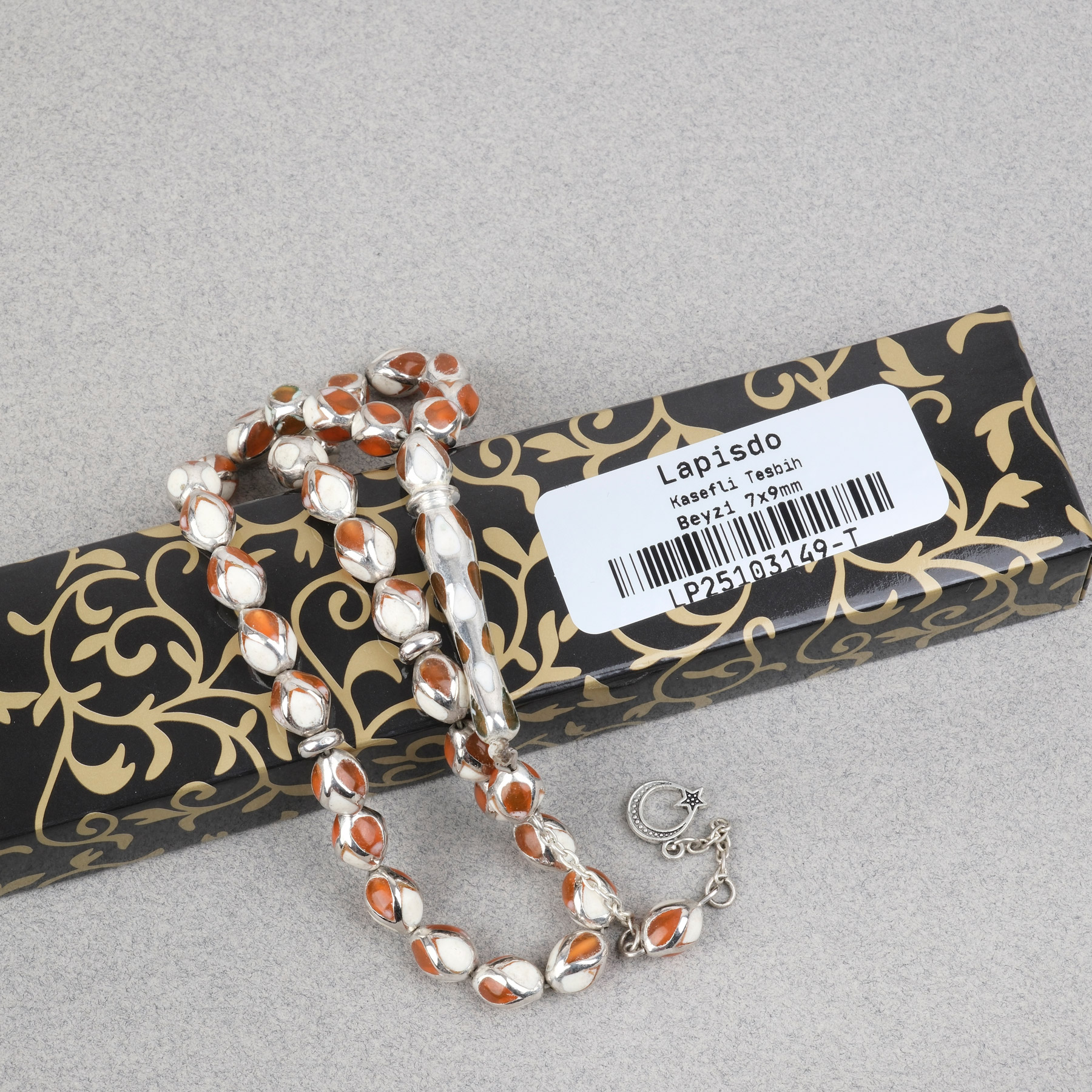 Gümüş Kaplama Kafesli Mine Beyzi 7x9mm Tesbih - Turkuaz Beyaz