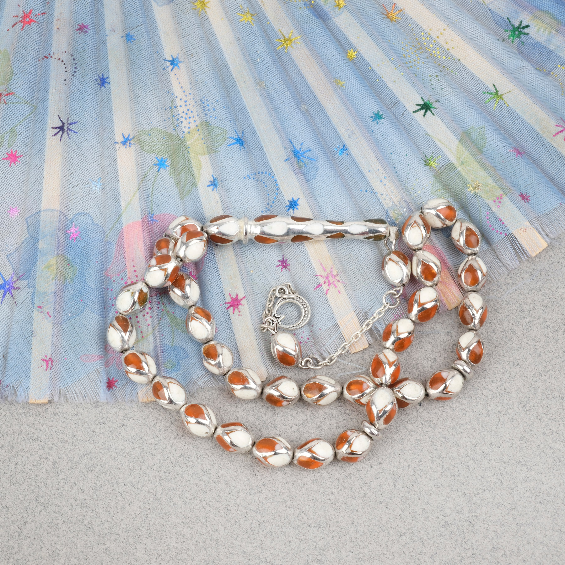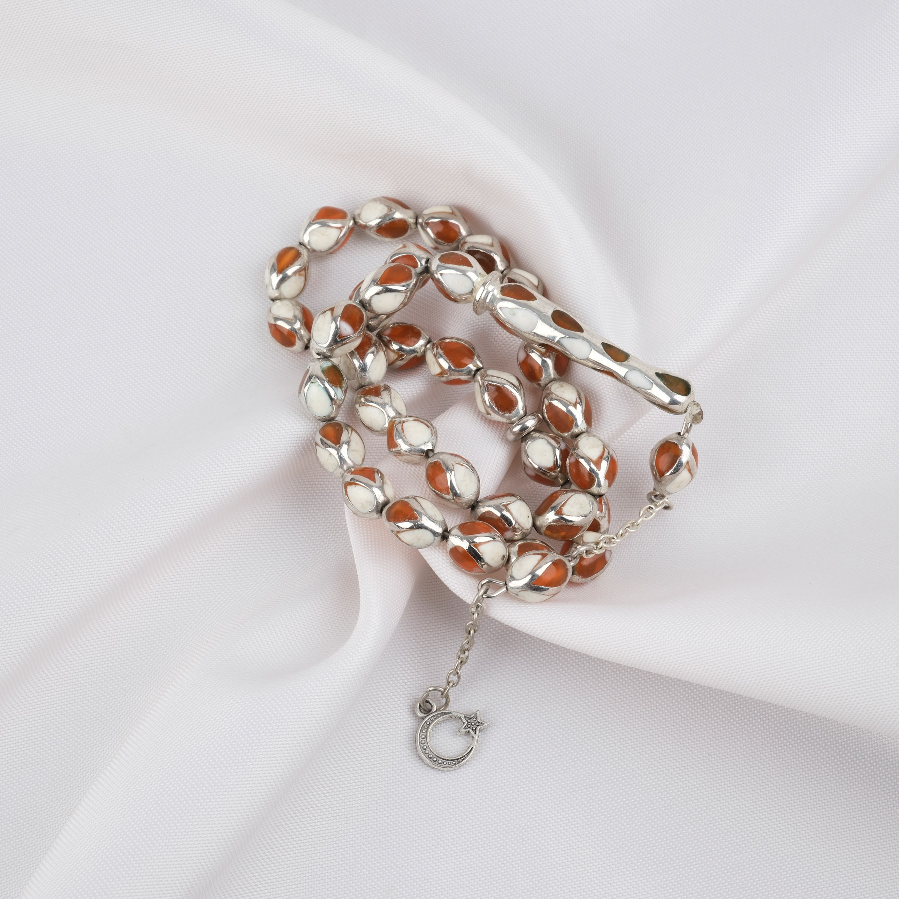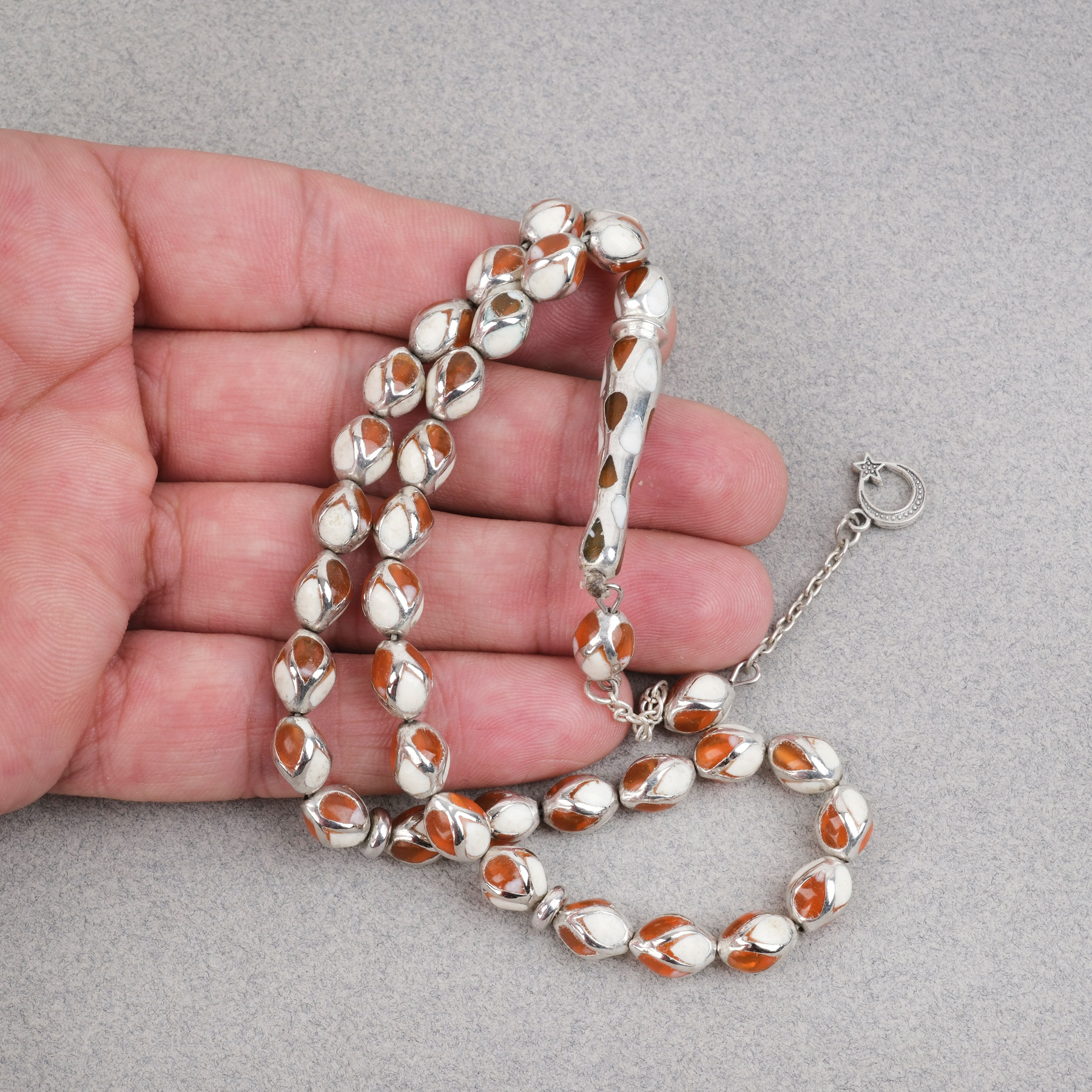 Gümüş Kaplama Kafesli Mine Beyzi 7x9mm Tesbih - Turkuaz Beyaz