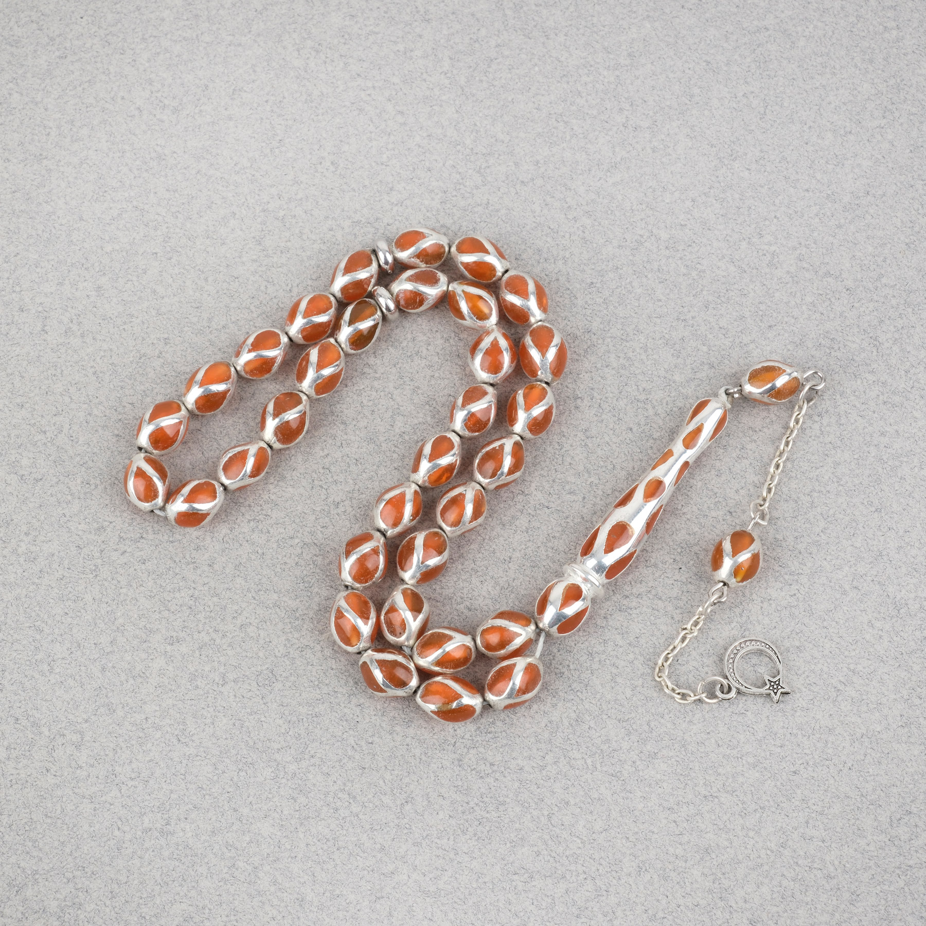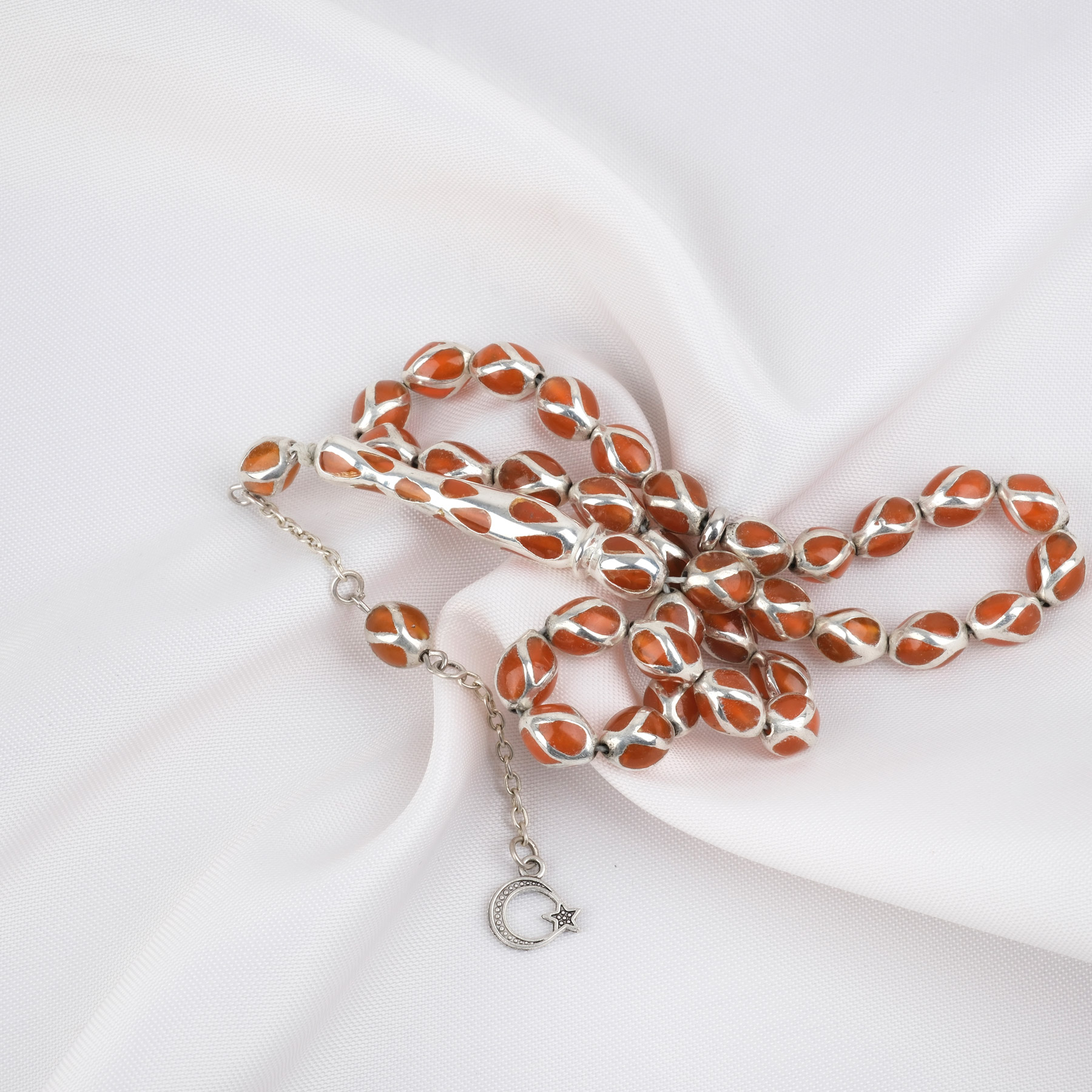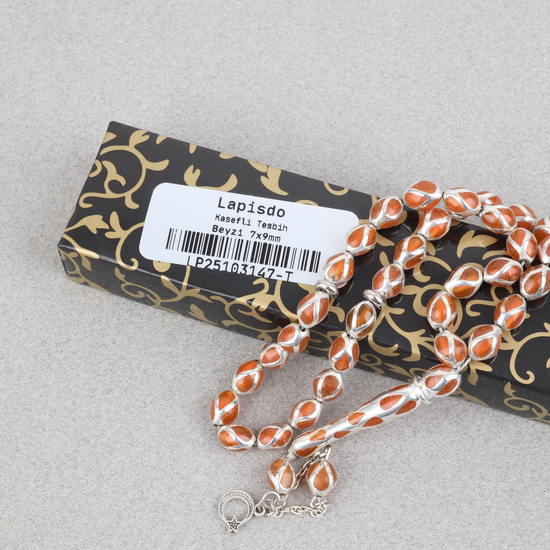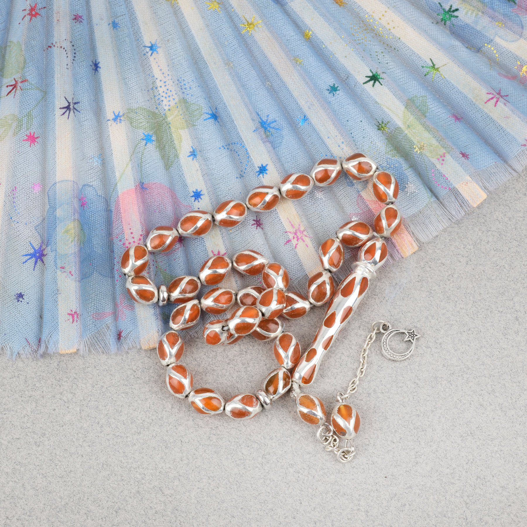 Gümüş Kaplama Kafesli Mine Beyzi 7x9mm Tesbih - Turuncu