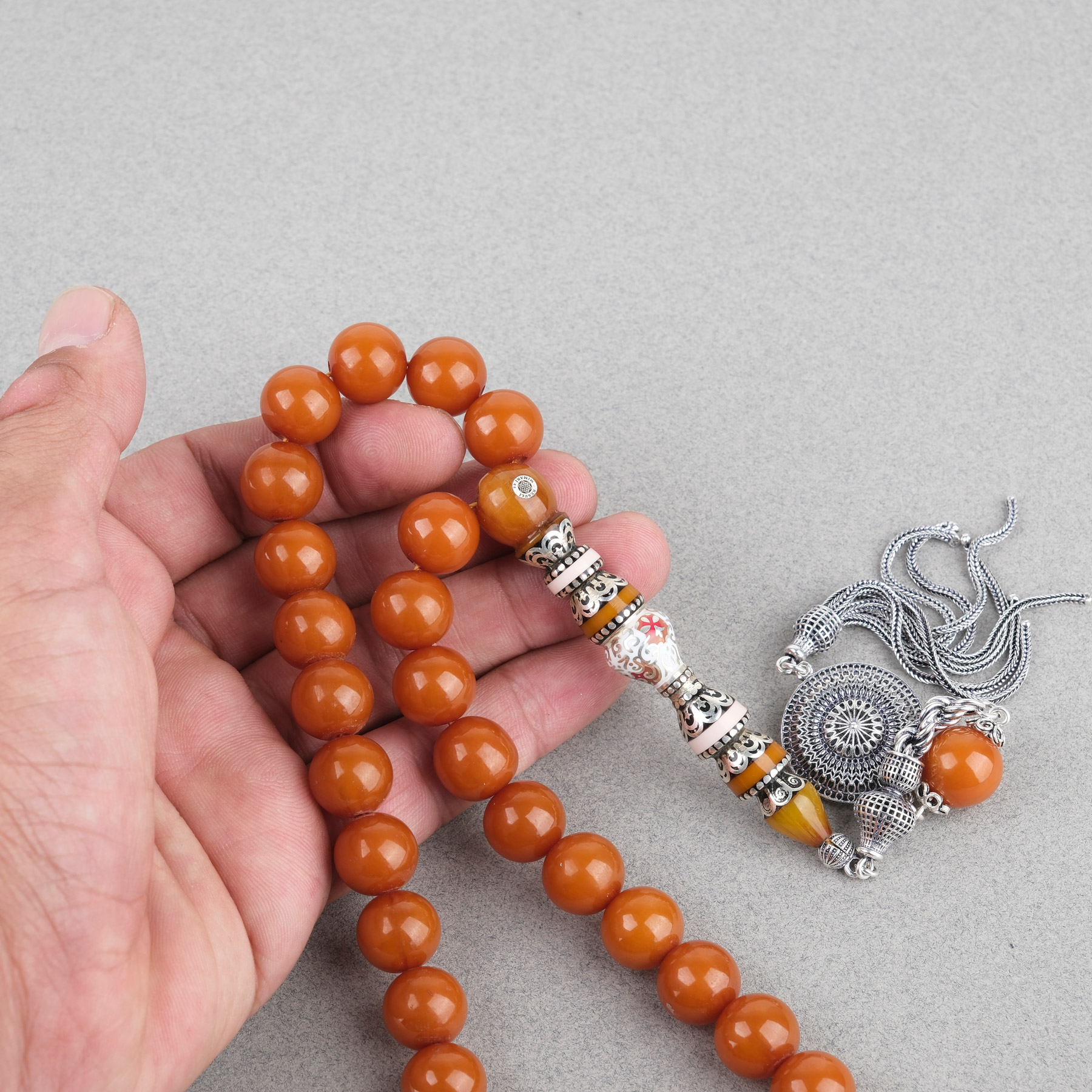 Sıkma Kehribar 925Ayar Gümüş Püskül Özel Gümüş Nakış İmame Küre Kesim 13mm Tesbih