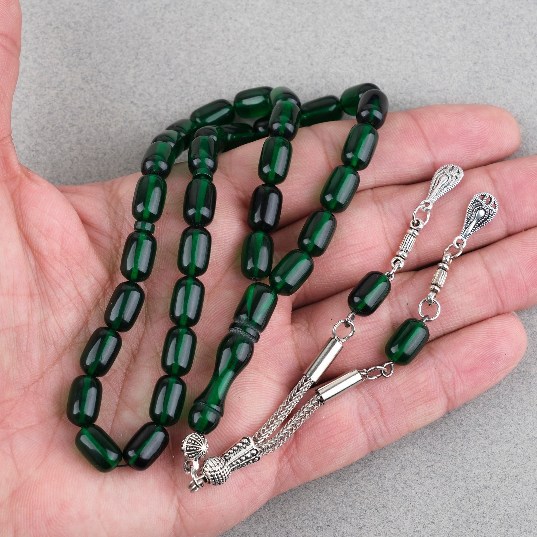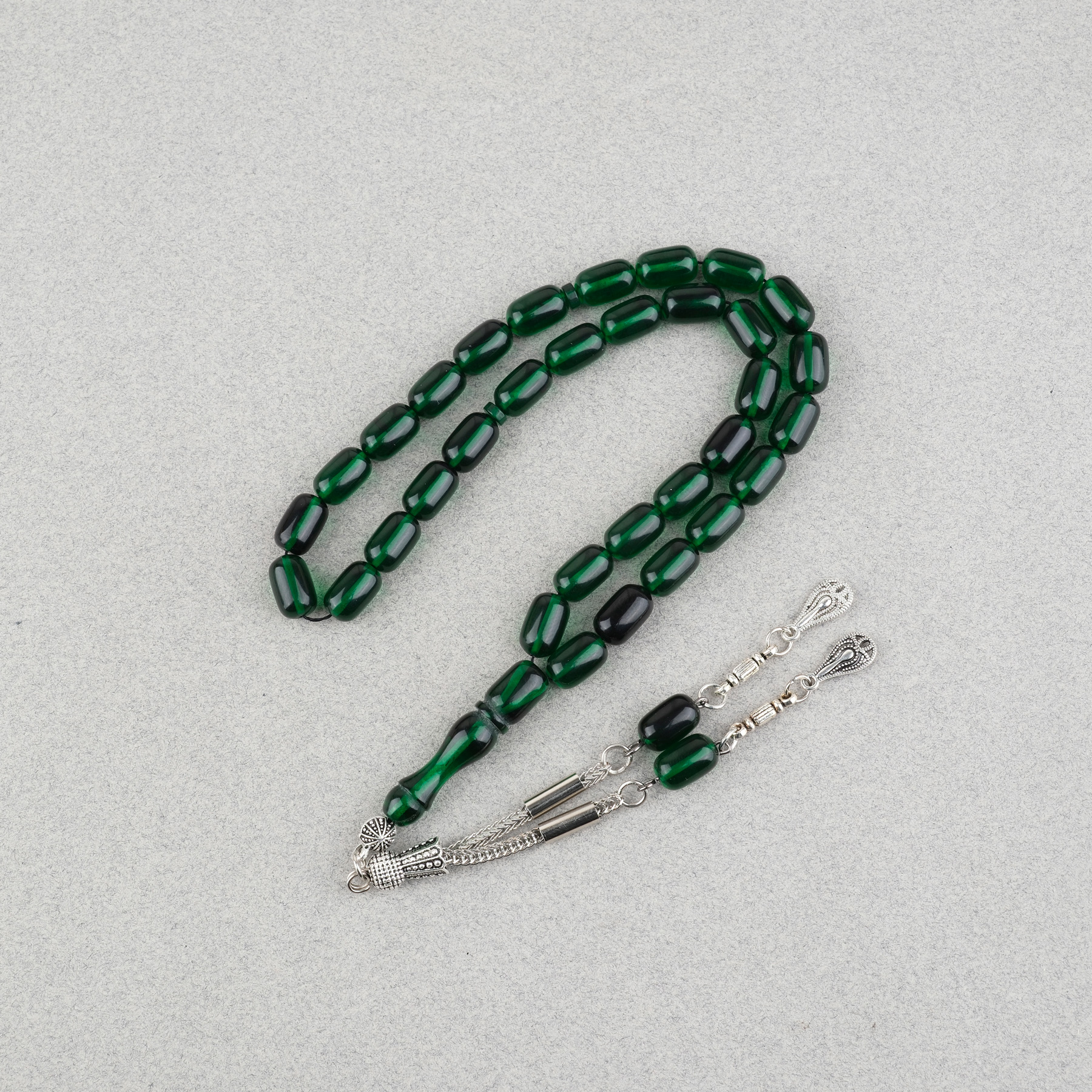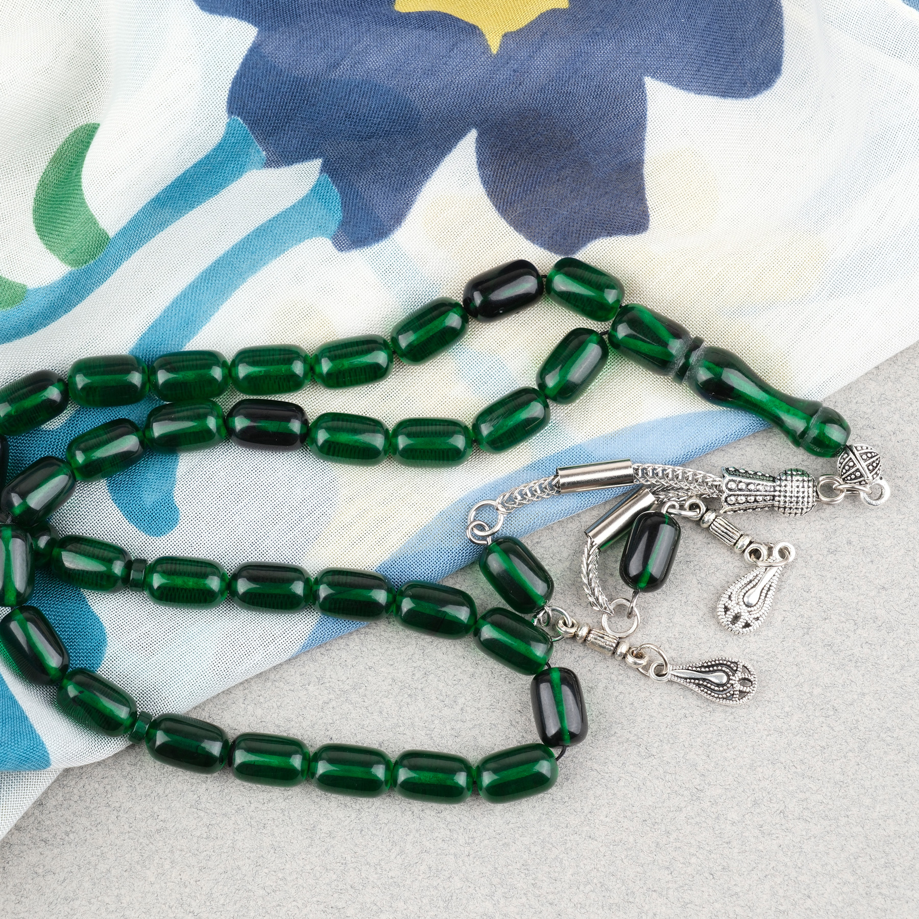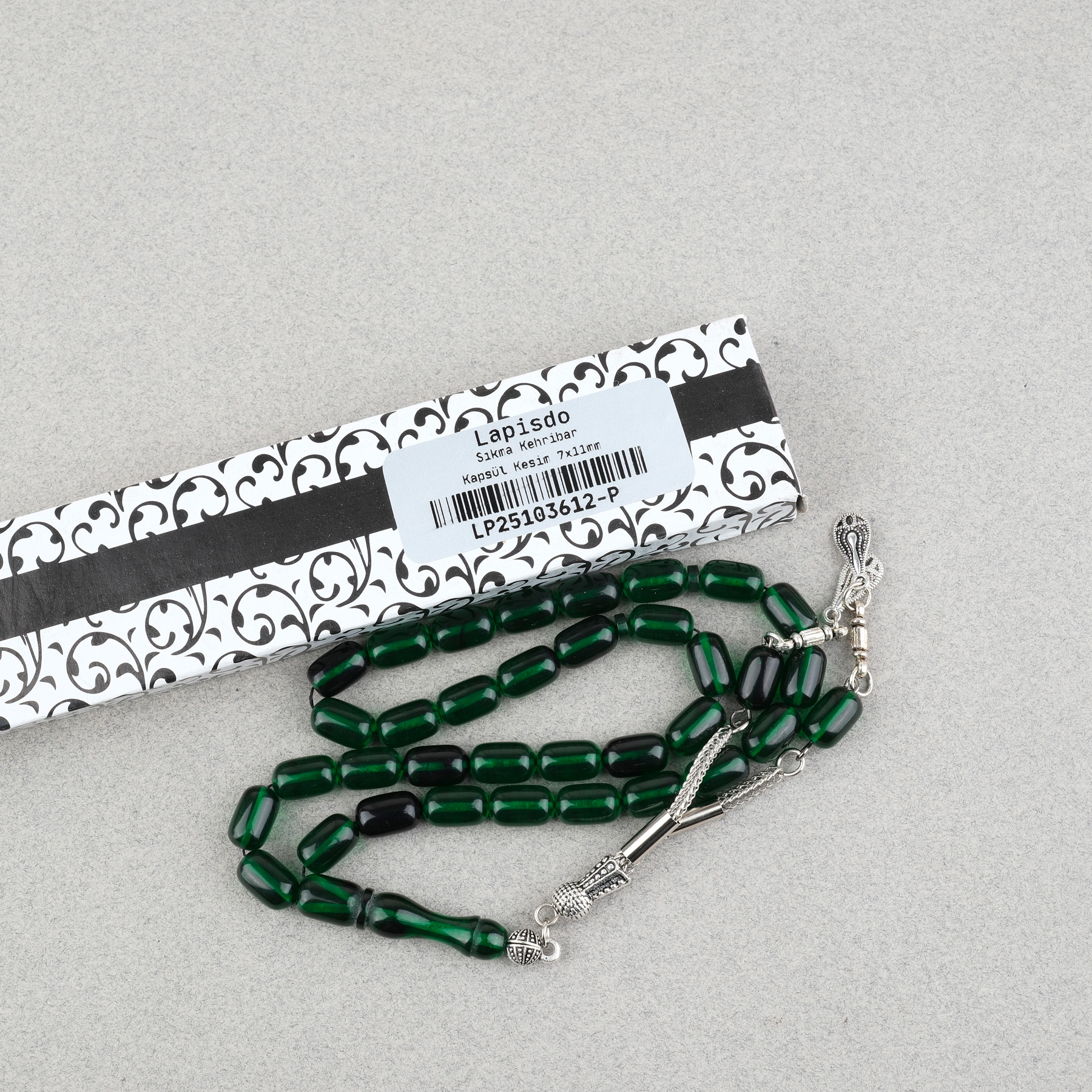 Sıkma Kehribar Kapsül Kesim Alpaka Püsküllü 7x11mm Tesbih Koyu Yeşil