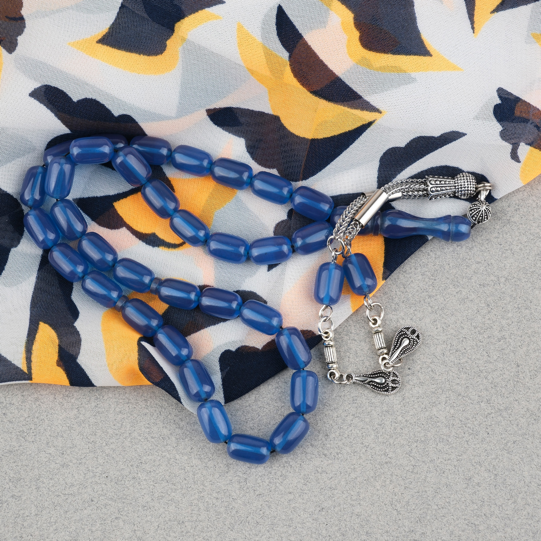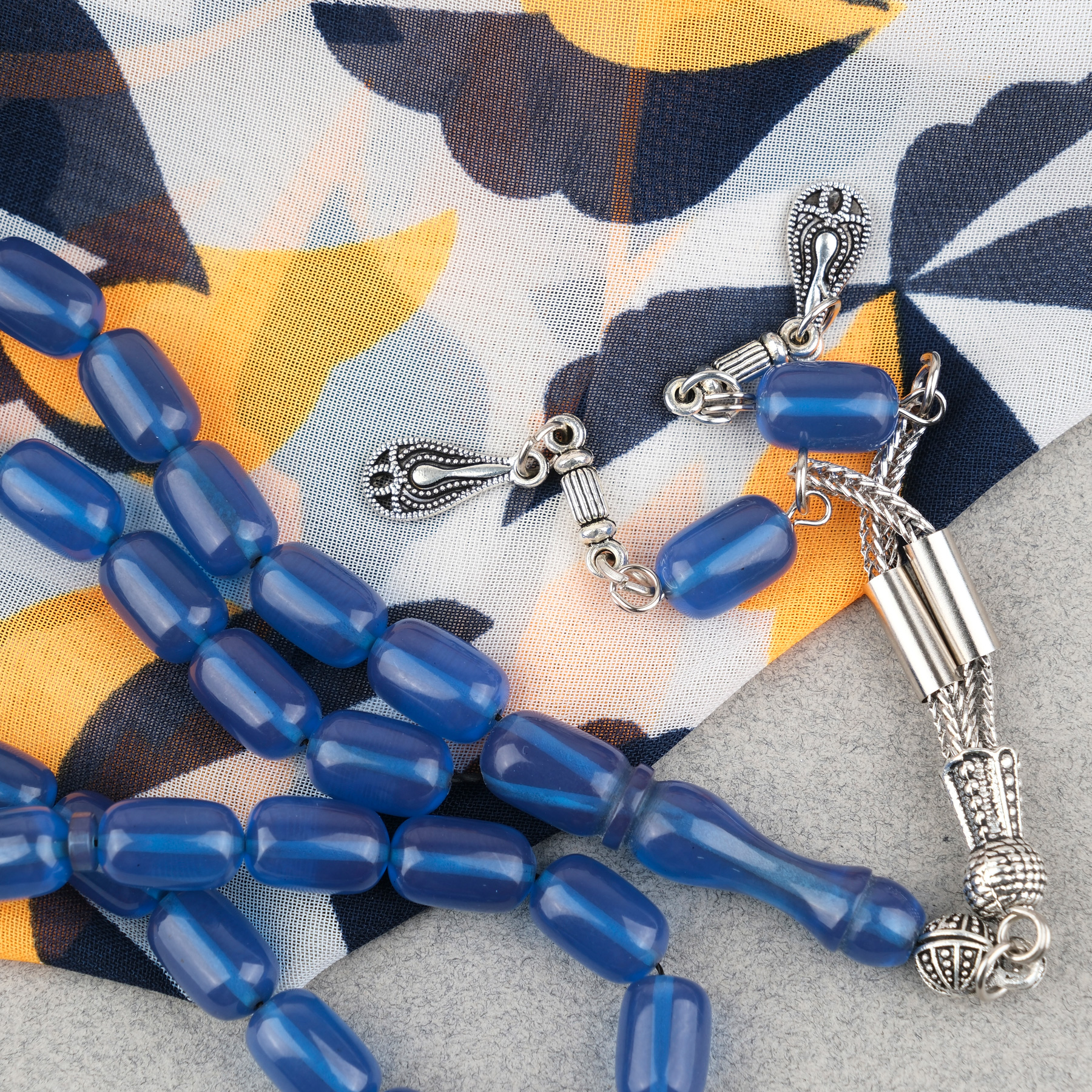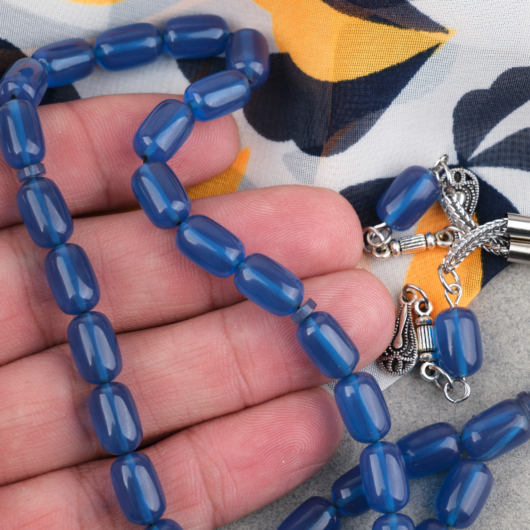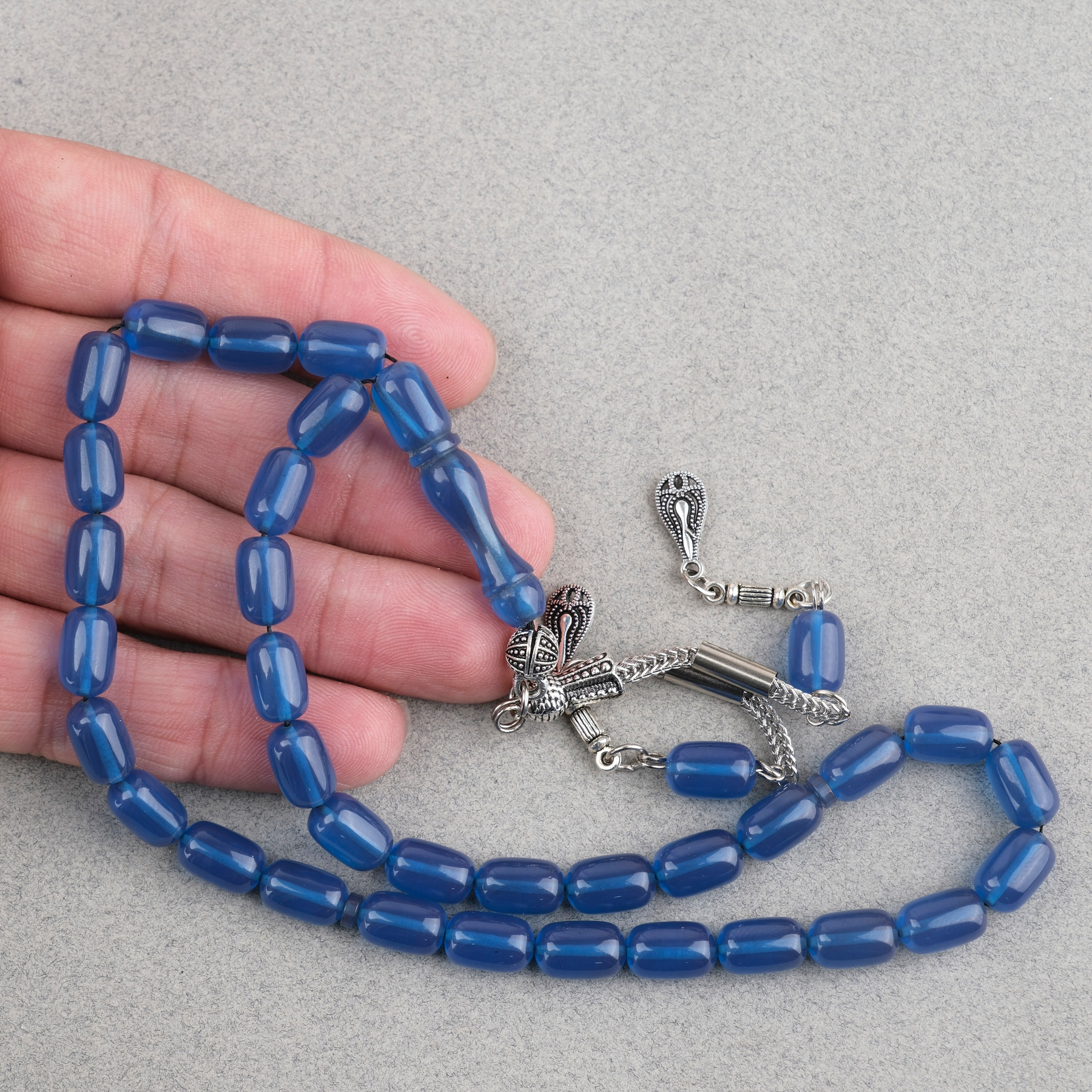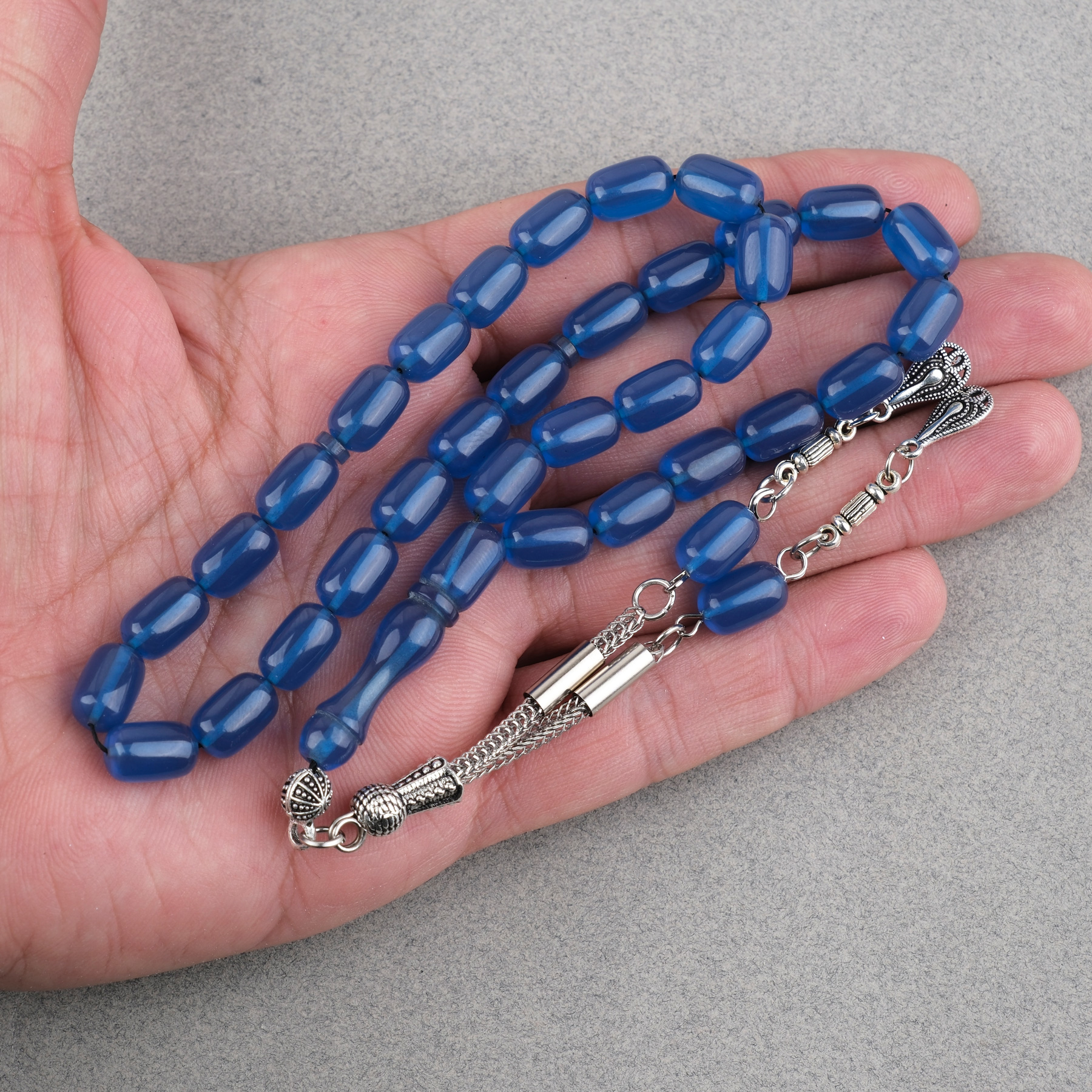 Sıkma Kehribar Kapsül Kesim Alpaka Püsküllü 7x11mm Tesbih Mavi
