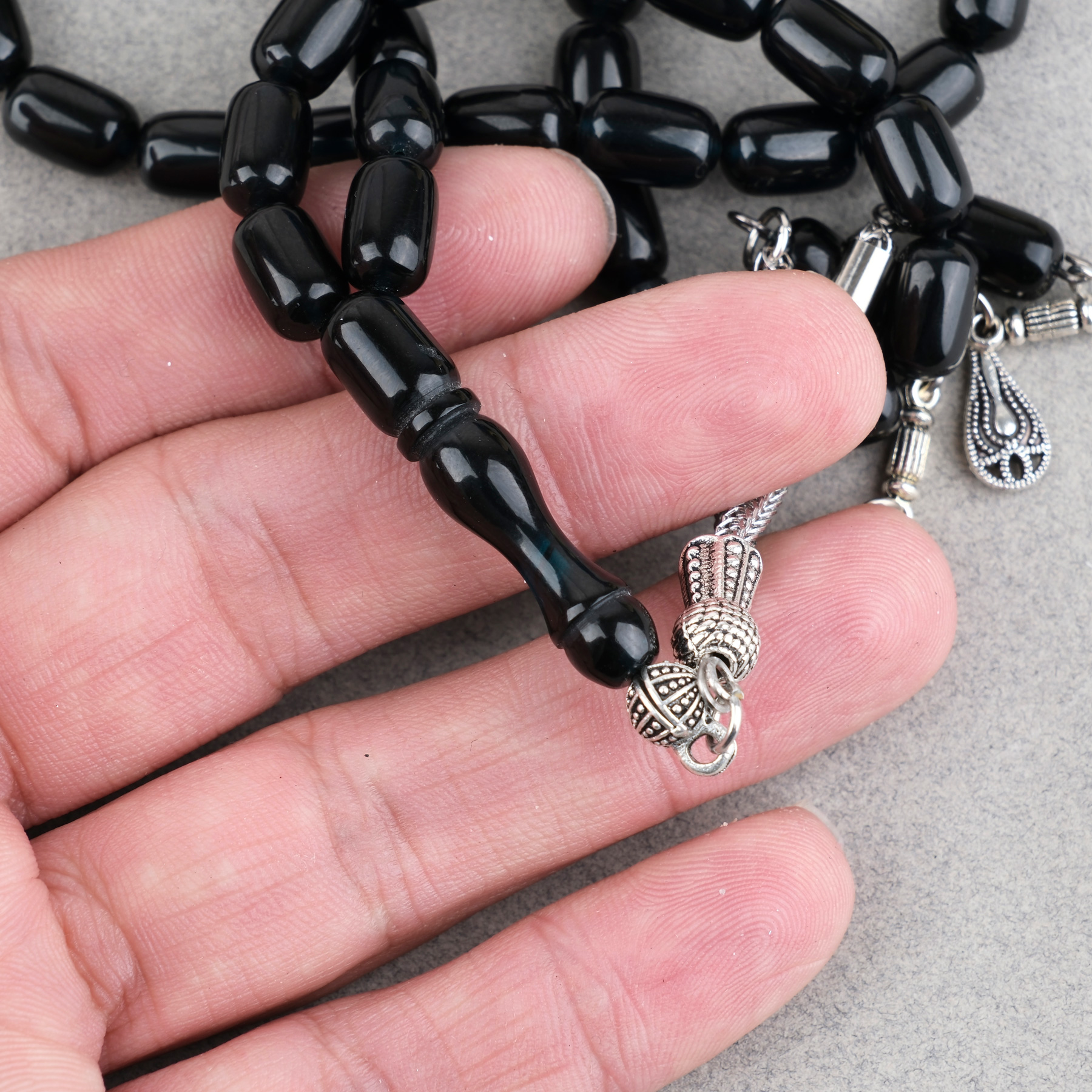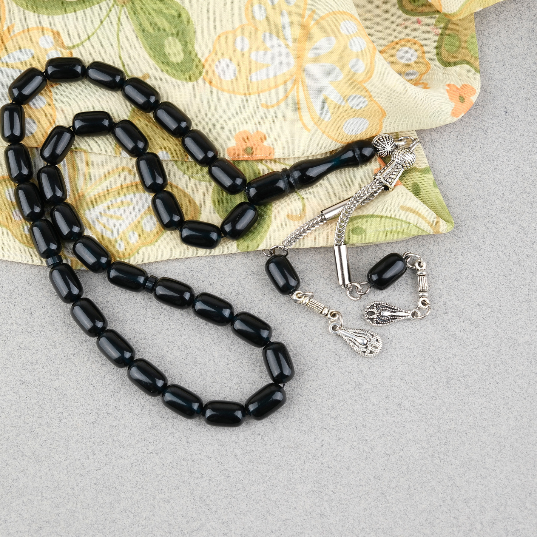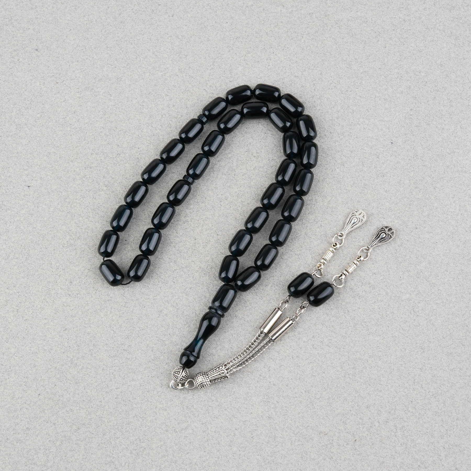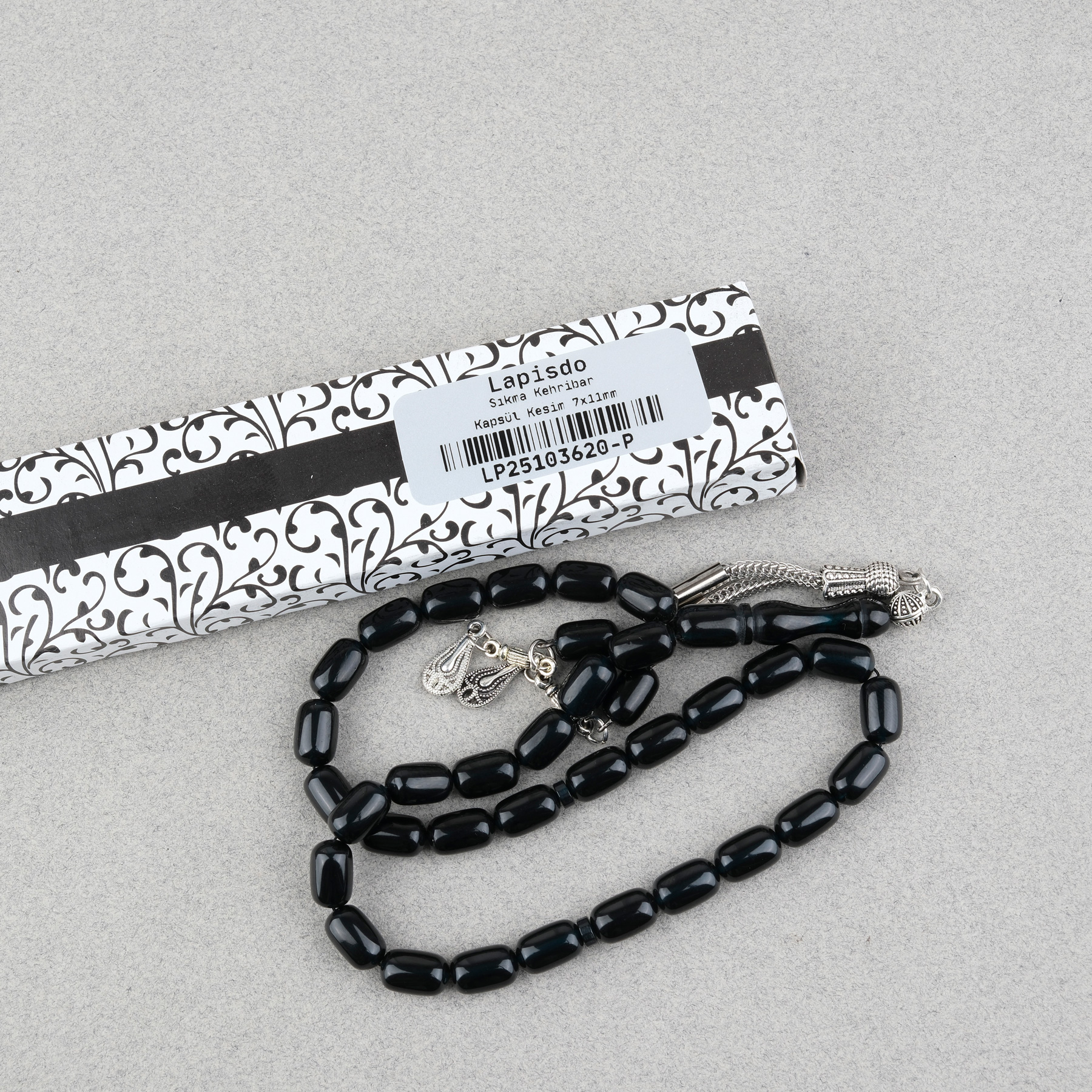 Sıkma Kehribar Kapsül Kesim Alpaka Püsküllü 7x11mm Tesbih Mavi Yansımalı Siyah