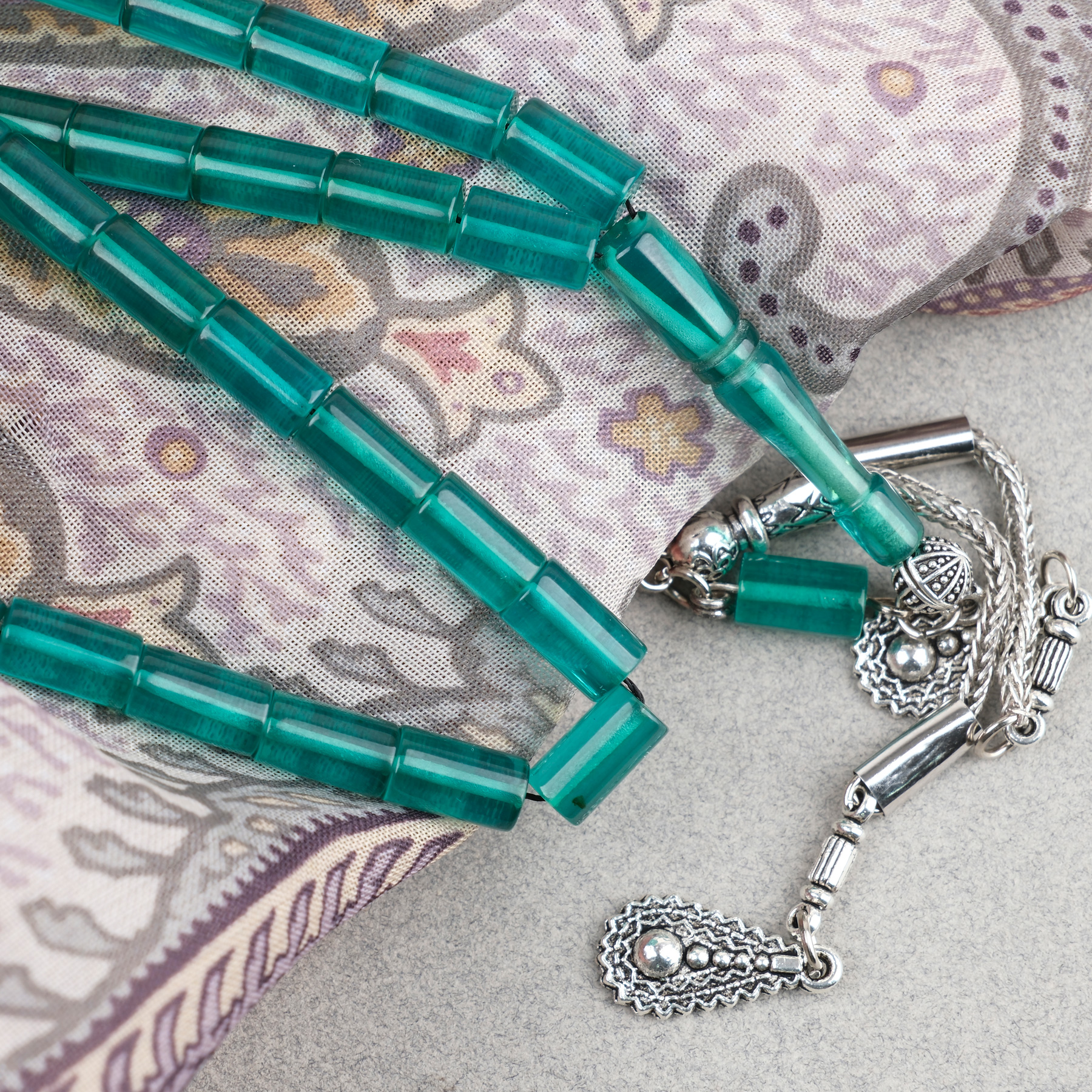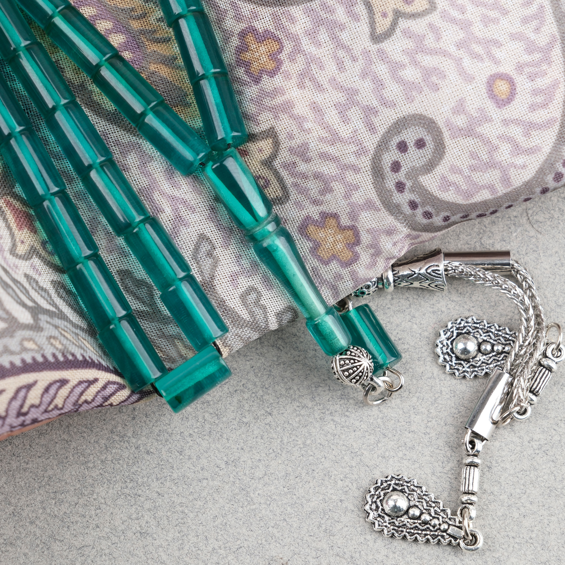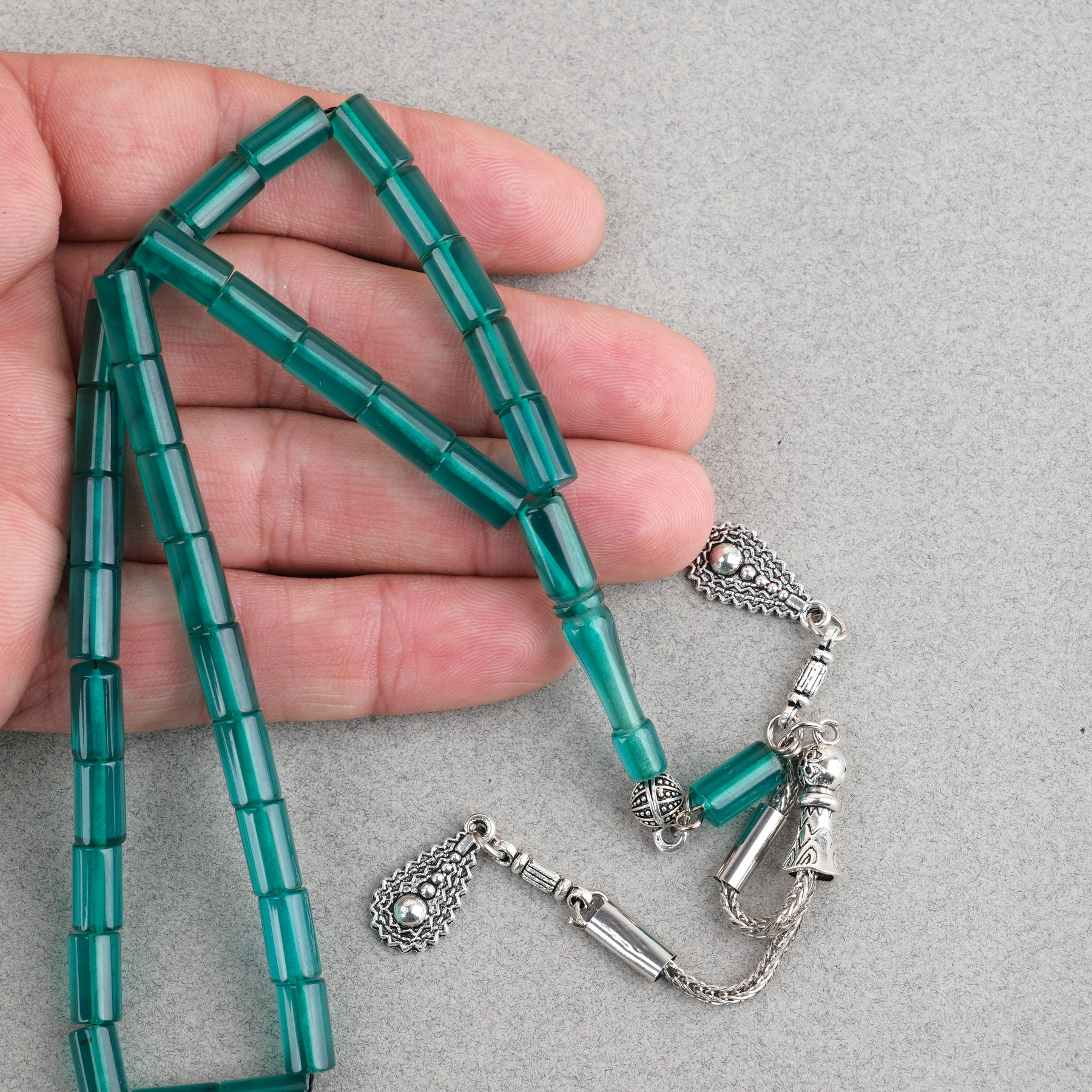 Sıkma Kehribar Kesme Kesim Alpaka Püsküllü 6x10mm Tesbih Açık Yeşil