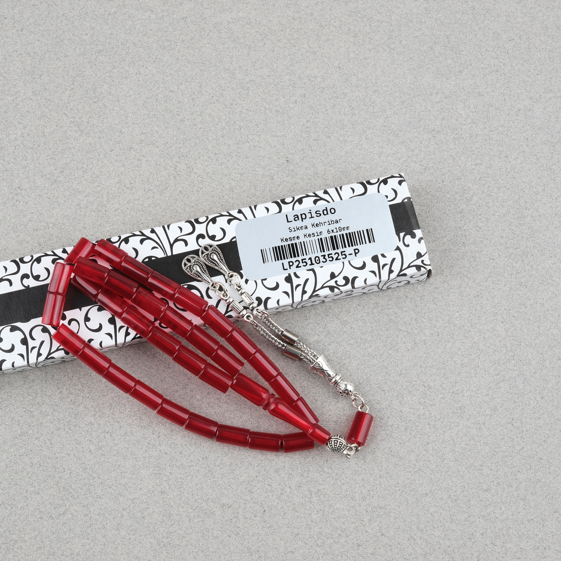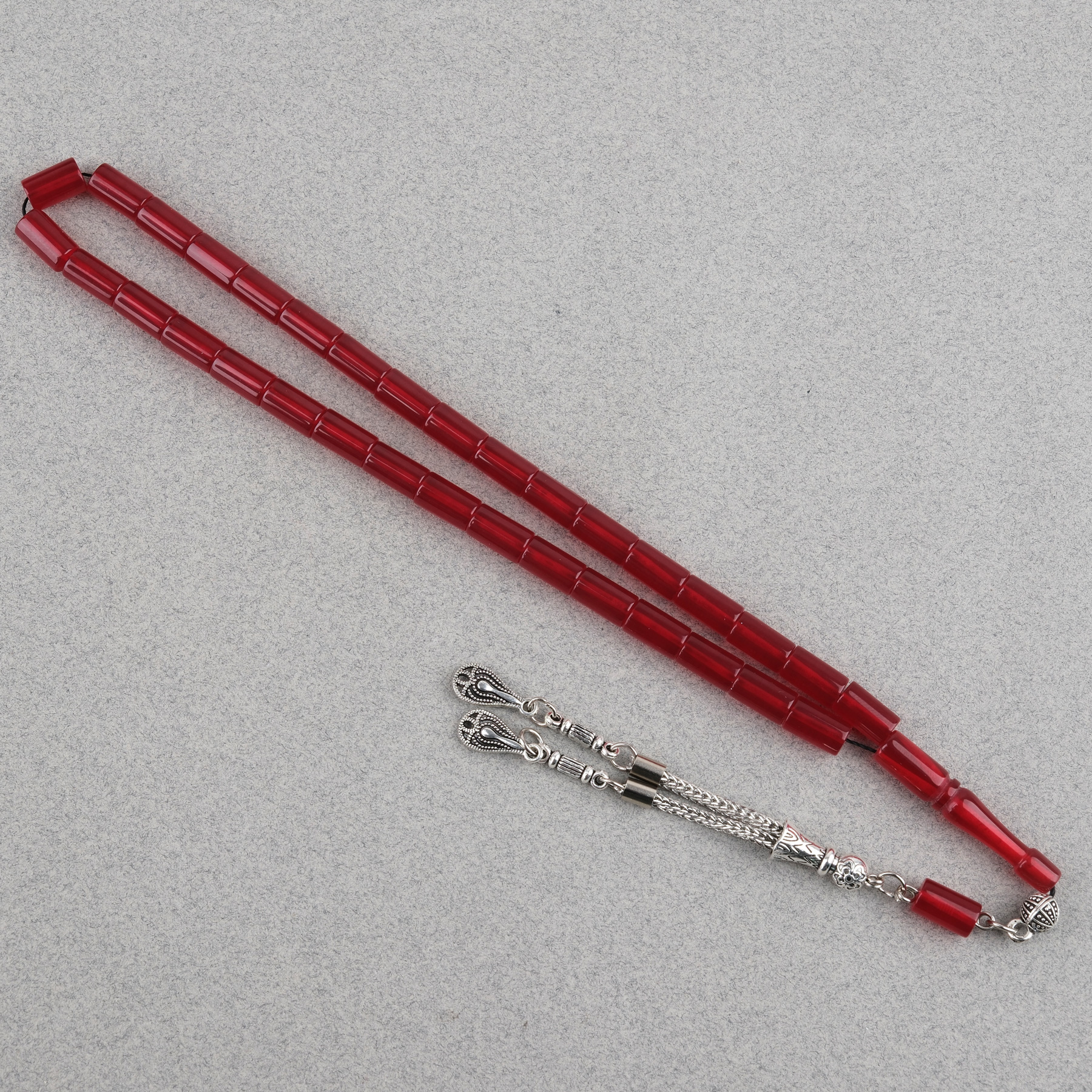 Sıkma Kehribar Kesme Kesim Alpaka Püsküllü 6x10mm Tesbih Kırmızı