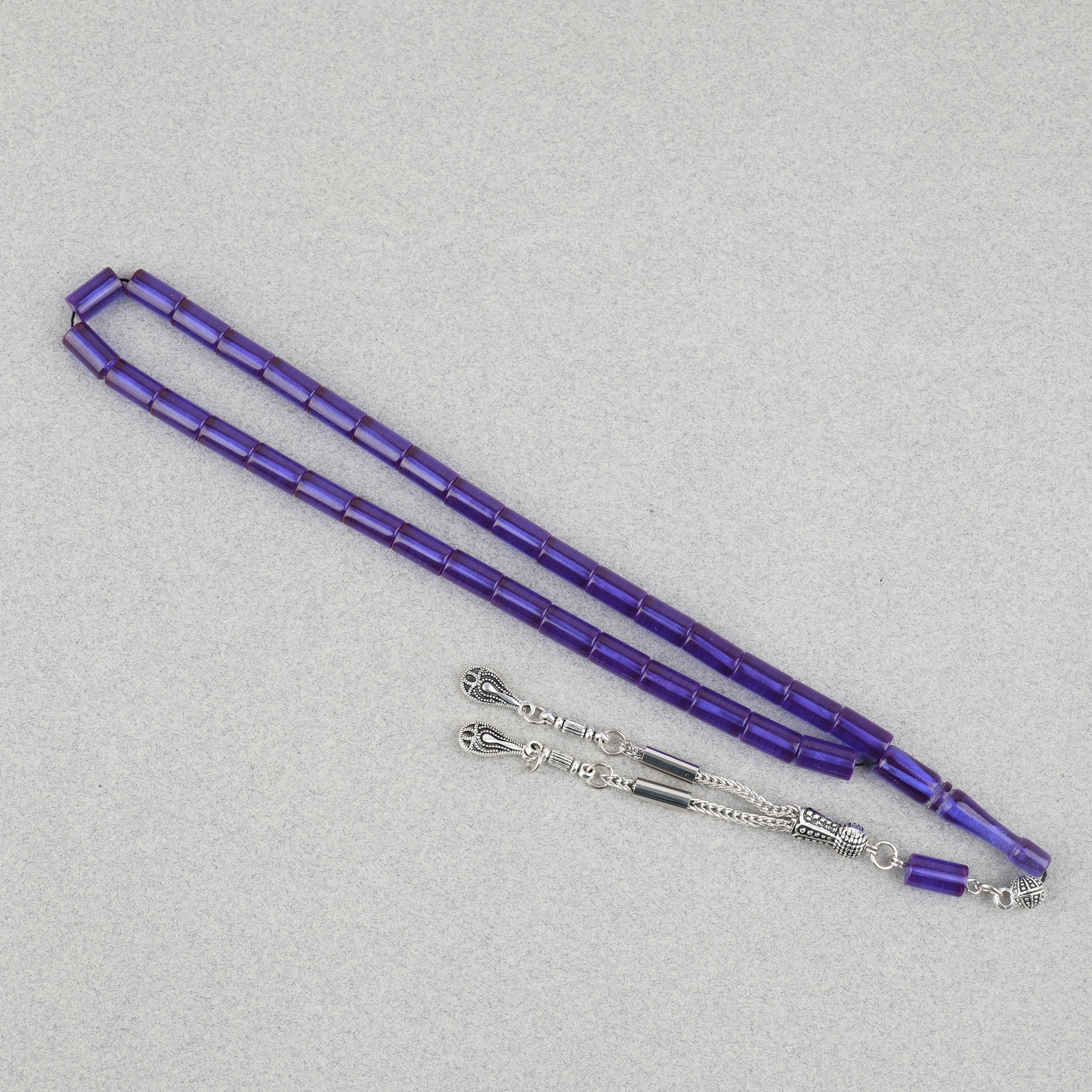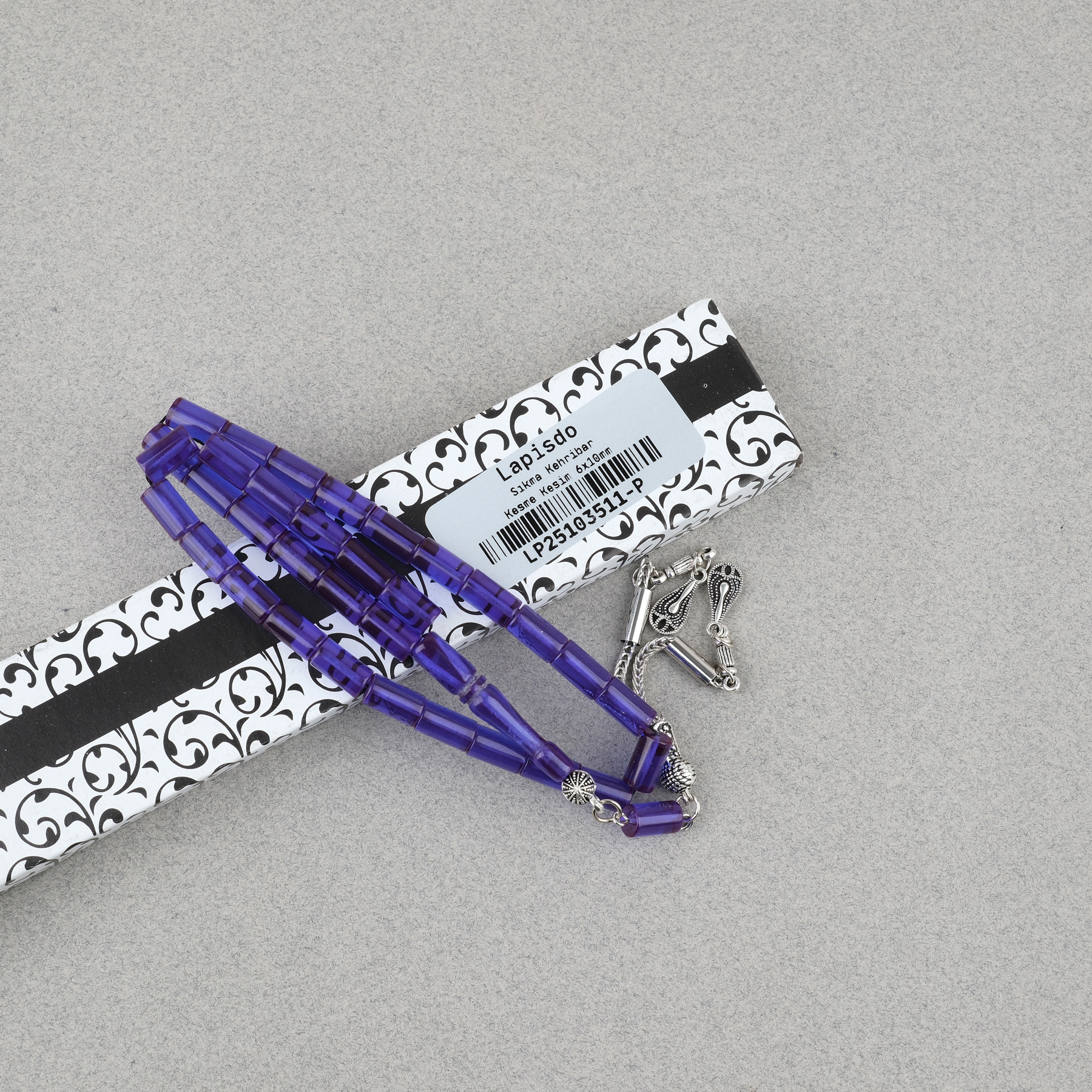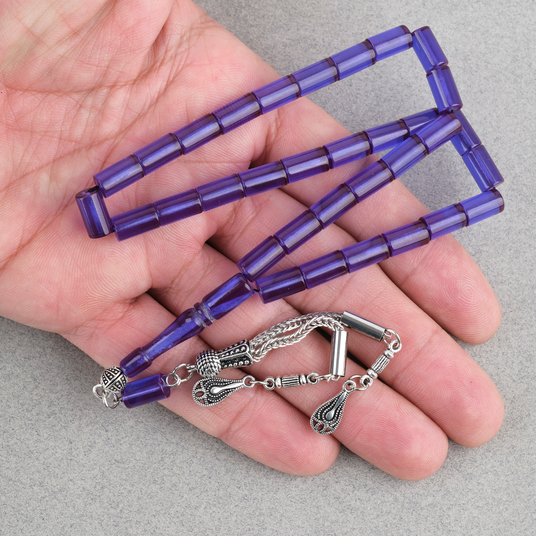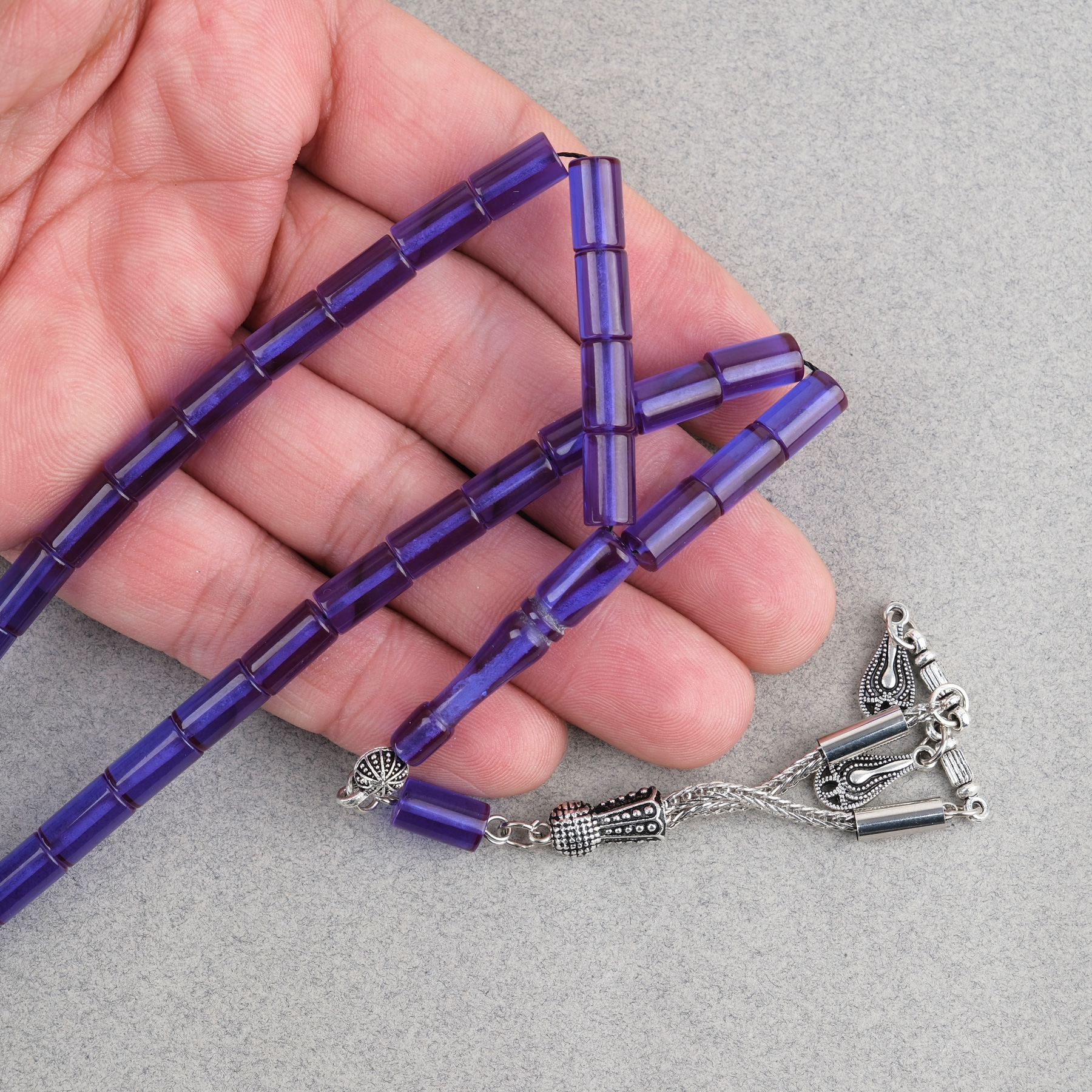 Sıkma Kehribar Kesme Kesim Alpaka Püsküllü 6x10mm Tesbih Koyu Mavi