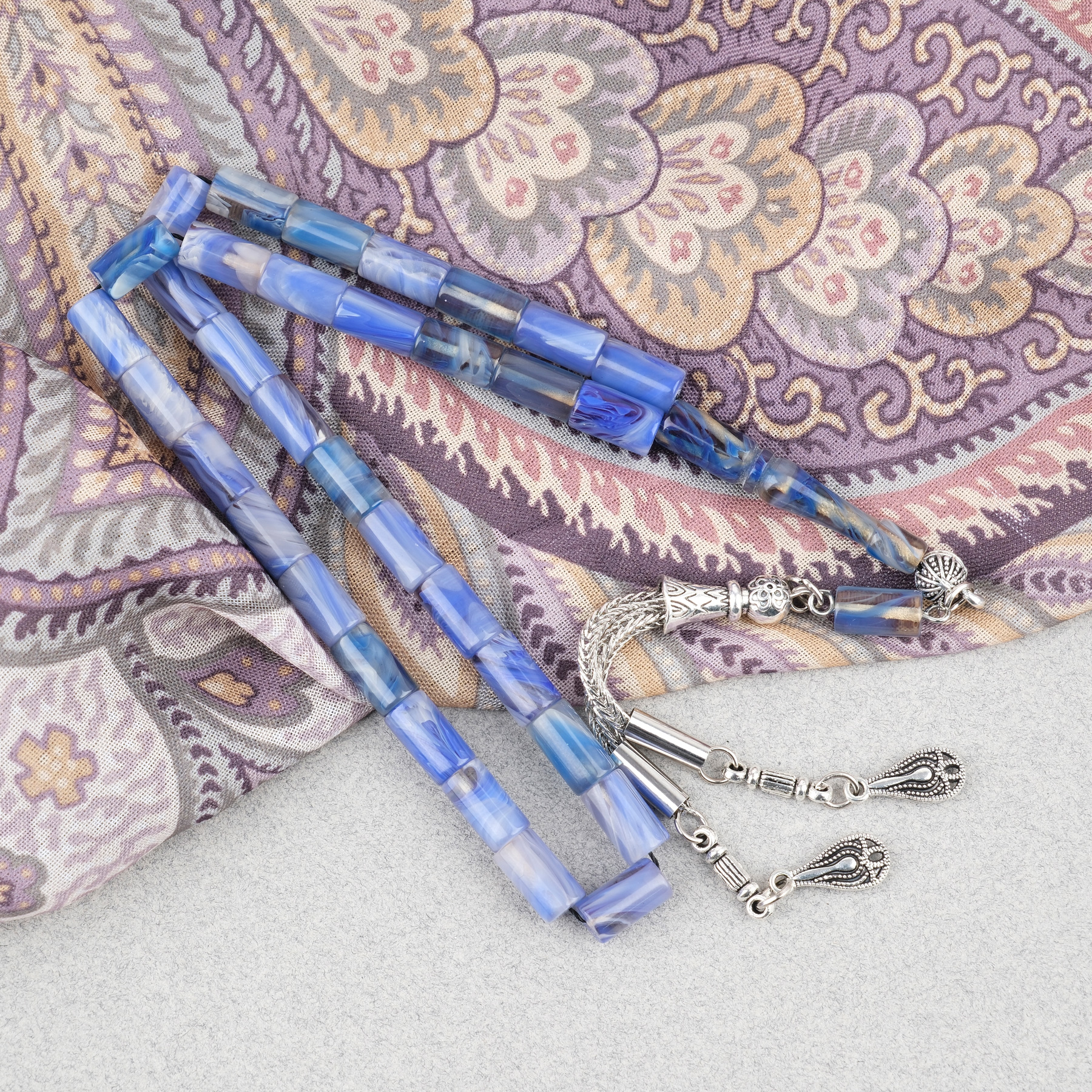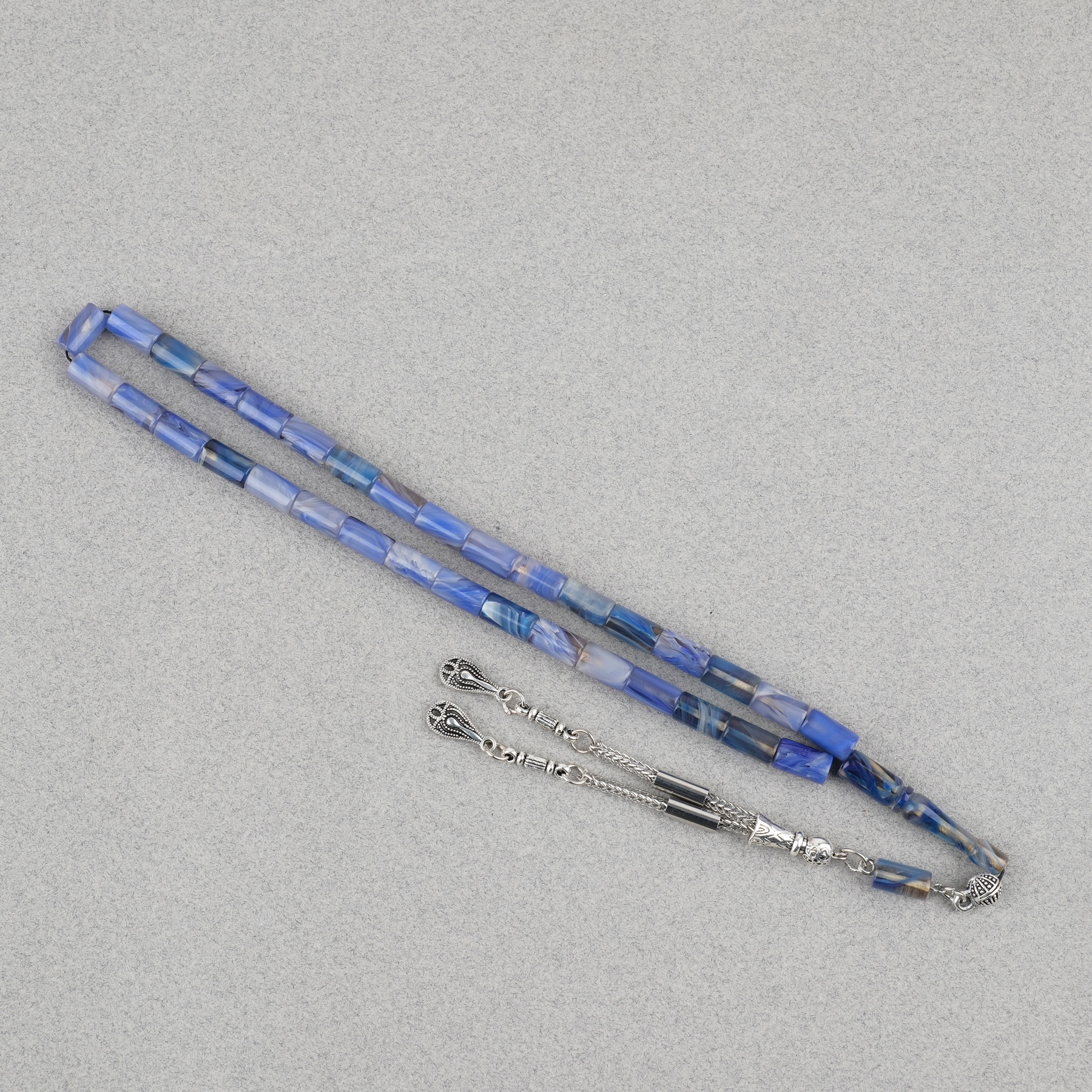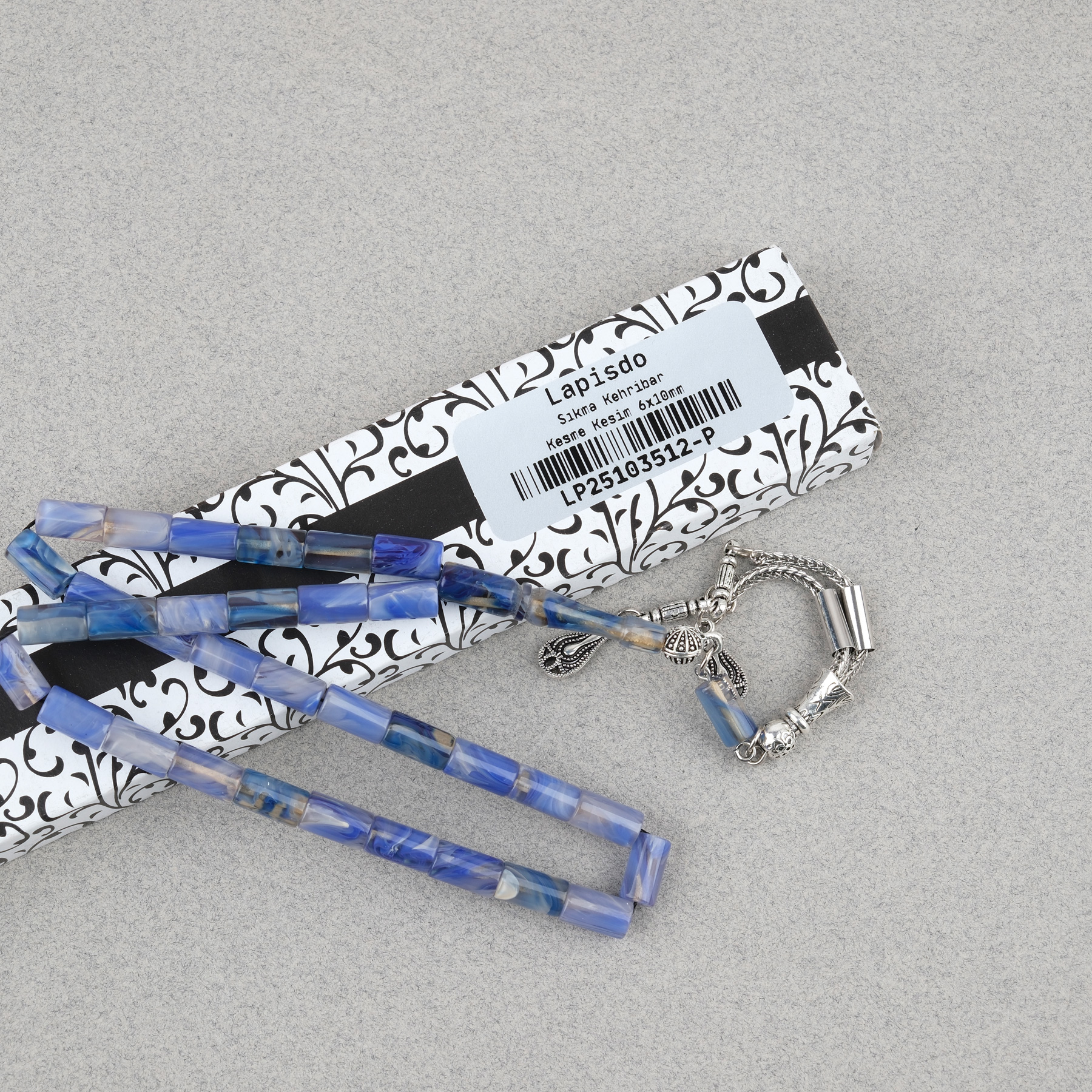 Sıkma Kehribar Kesme Kesim Alpaka Püsküllü 6x10mm Tesbih Mavi