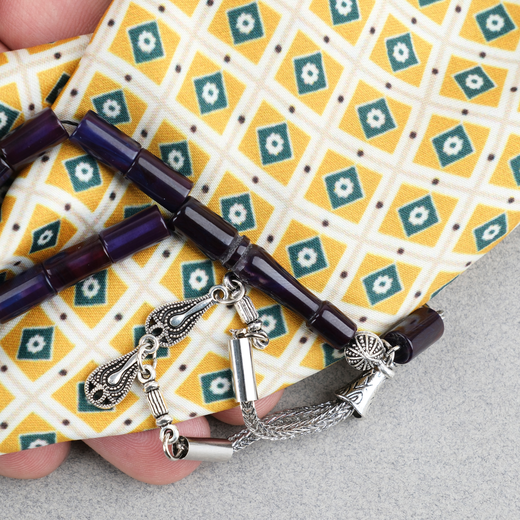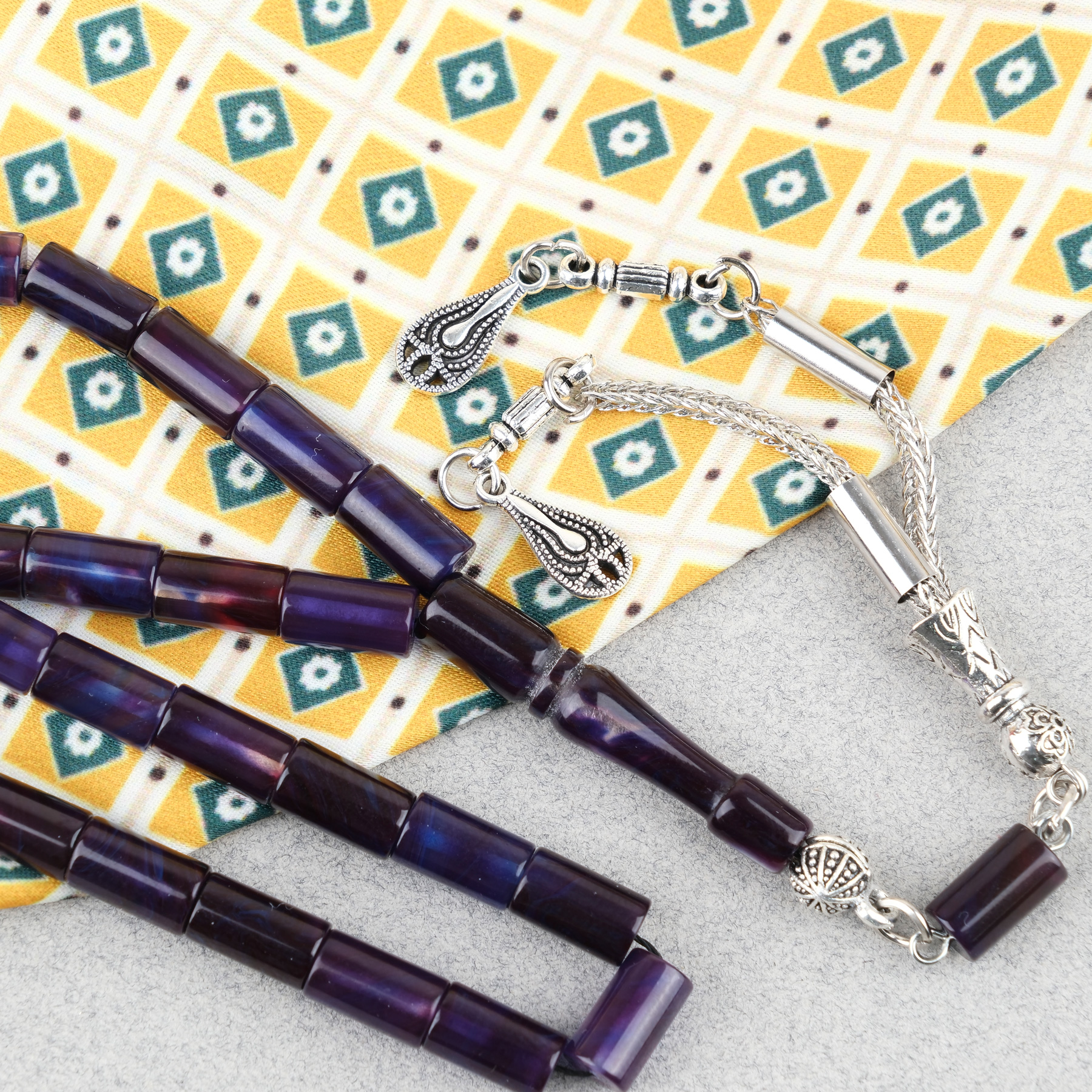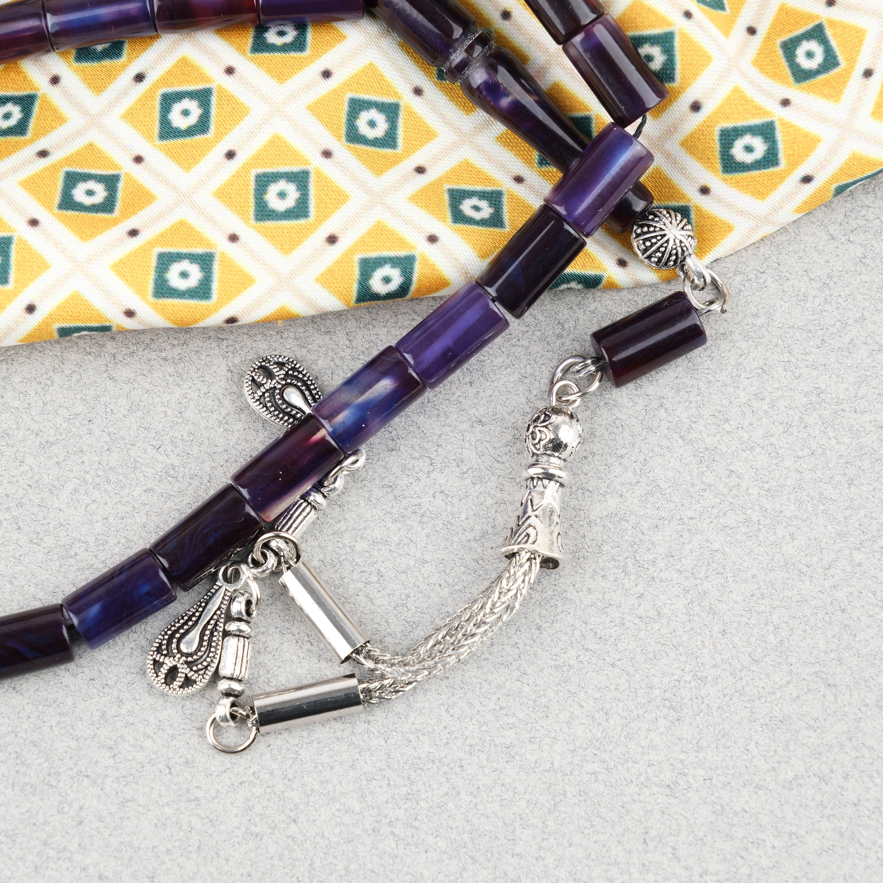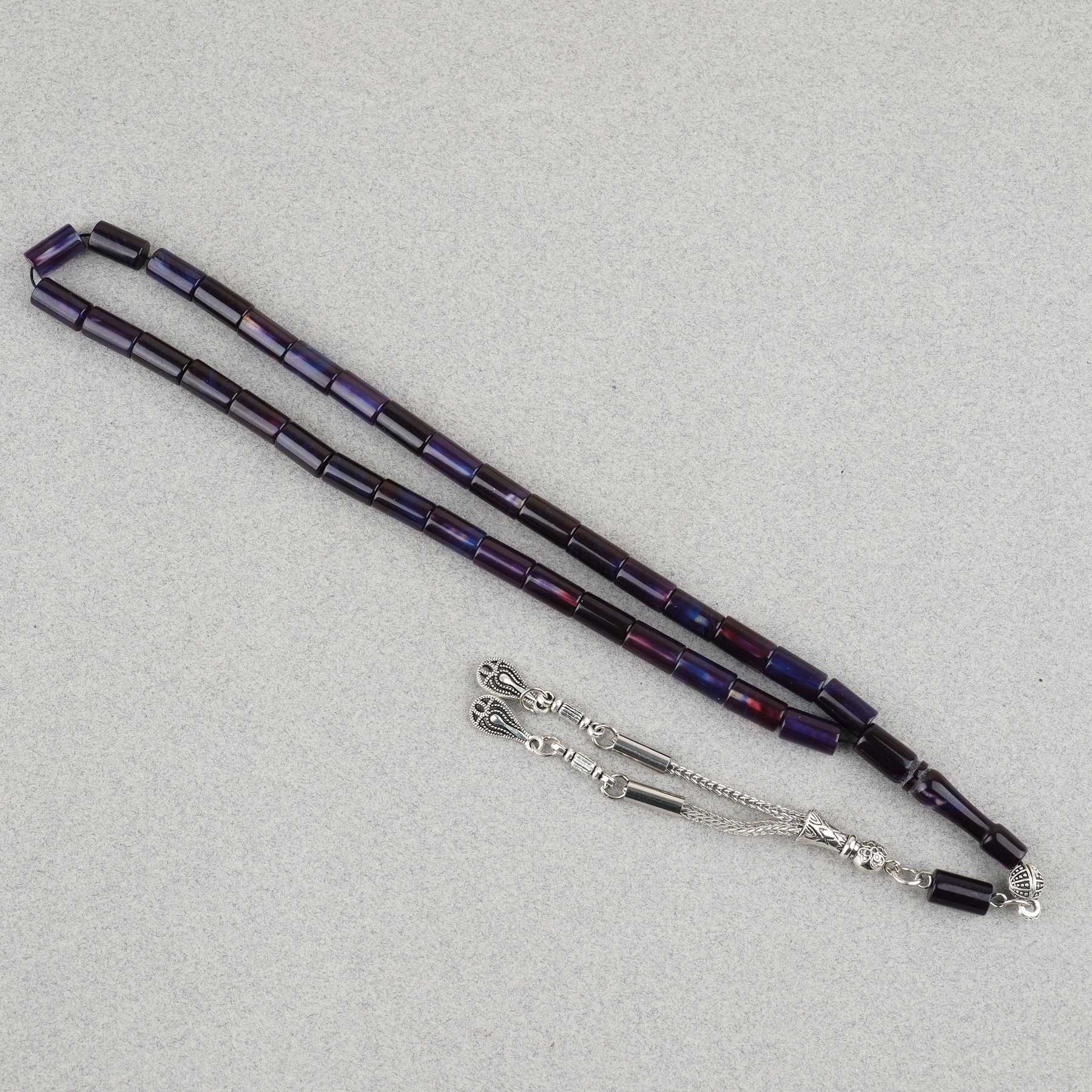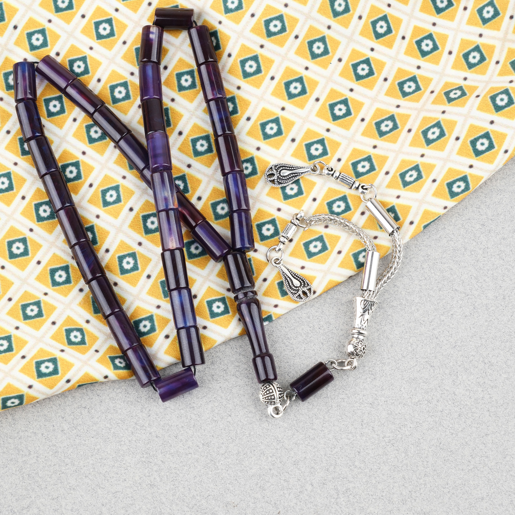 Sıkma Kehribar Kesme Kesim Alpaka Püsküllü 6x10mm Tesbih Mor