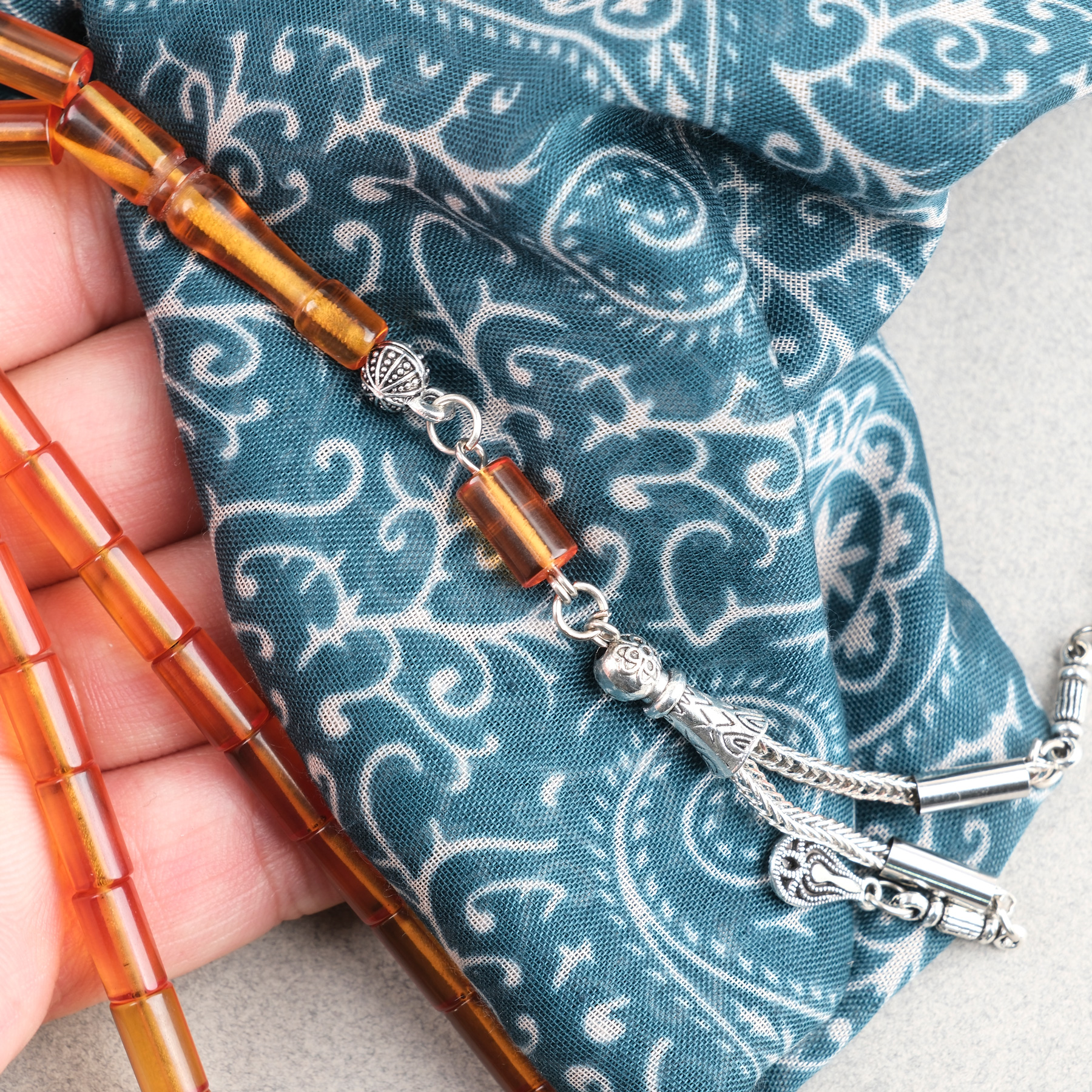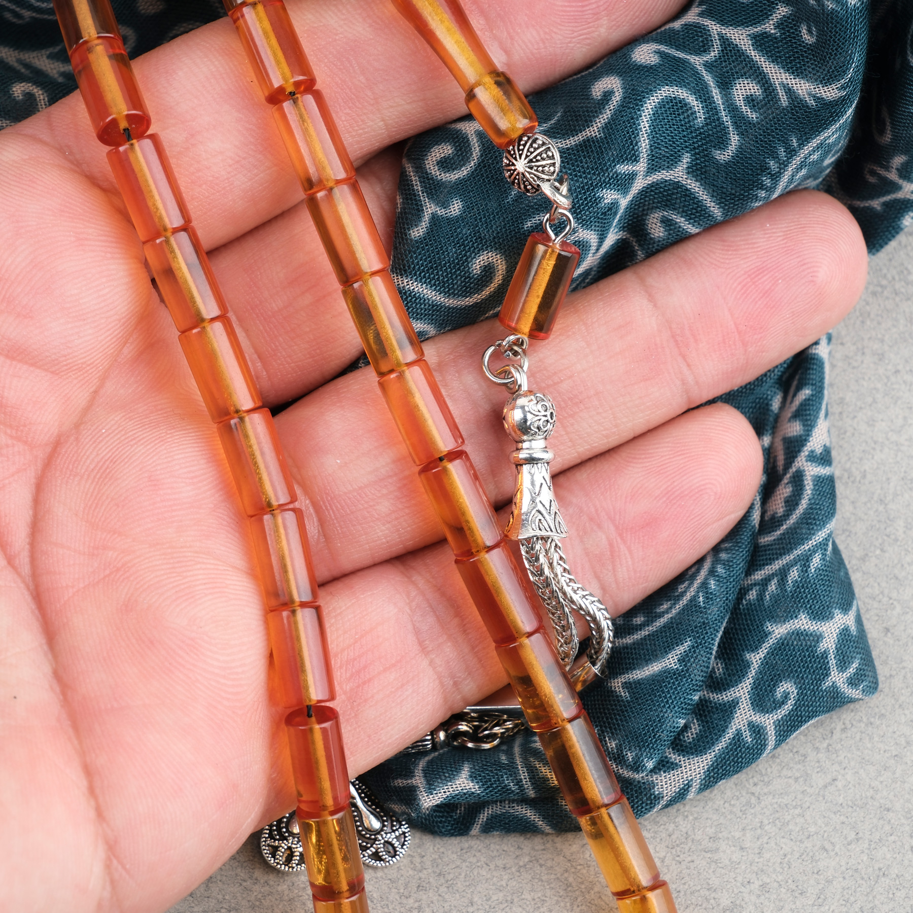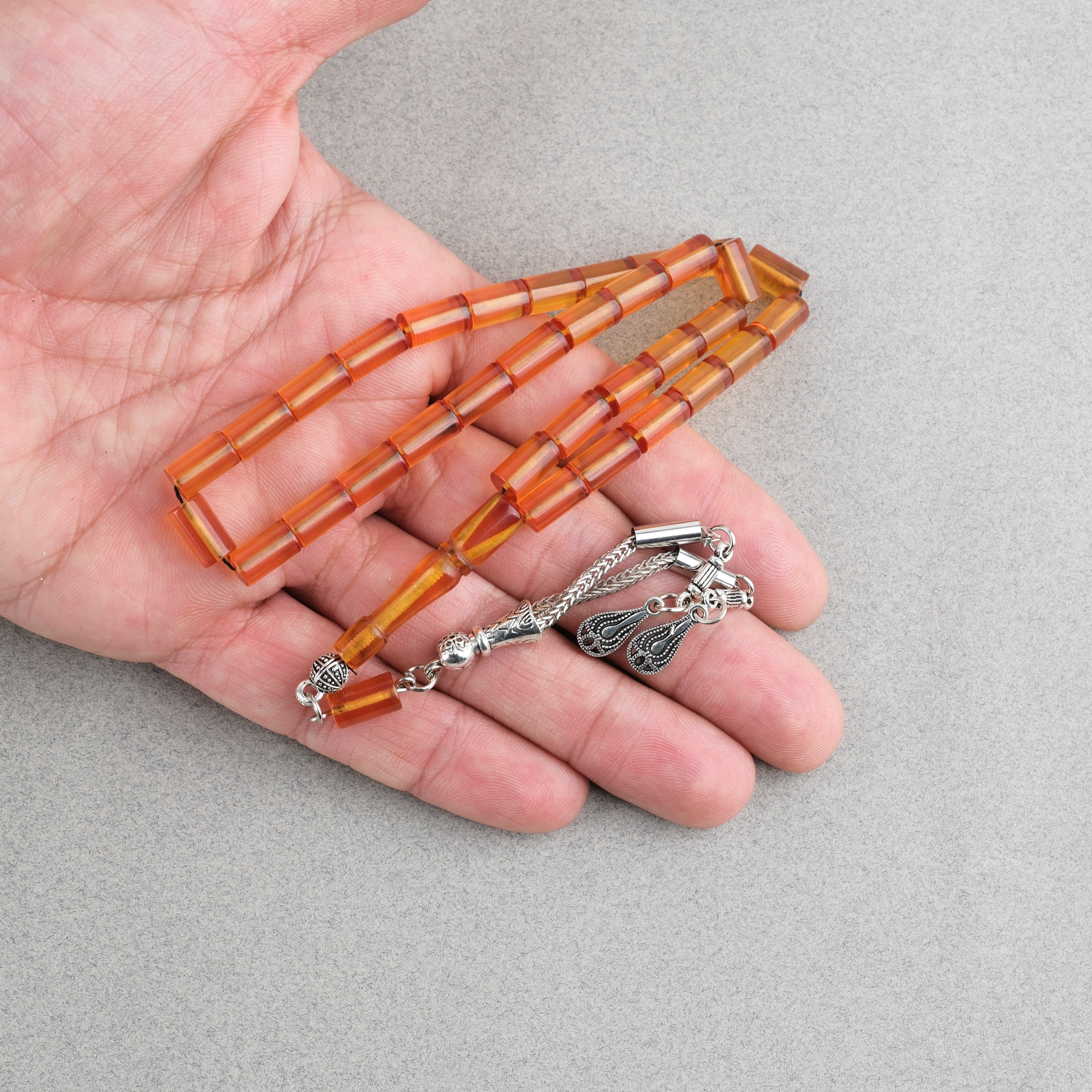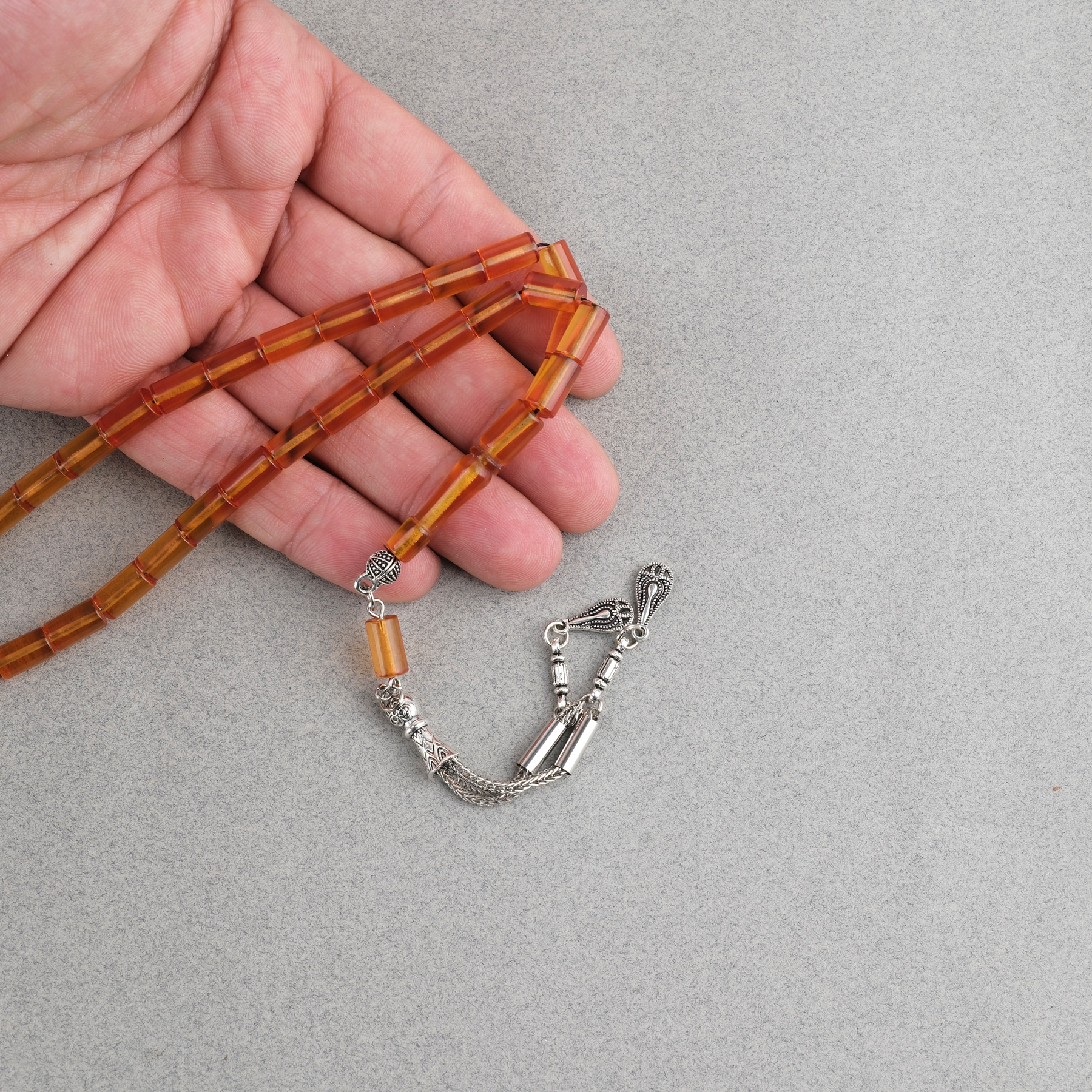 Sıkma Kehribar Kesme Kesim Alpaka Püsküllü 6x10mm Tesbih Turuncu