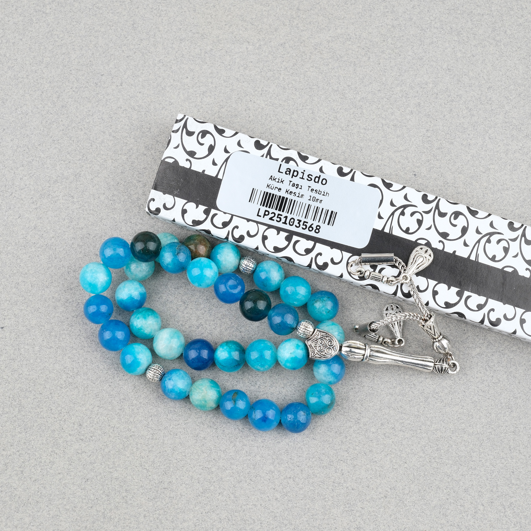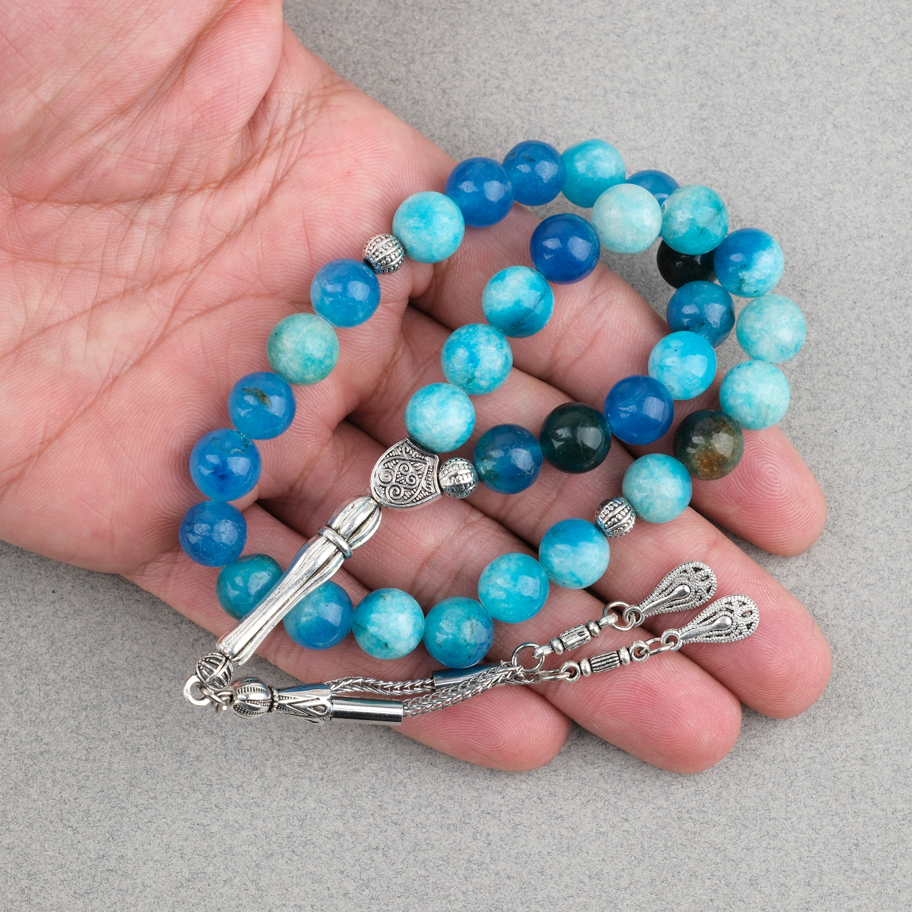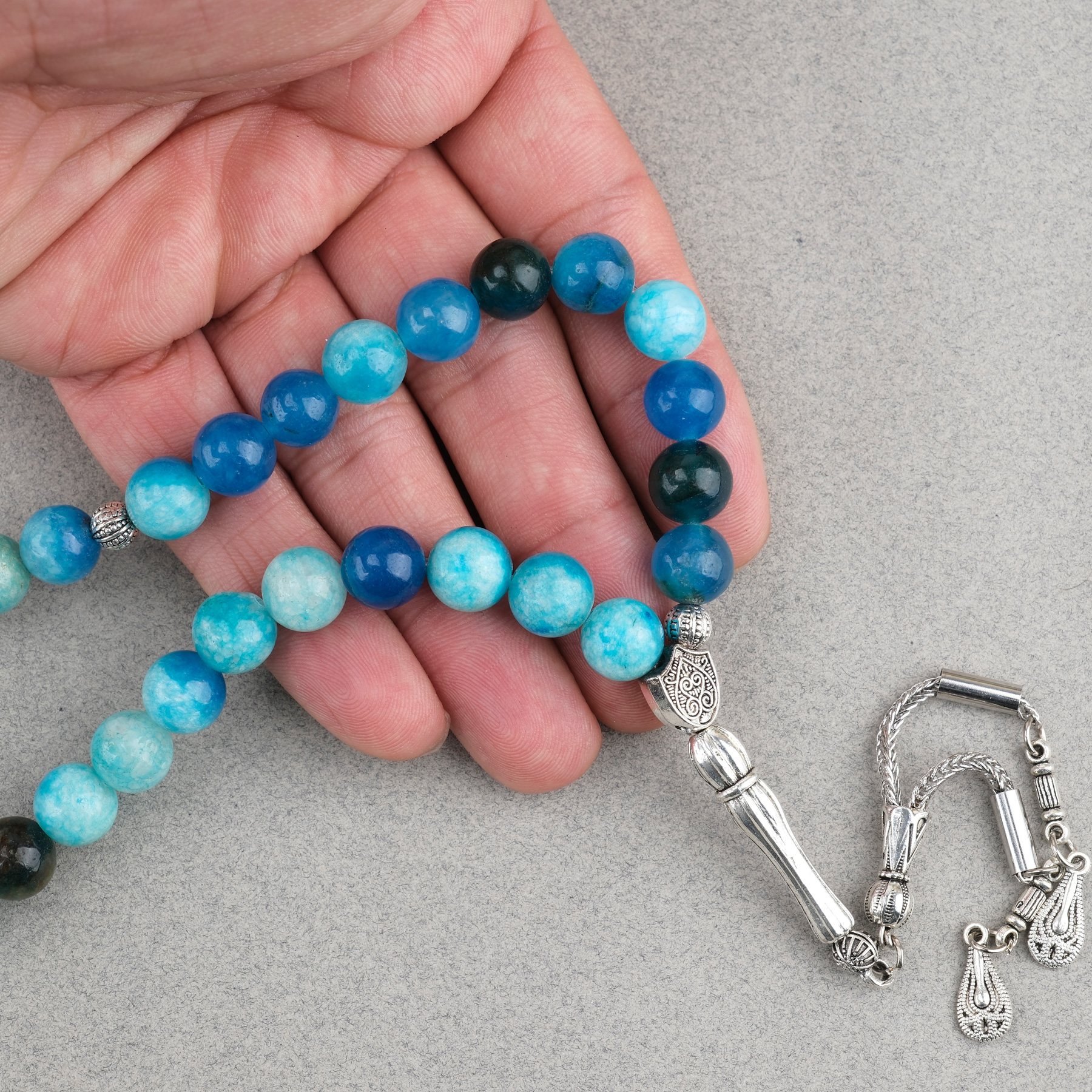 Akik Taşı Küre Kesim 10mm Tesbih Alpaka Püsküllü Turkuaz Mavi