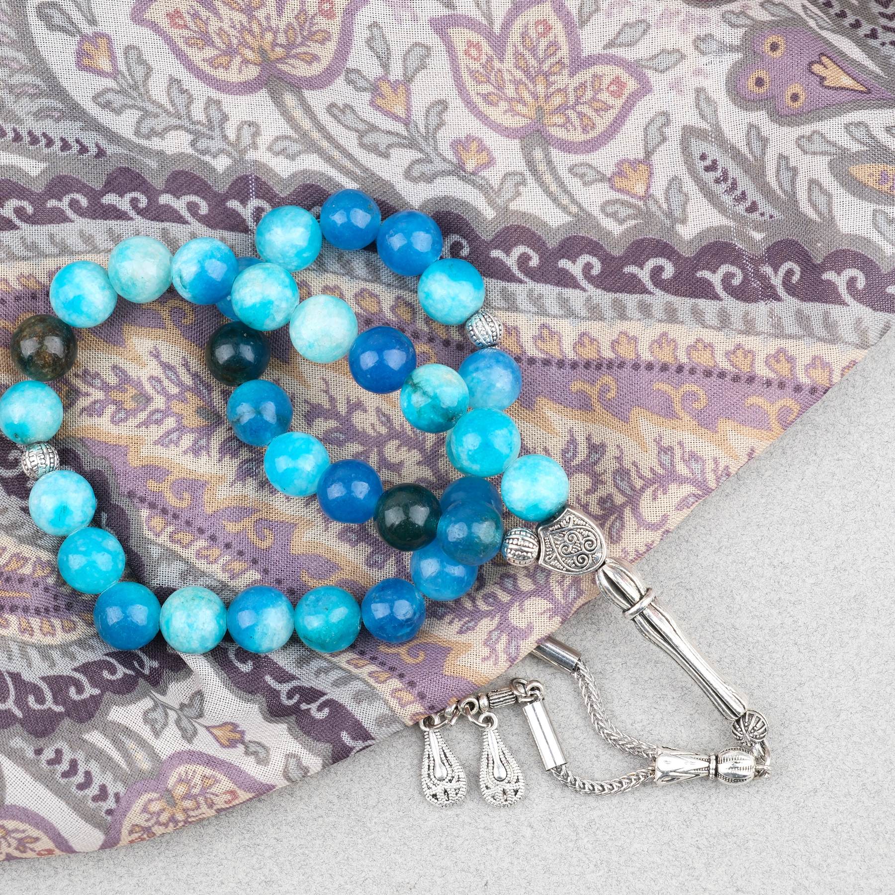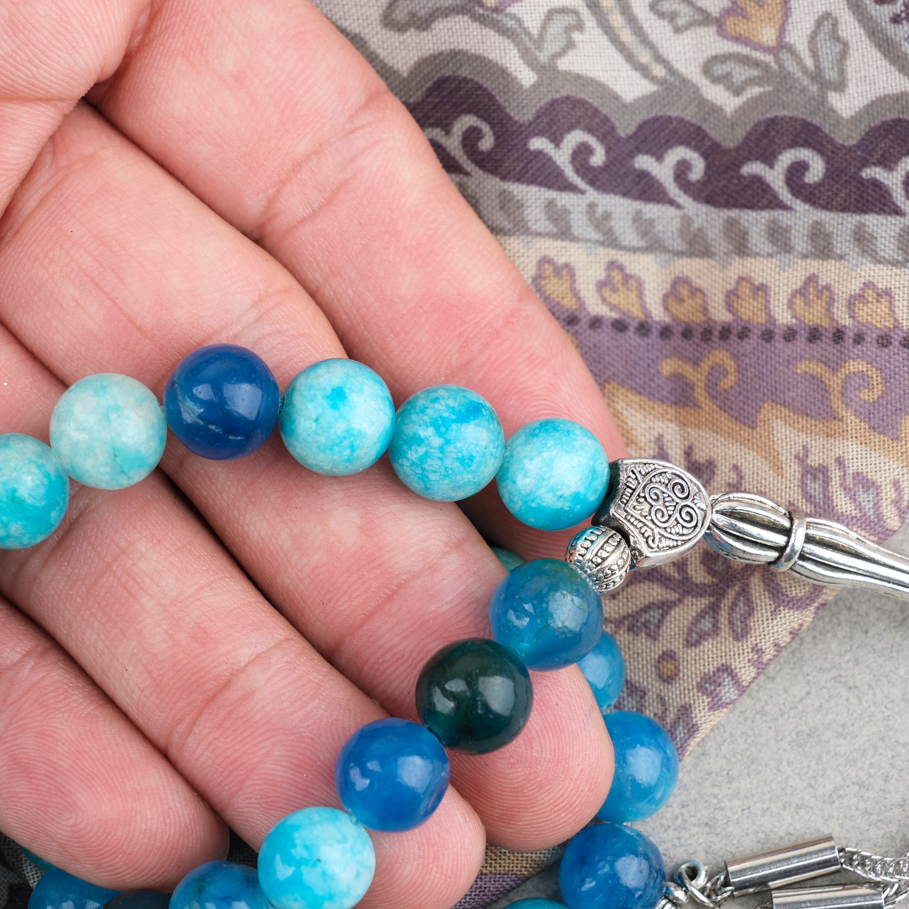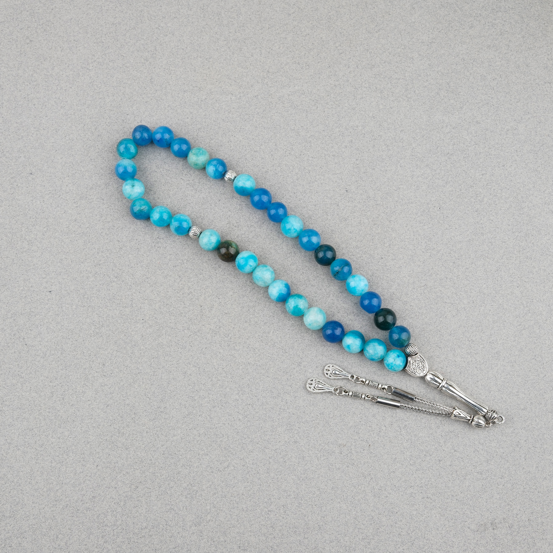 Akik Taşı Küre Kesim 10mm Tesbih Alpaka Püsküllü Turkuaz Mavi