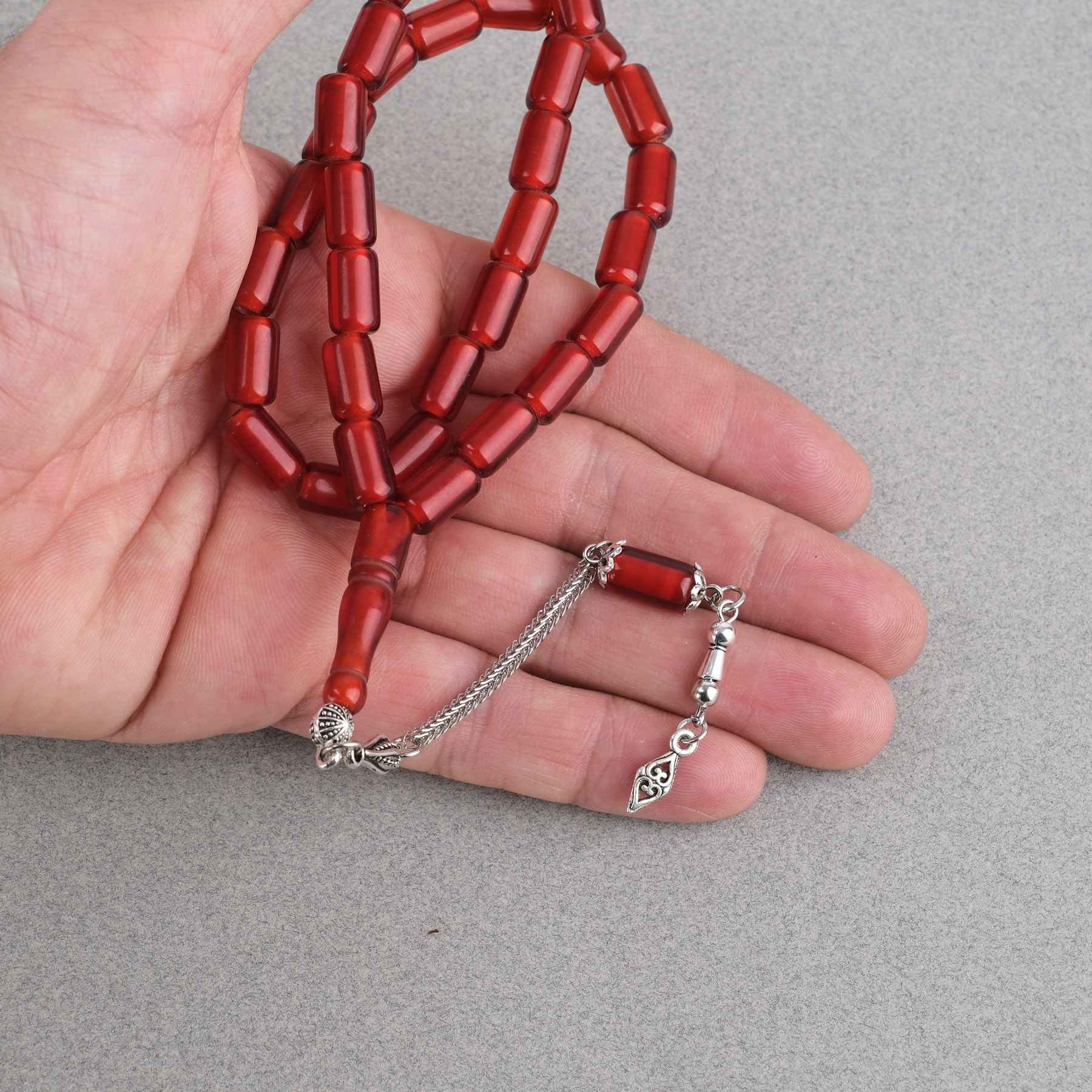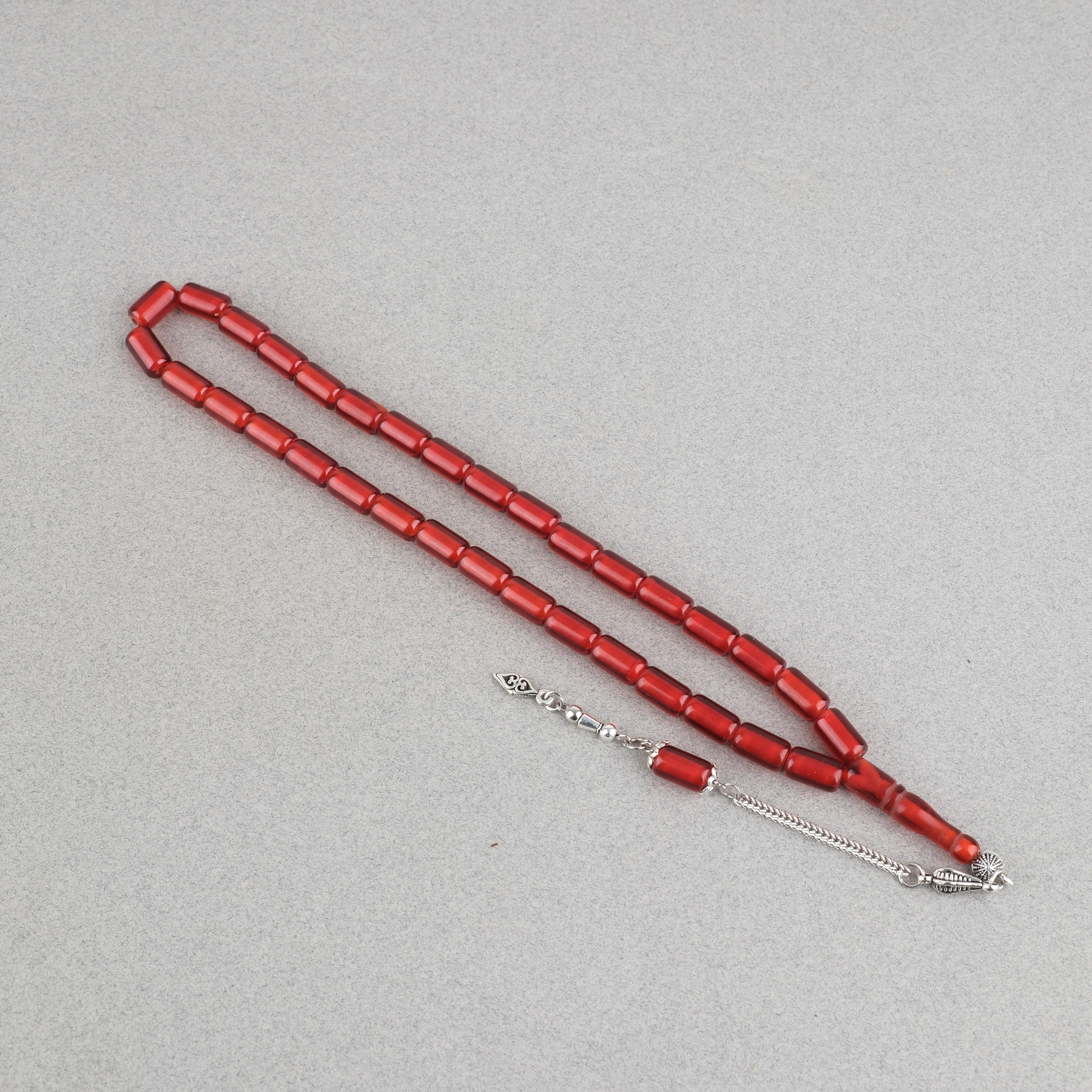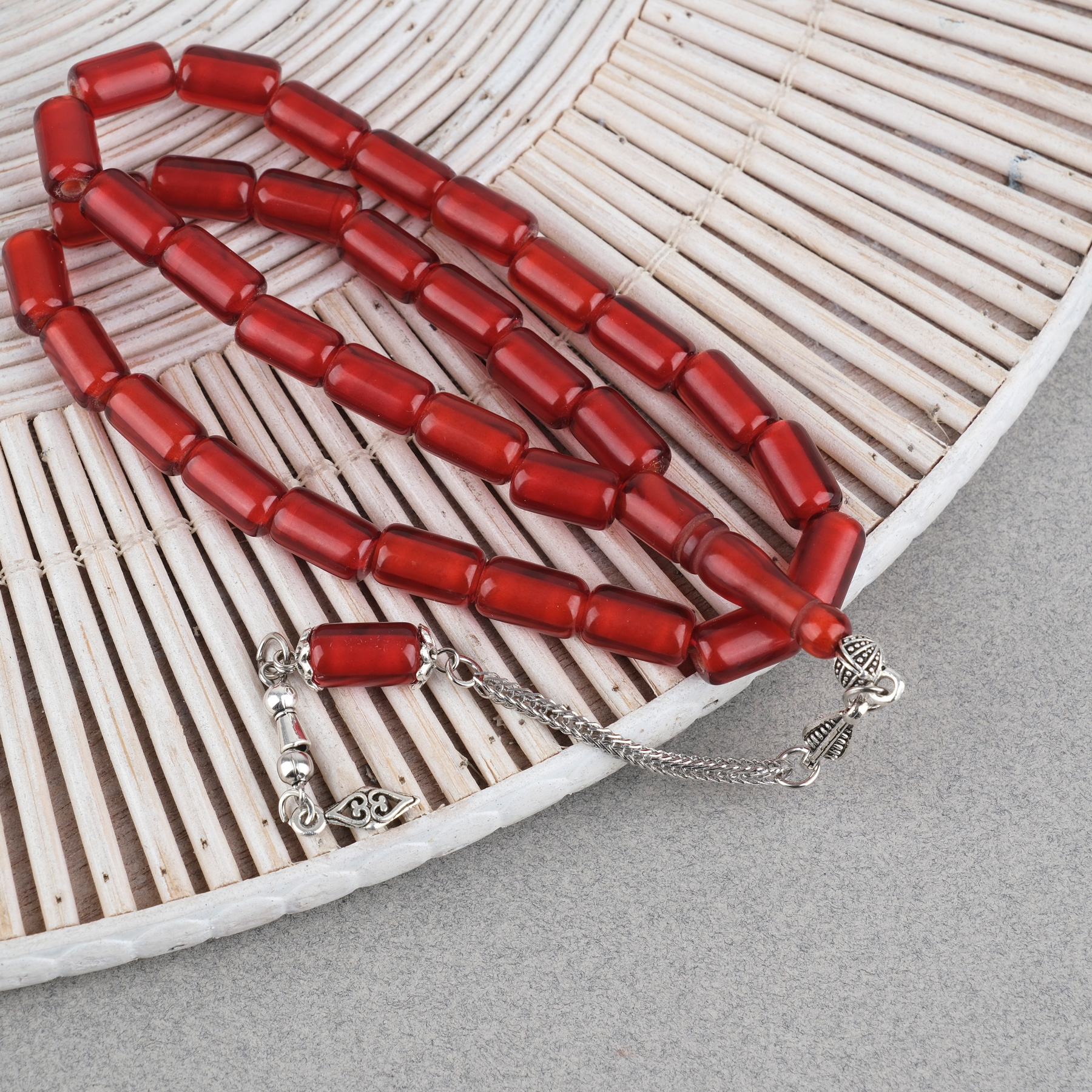 Ateş Kehribar Alpaka Püsküllü Kapsül Kesim 7x12mm Tesbih - Şeffaf Bordo