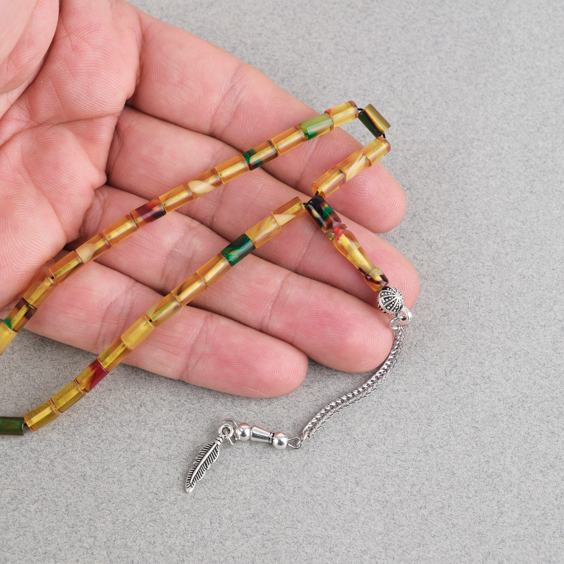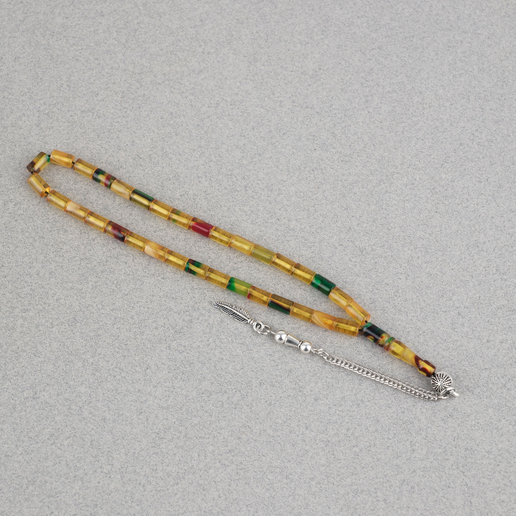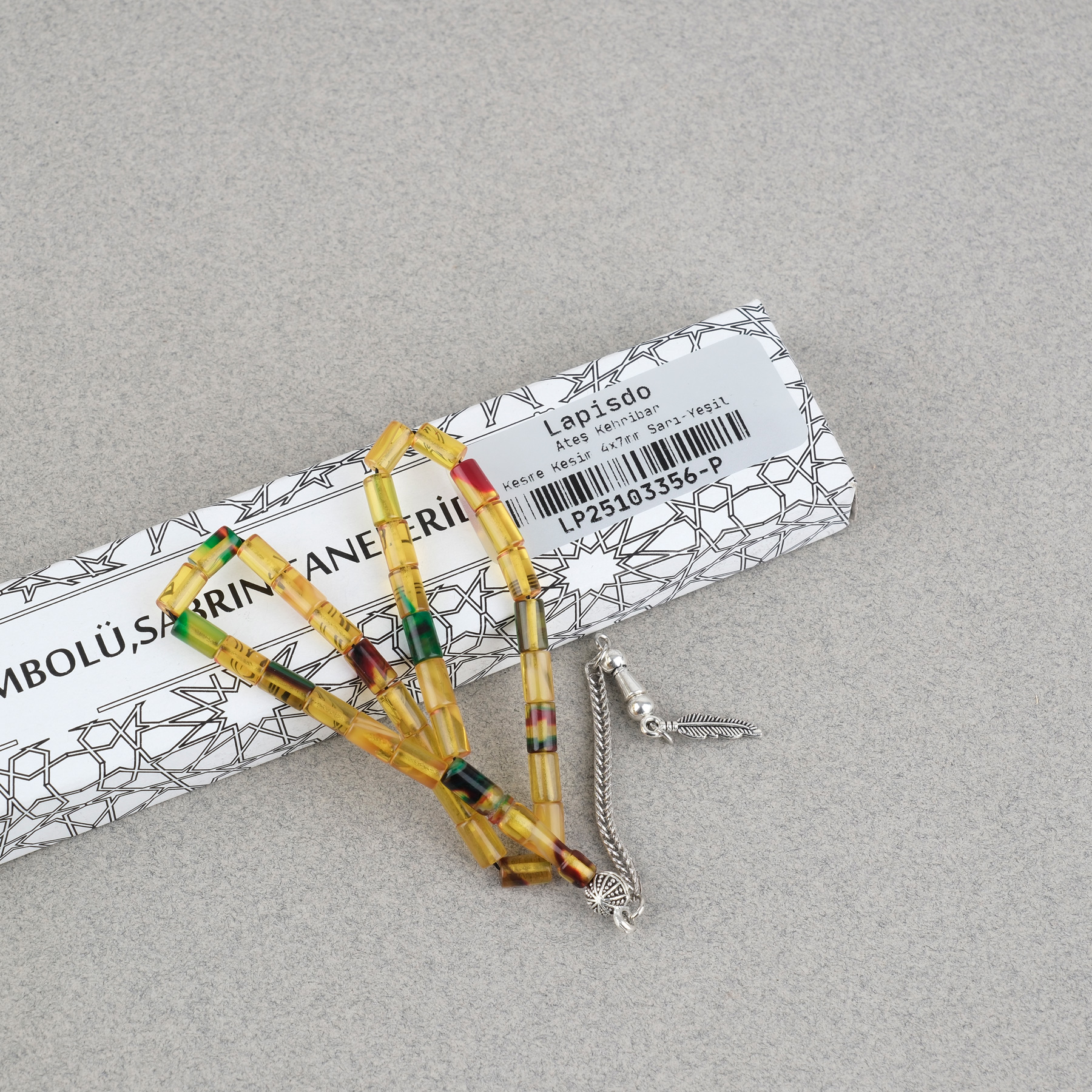 Ateş Kehribar Alpaka Püsküllü Kesme Kesim 4x7mm Tesbih- Sarı-Yeşil