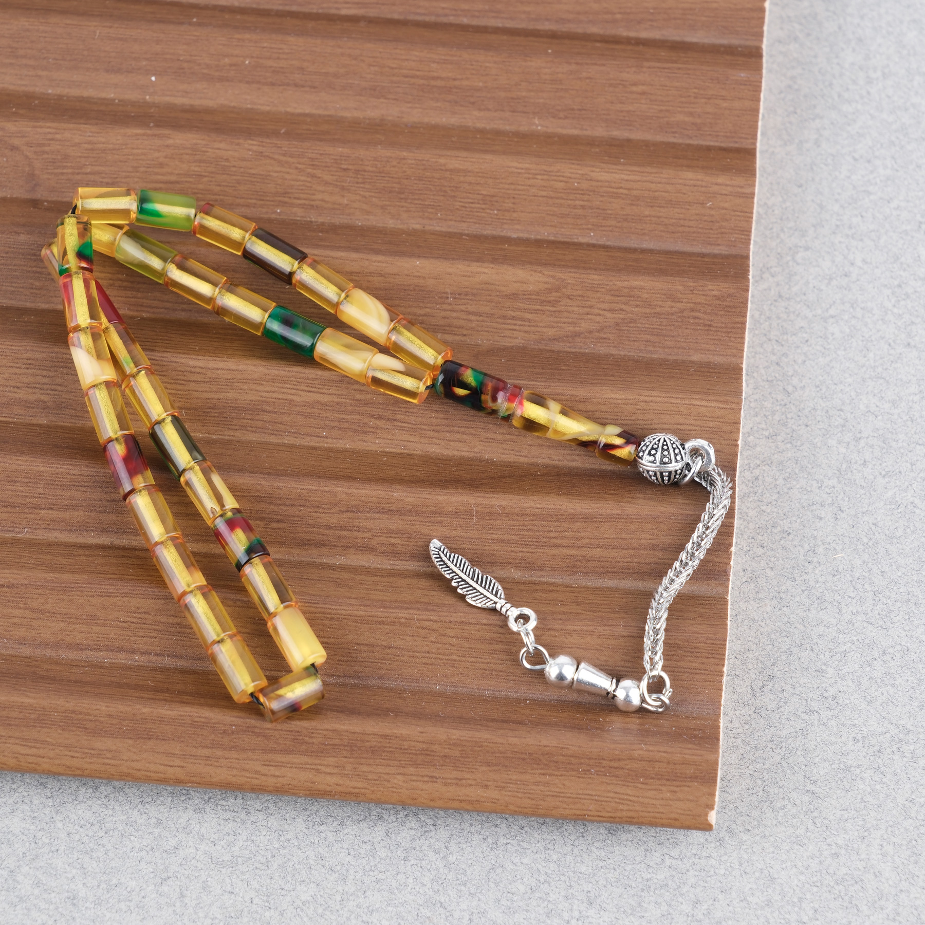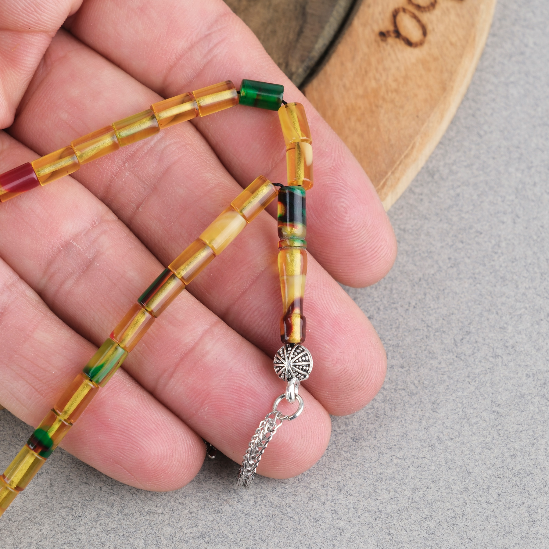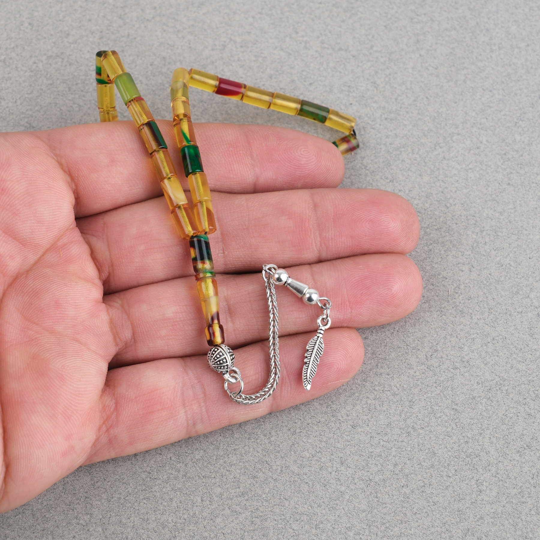 Ateş Kehribar Alpaka Püsküllü Kesme Kesim 4x7mm Tesbih- Sarı-Yeşil