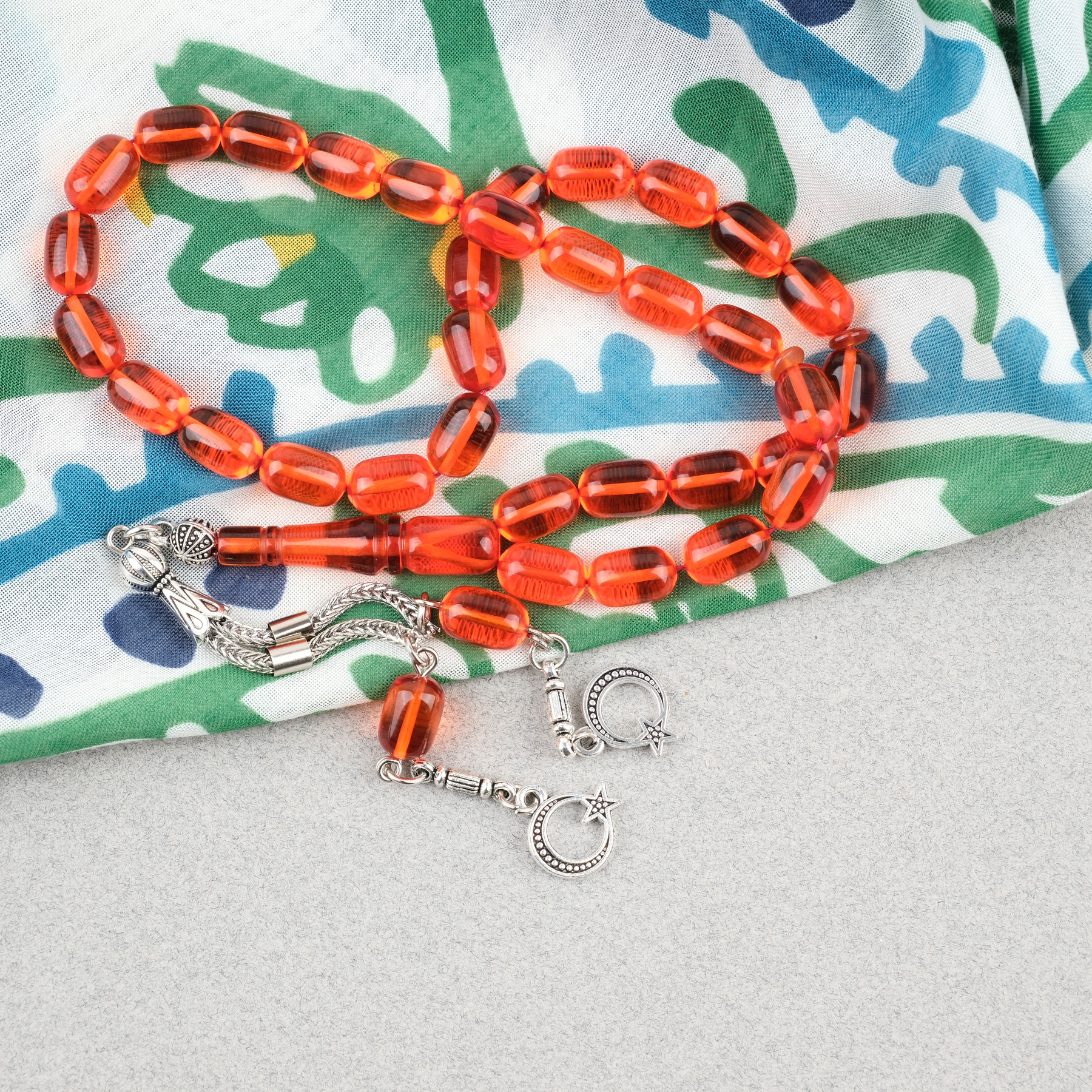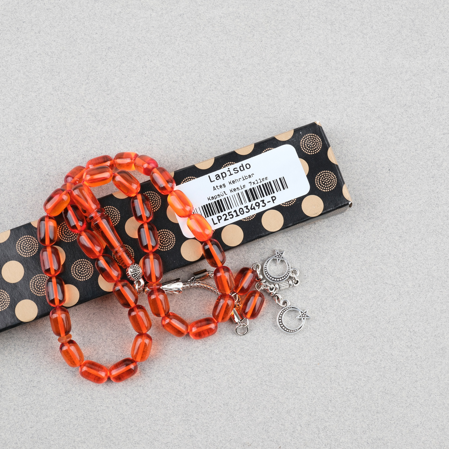 Ateş Kehribar Kapsül Kesim Alpaka Püsküllü 7x11mm Tesbih