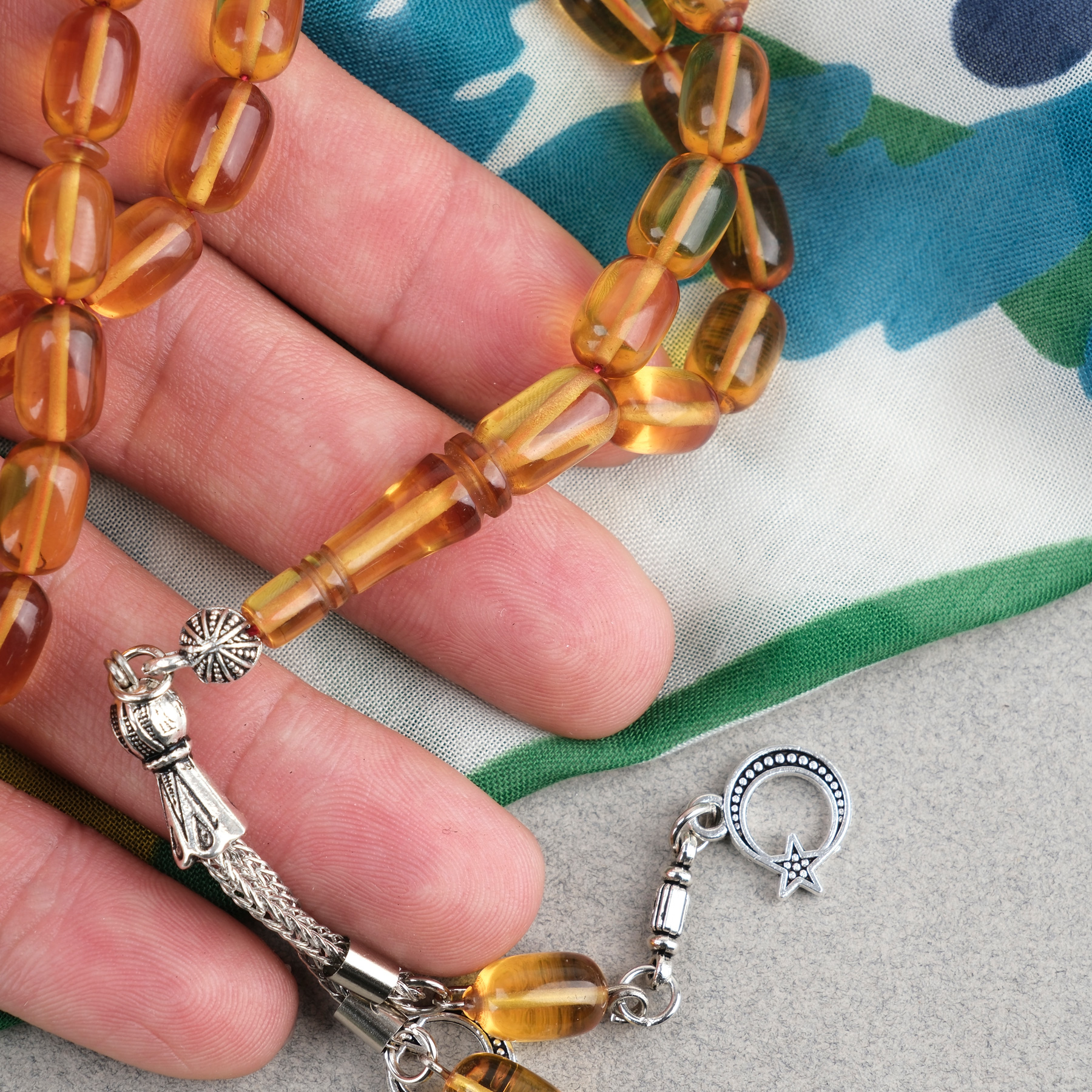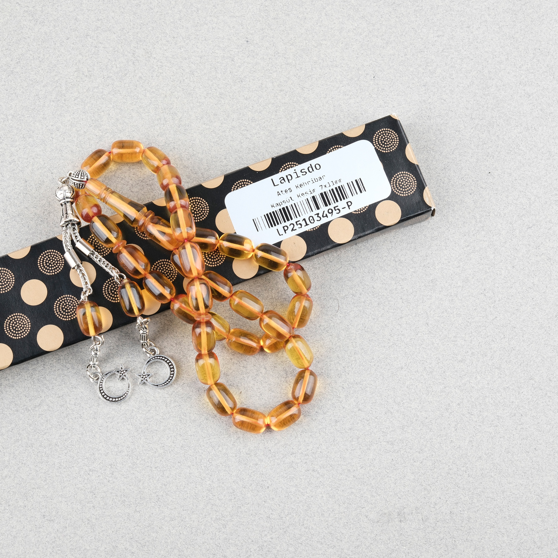 Ateş Kehribar Kapsül Kesim Alpaka Püsküllü 7x11mm Tesbih