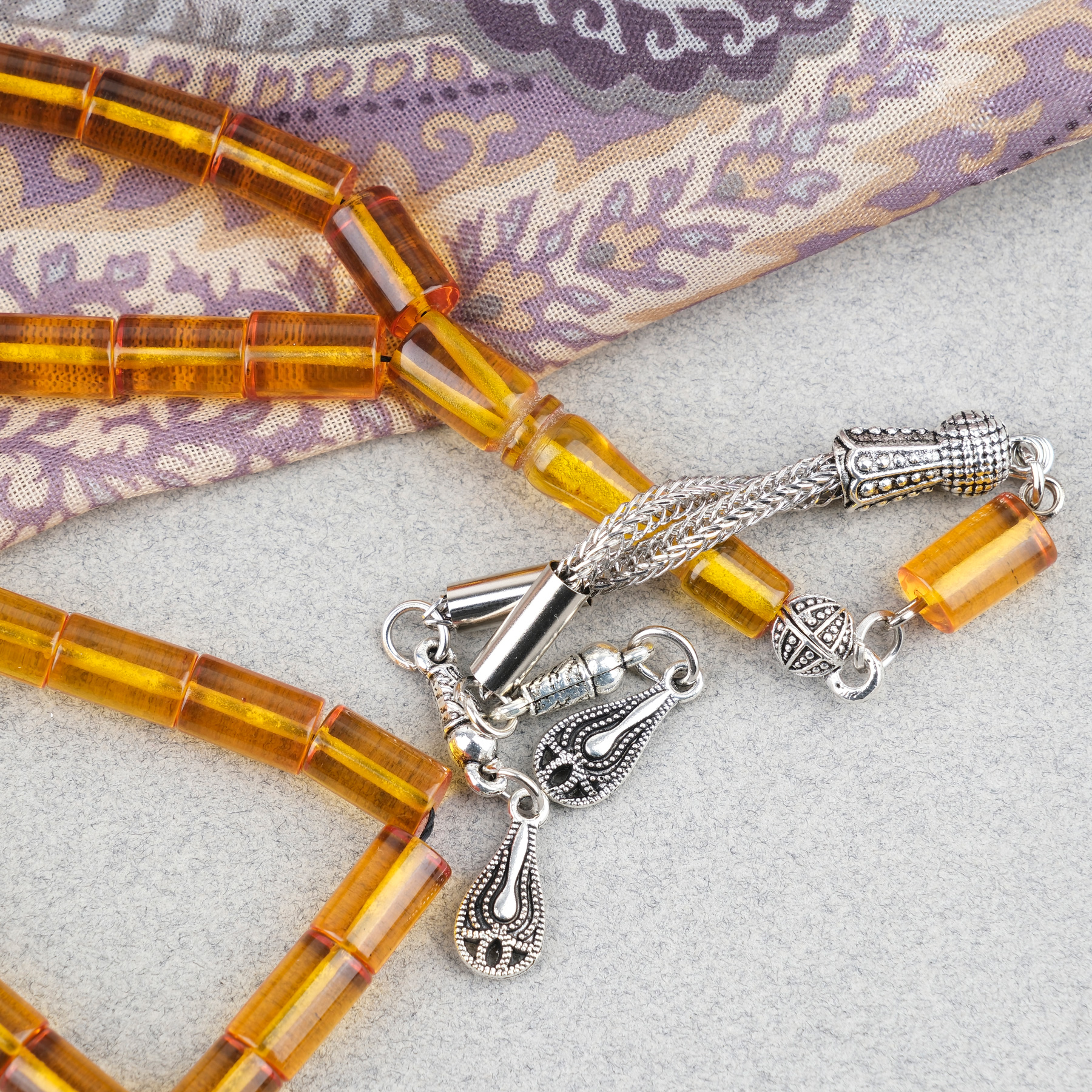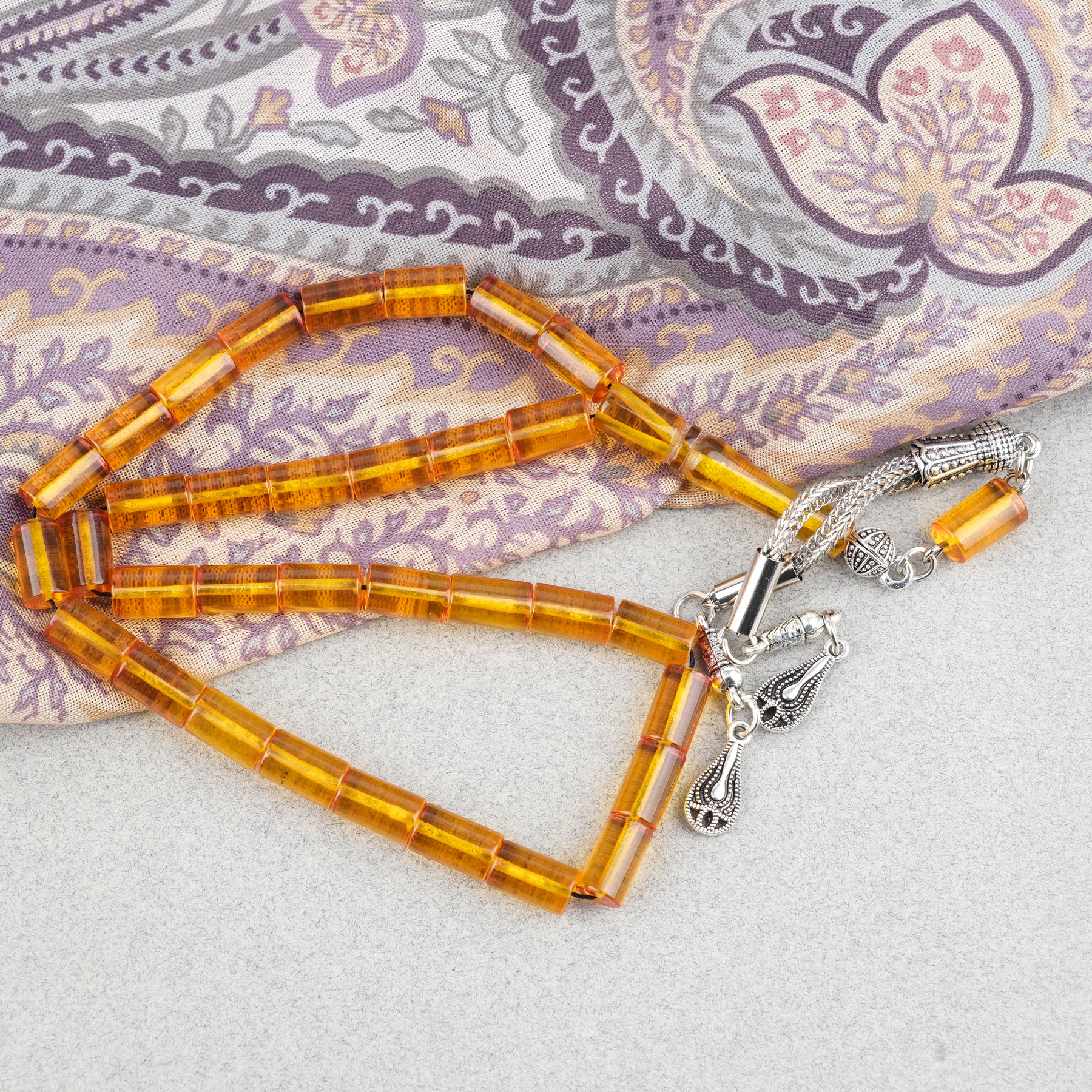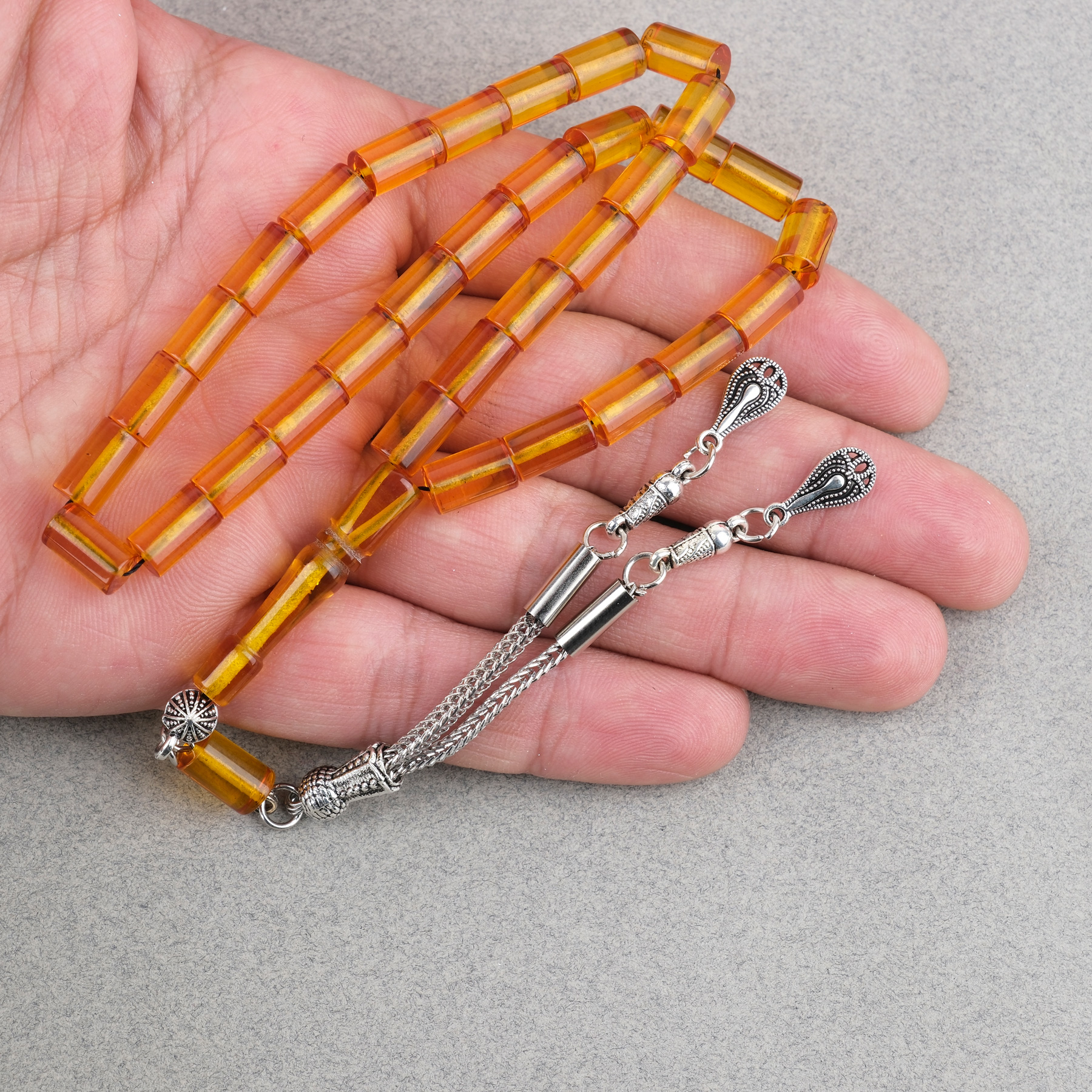 Ateş Kehribar Kesme Kesim Alpaka Püsküllü 6x10mm Tesbih
