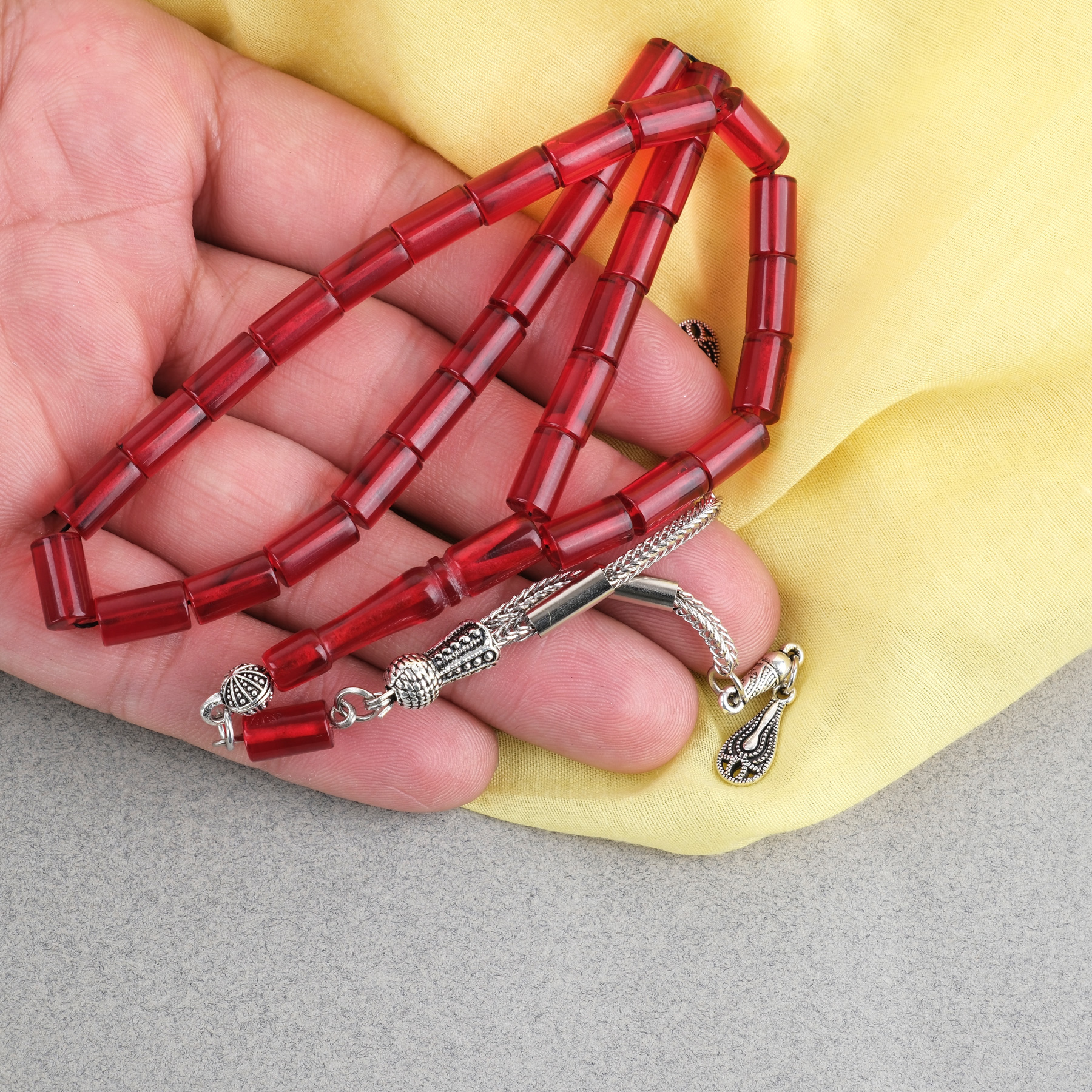 Ateş Kehribar Kesme Kesim Alpaka Püsküllü 6x10mm Tesbih