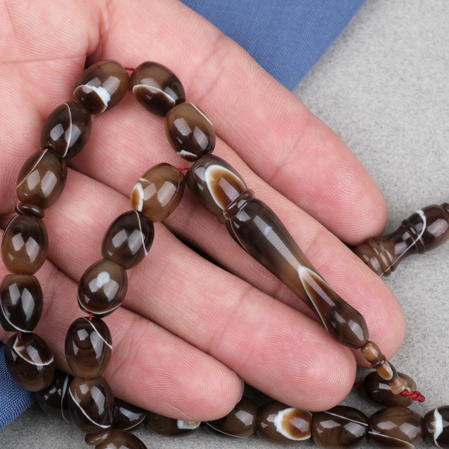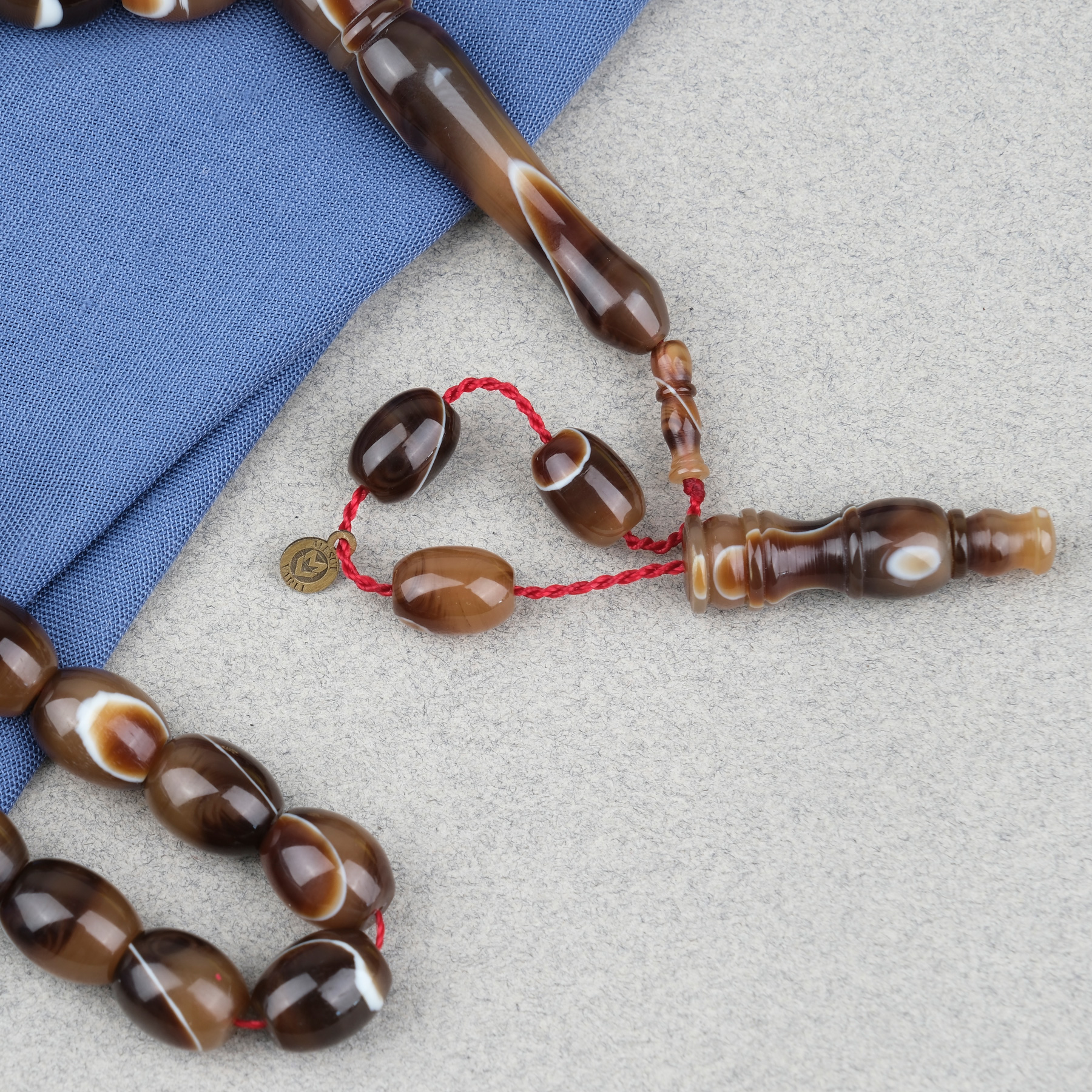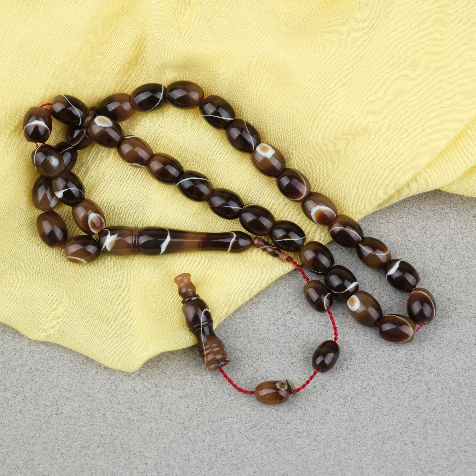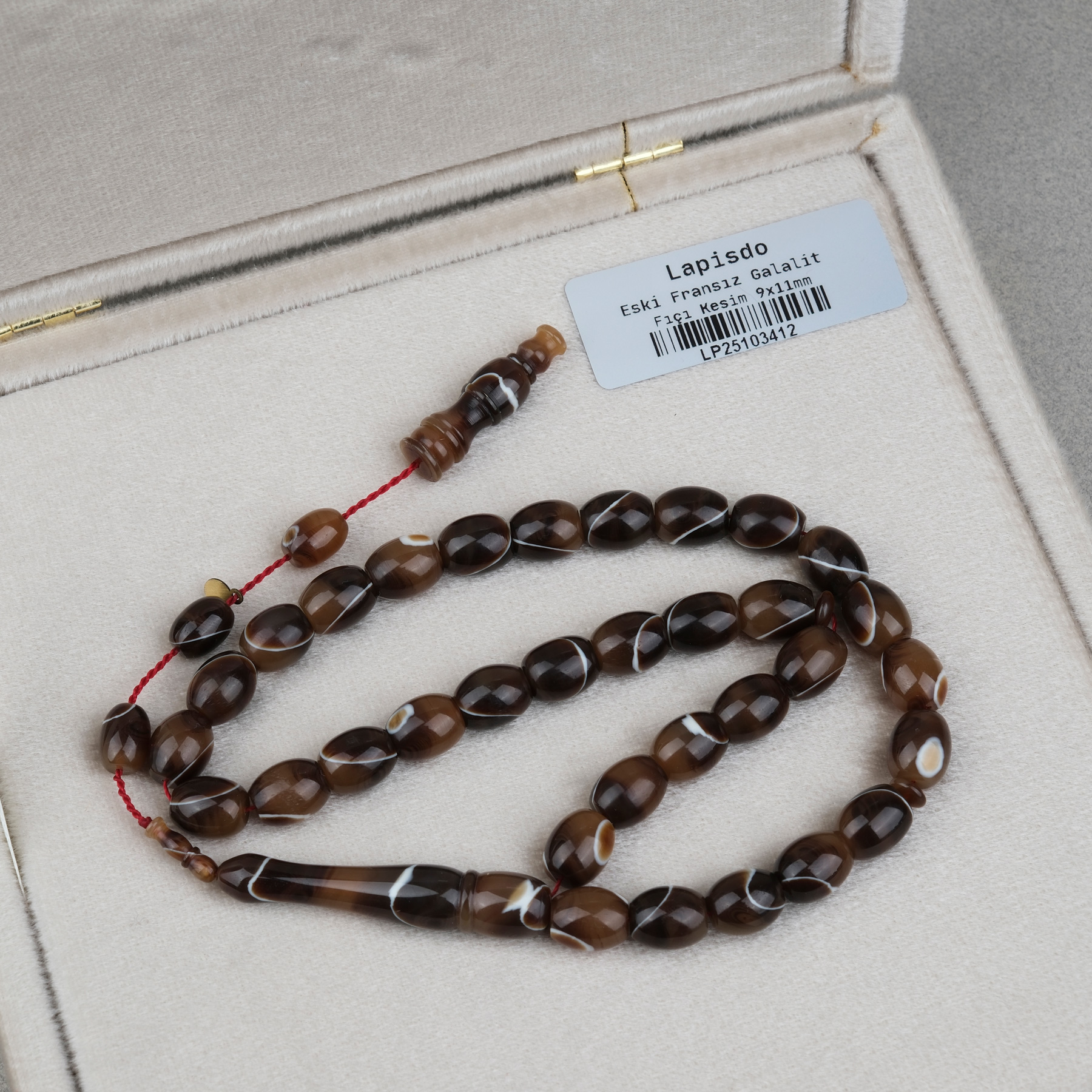 Eski Fransız Galalit Fıçı Kesim Mesut Varlı Usta İşi 9x11mm Tesbih - Kahverengi Beyaz