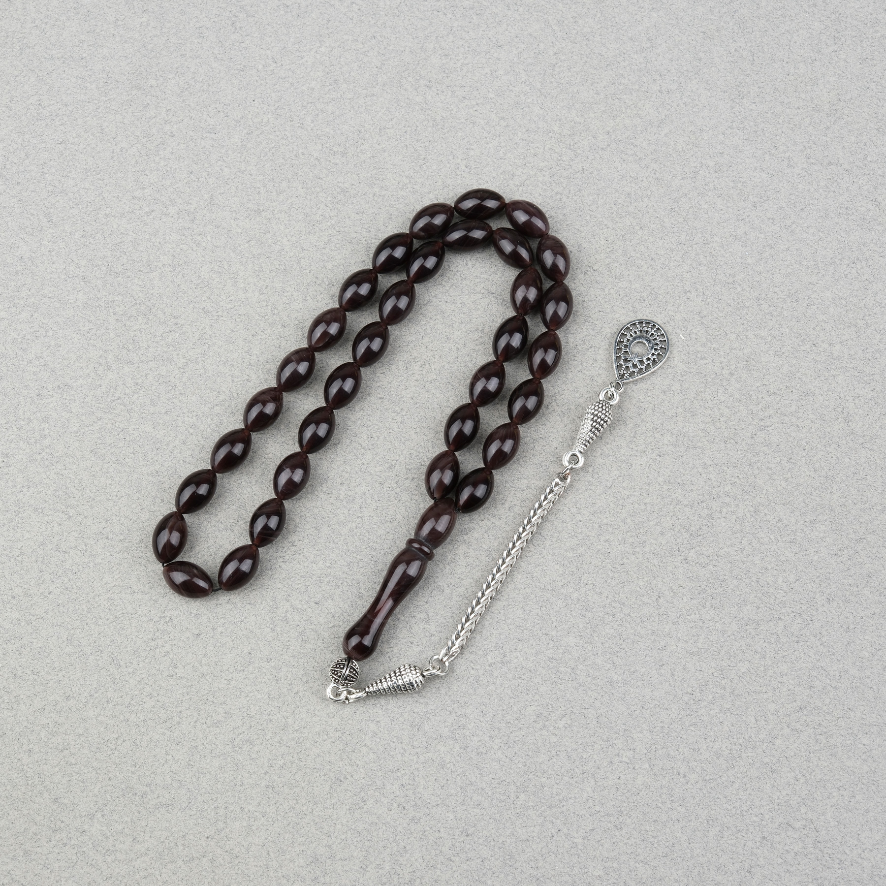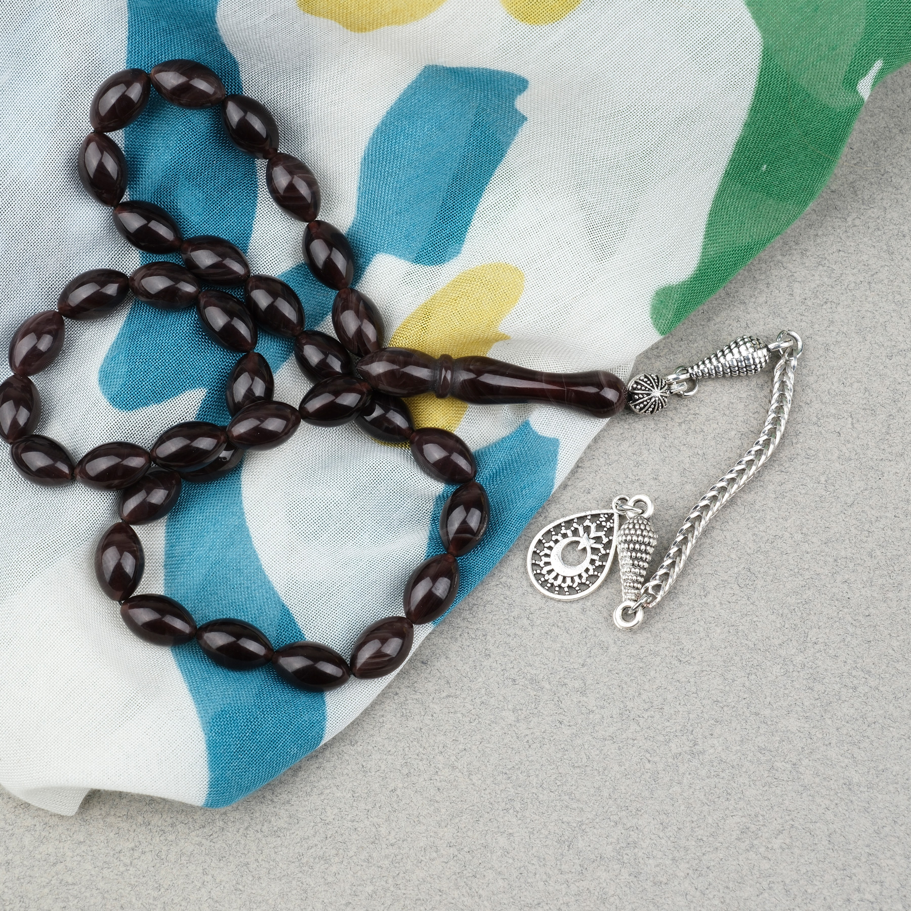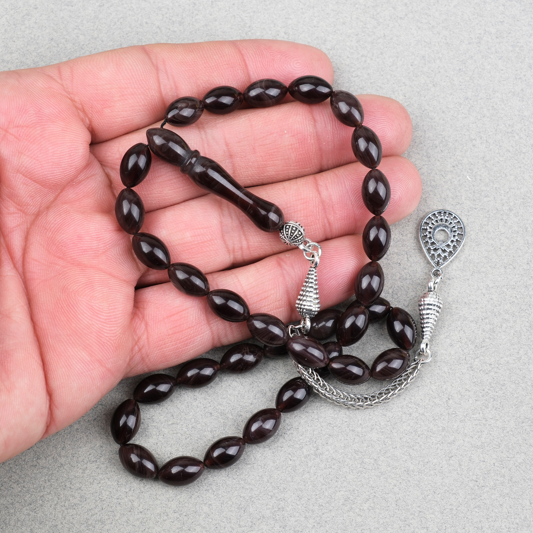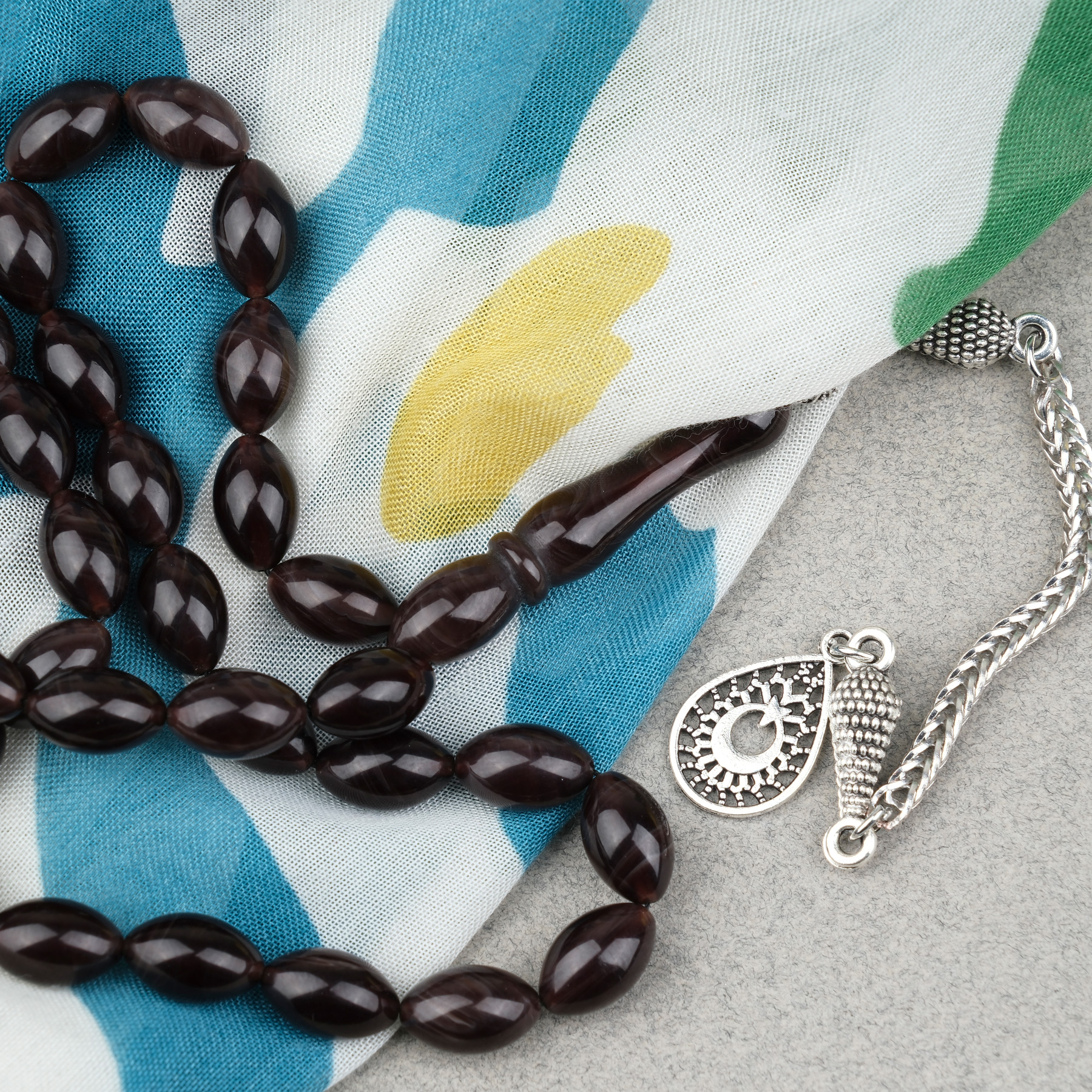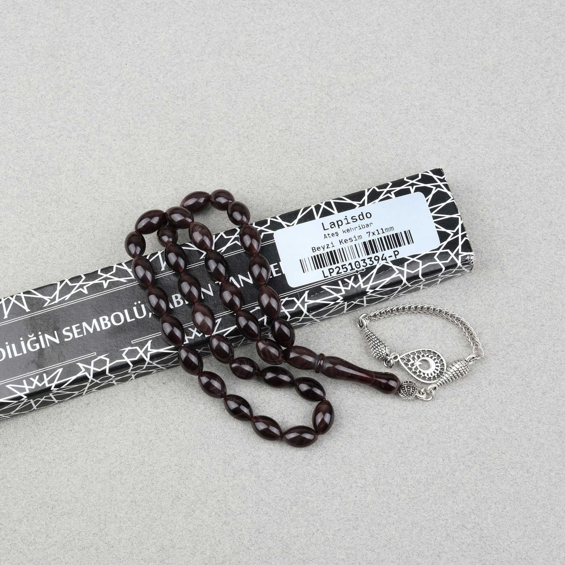 Sıkma Kehribar Alpaka Püsküllü Beyzi Kesim 7x11mm Tesbih- Kahverengi