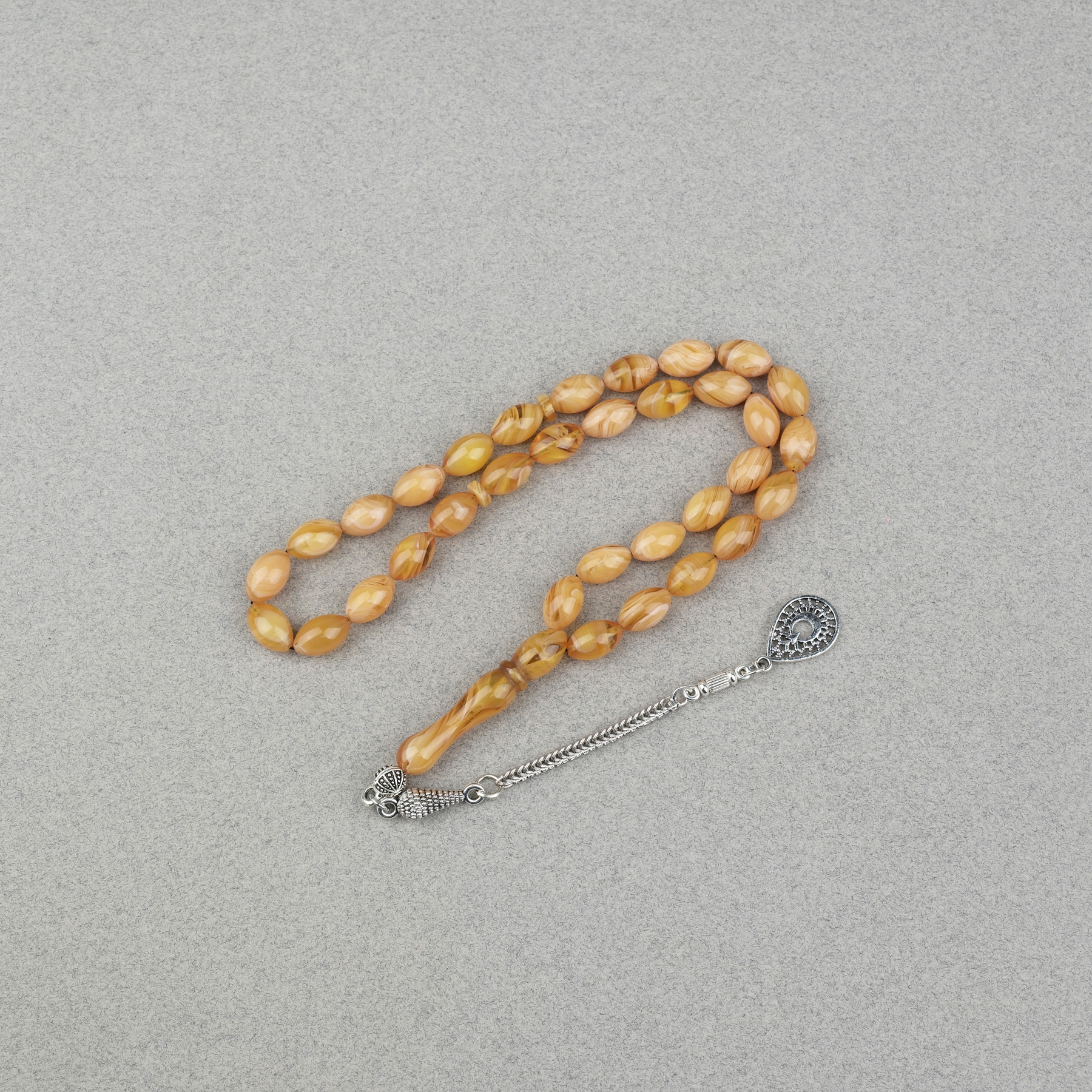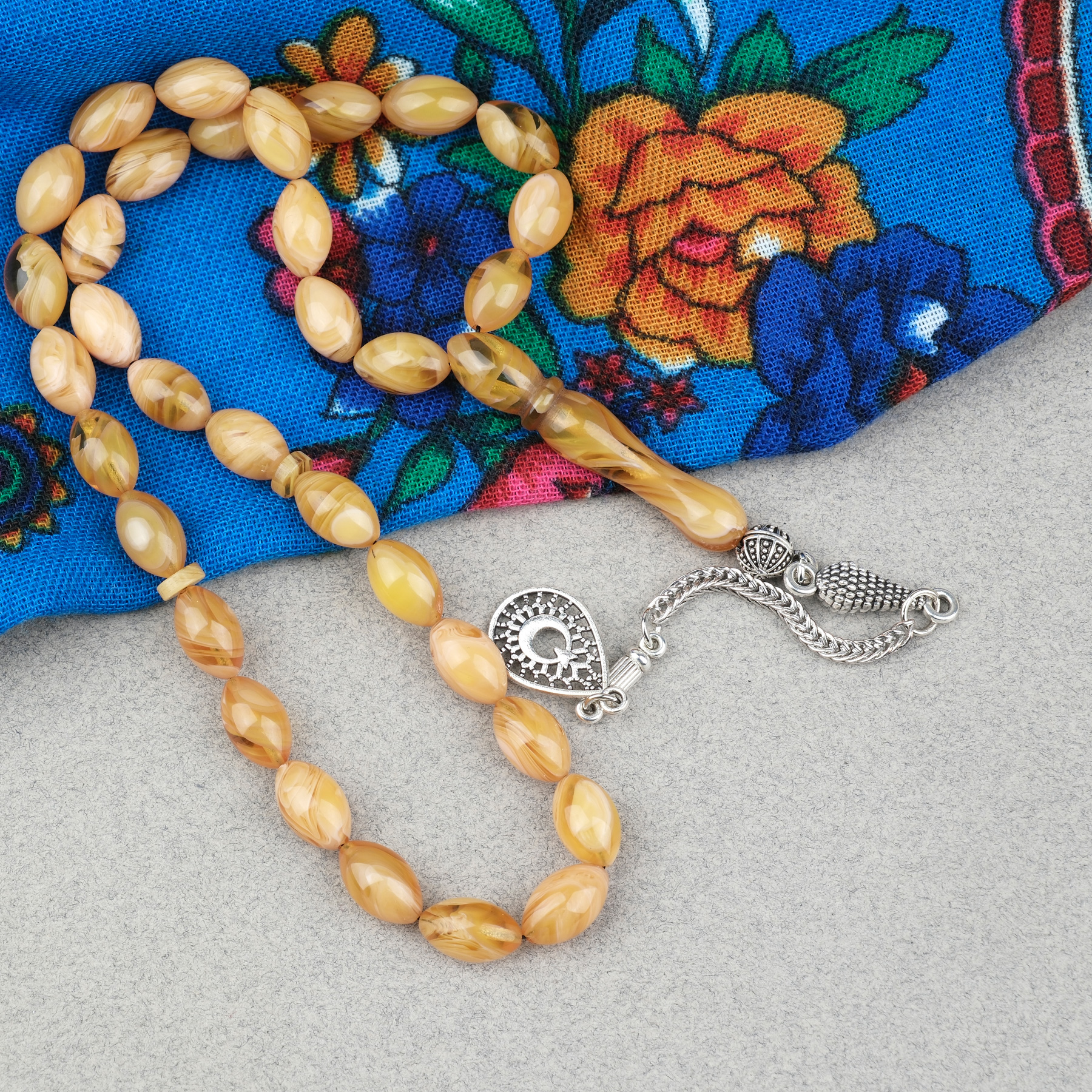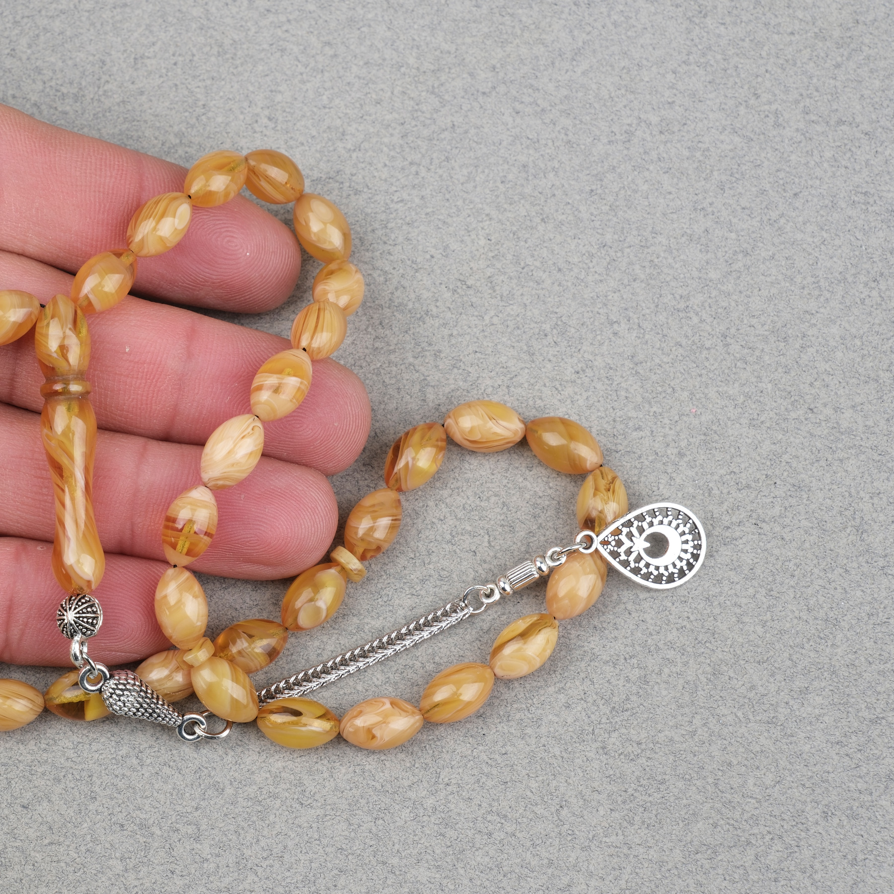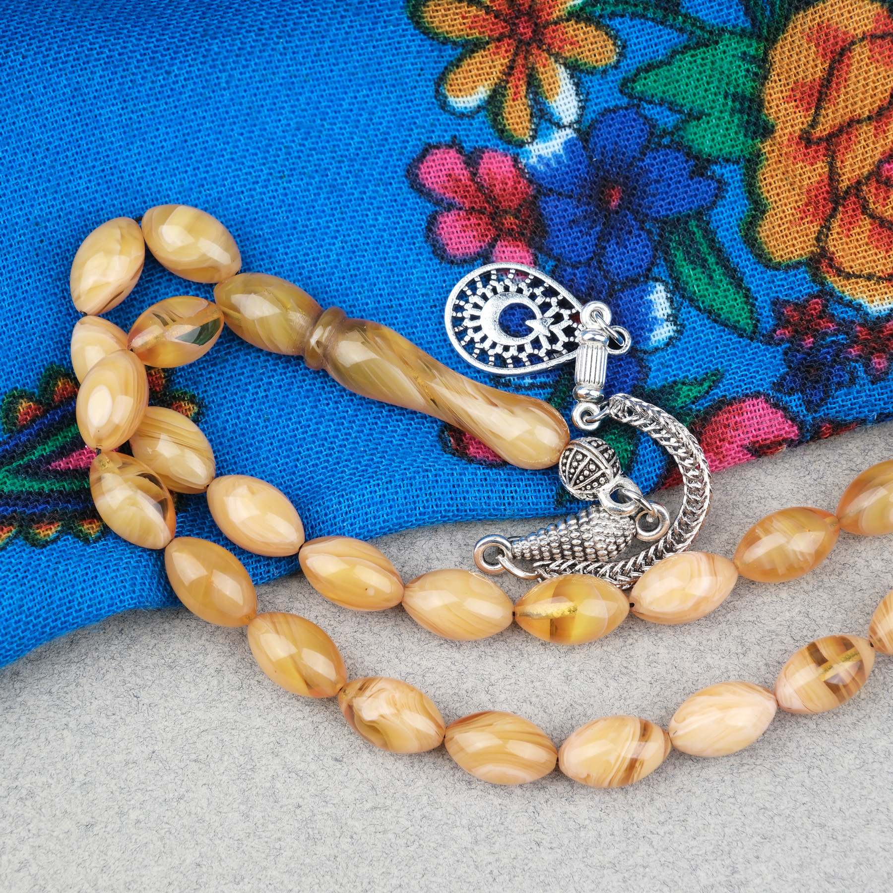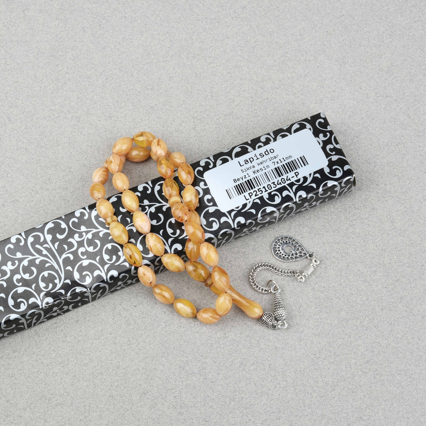 Sıkma Kehribar Alpaka Püsküllü Beyzi Kesim 7x11mm Tesbih- Krem Sarı