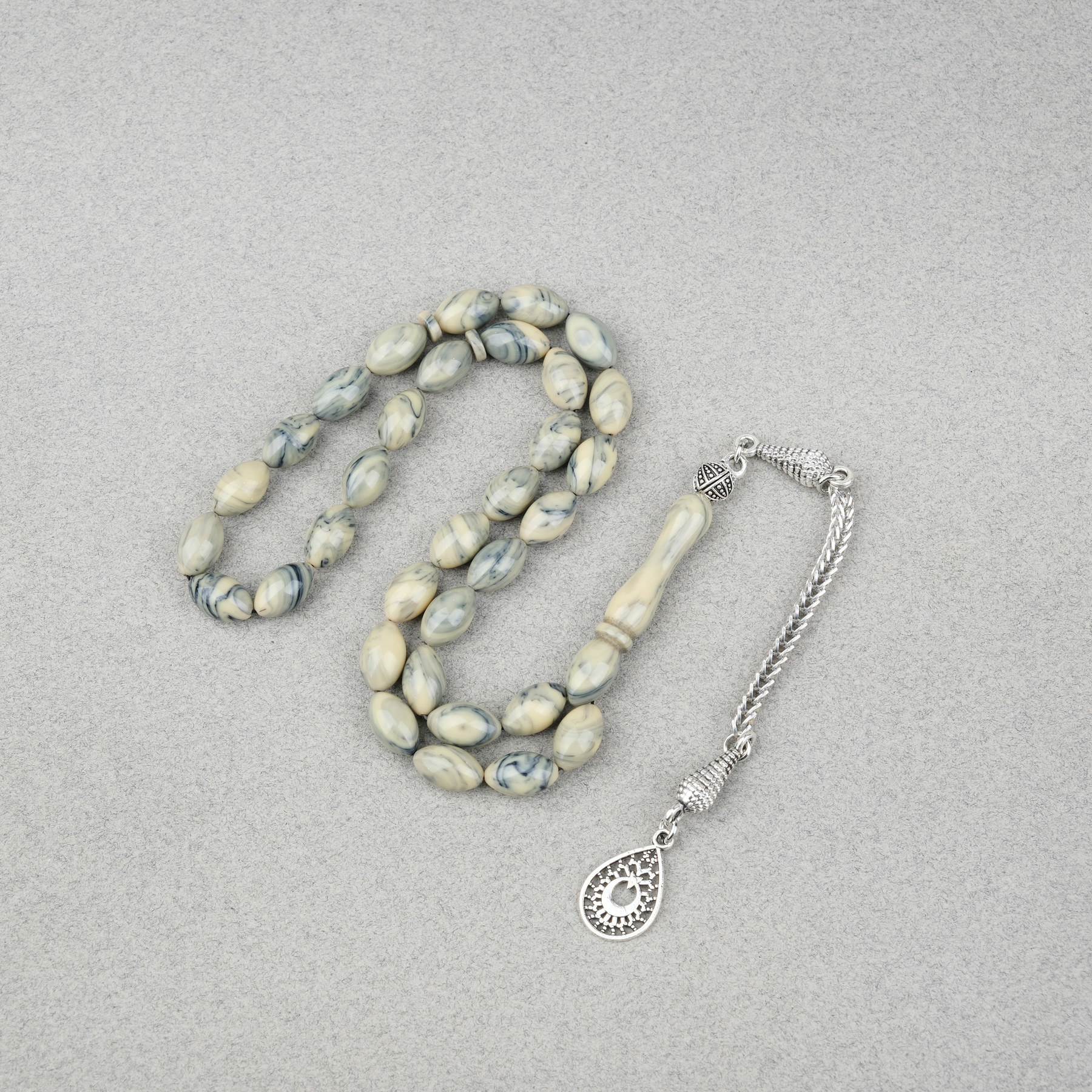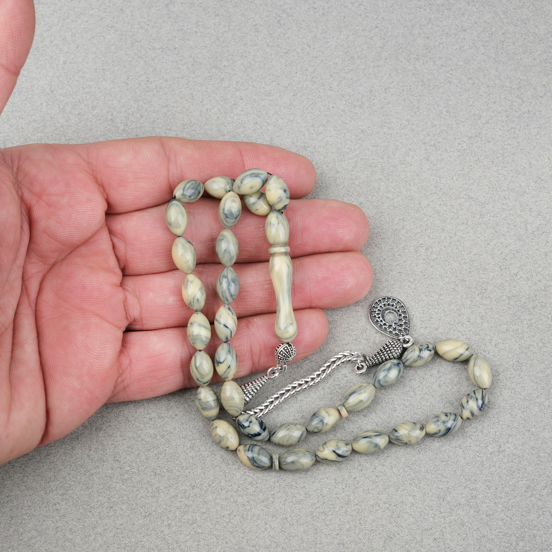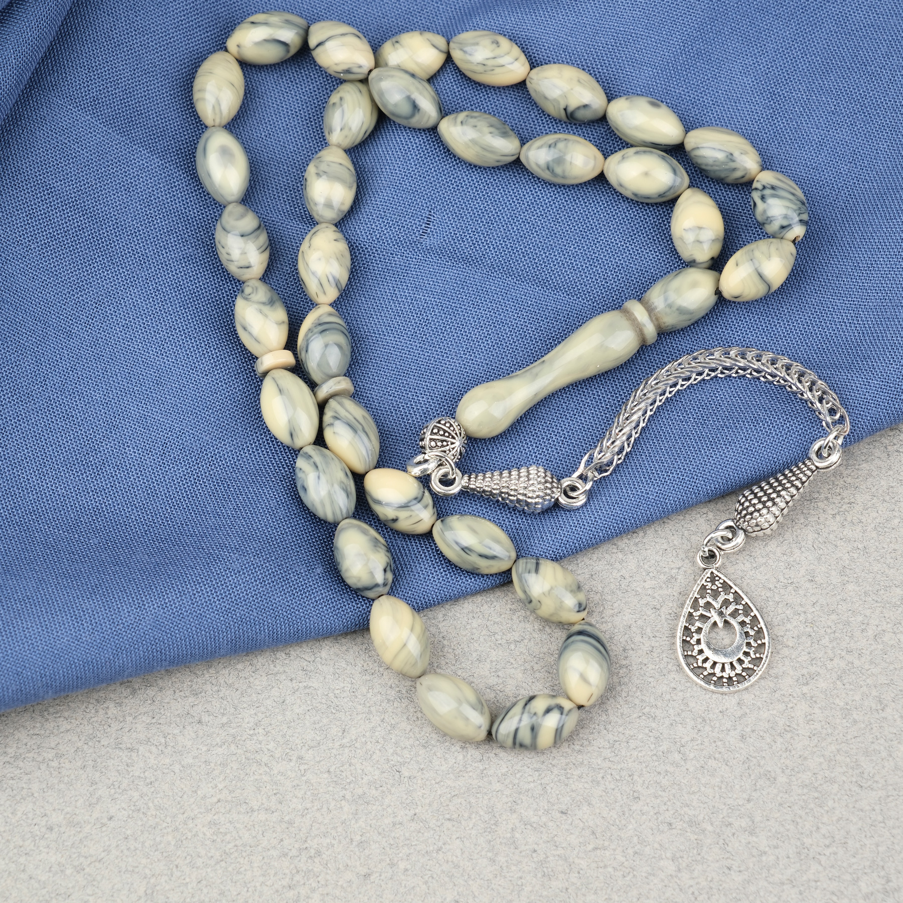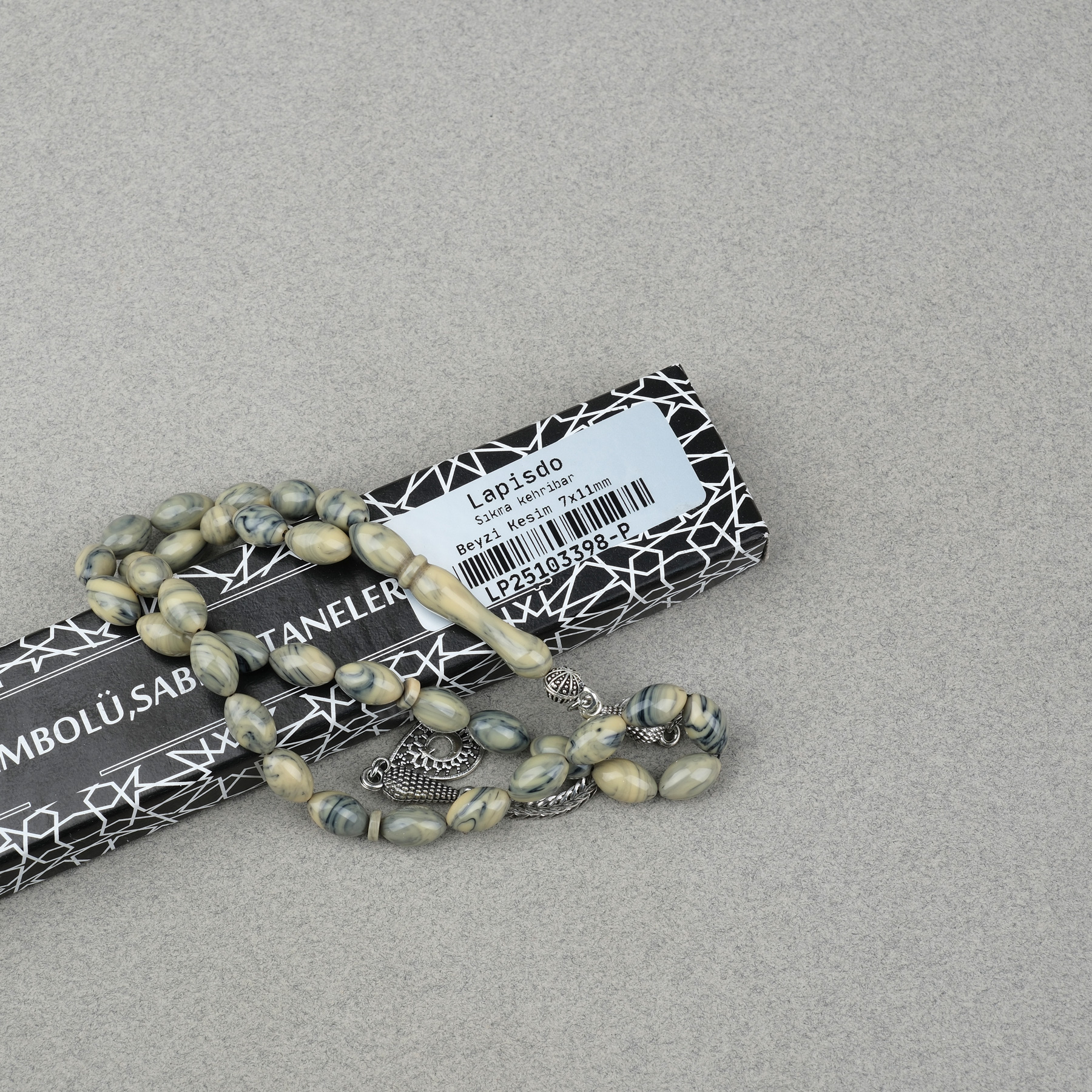 Sıkma Kehribar Alpaka Püsküllü Beyzi Kesim 7x11mm Tesbih- Krem Yeşil