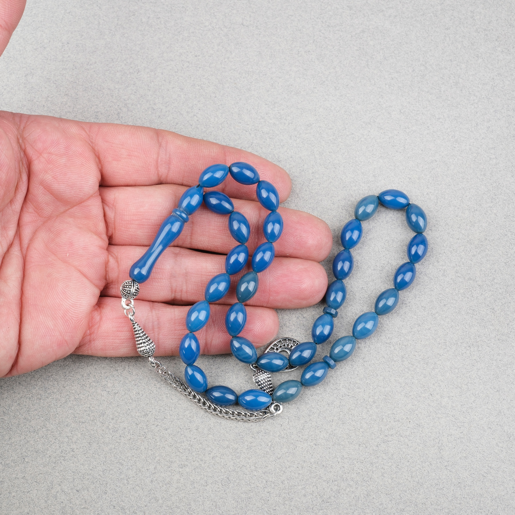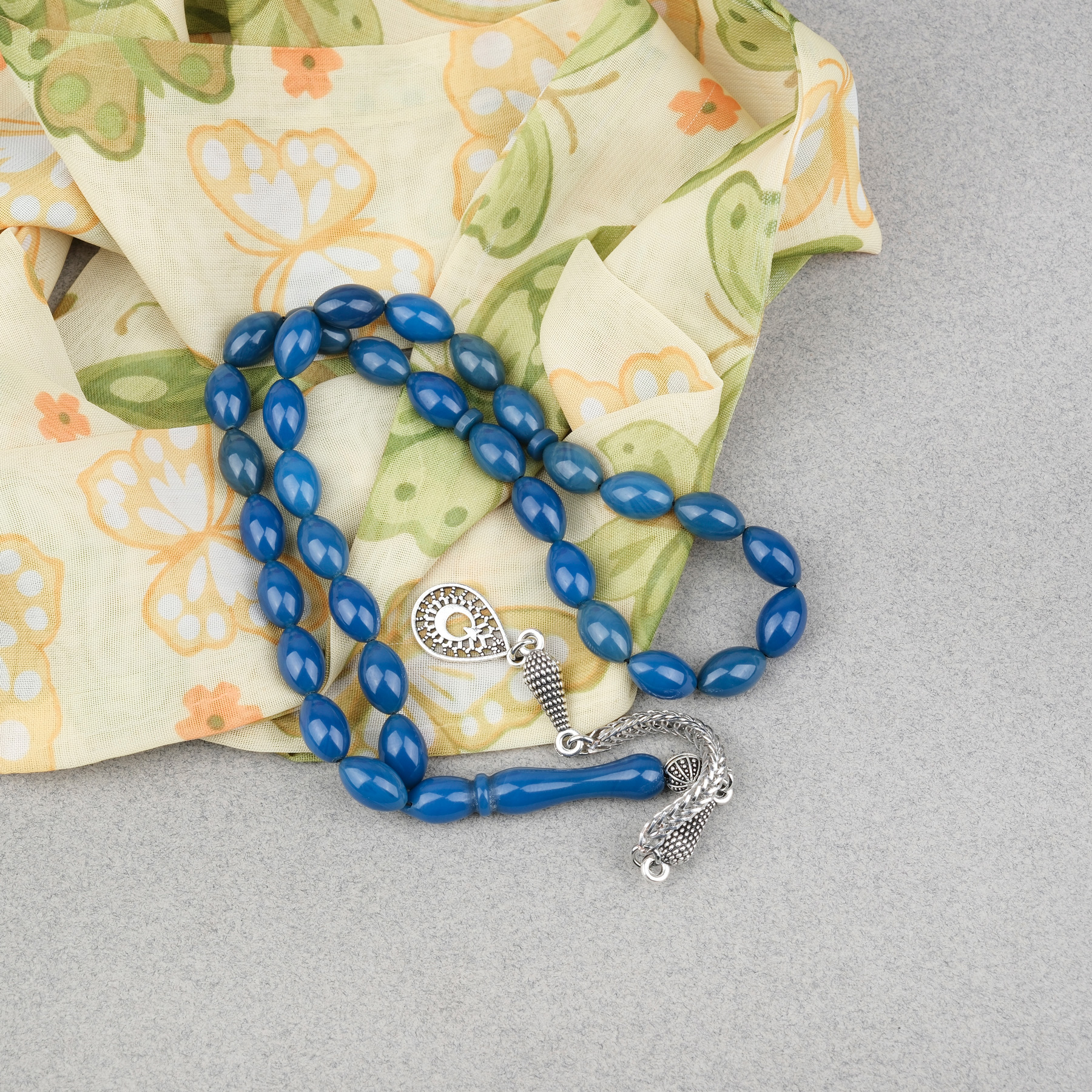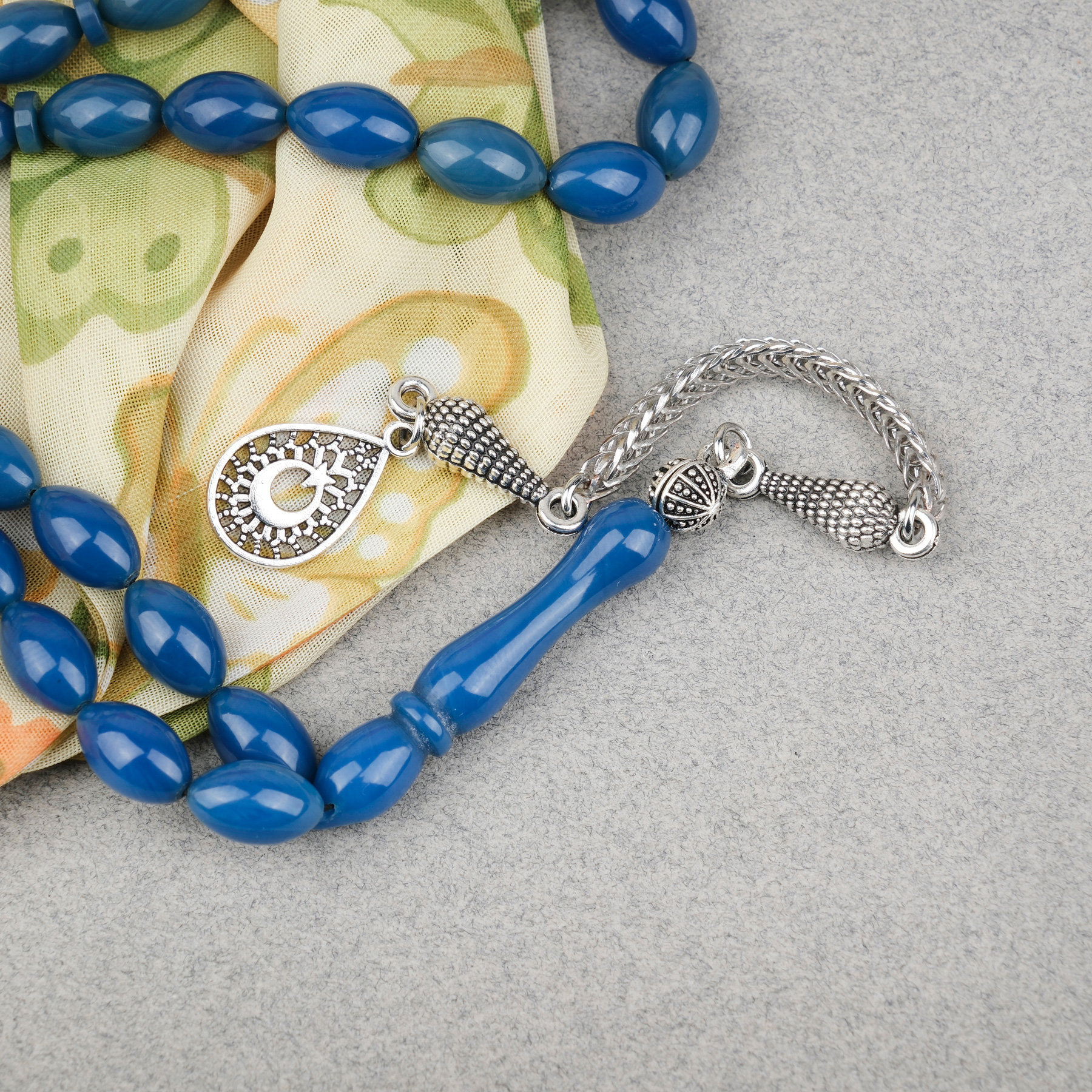 Sıkma Kehribar Alpaka Püsküllü Beyzi Kesim 7x11mm Tesbih- Petrol Mavisi