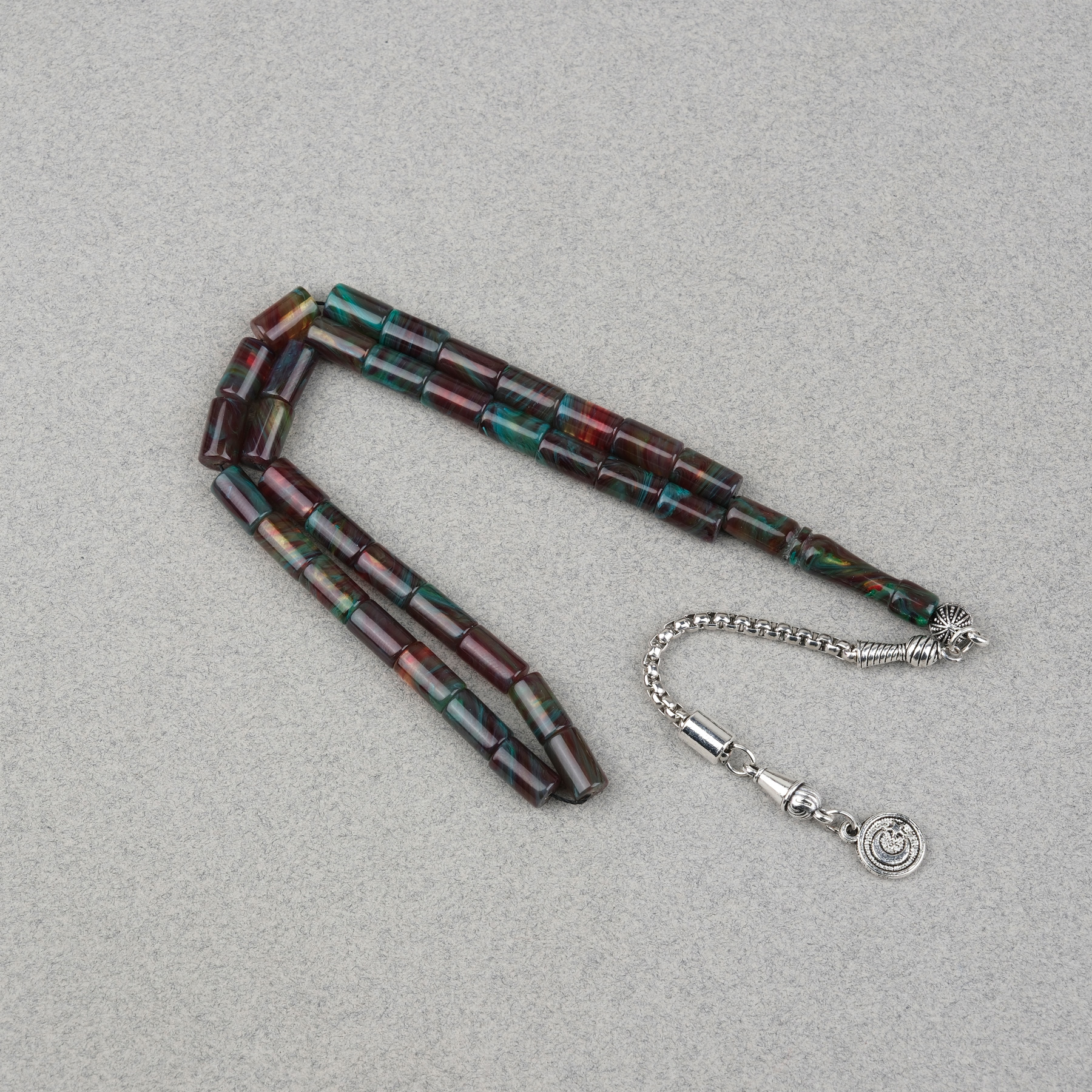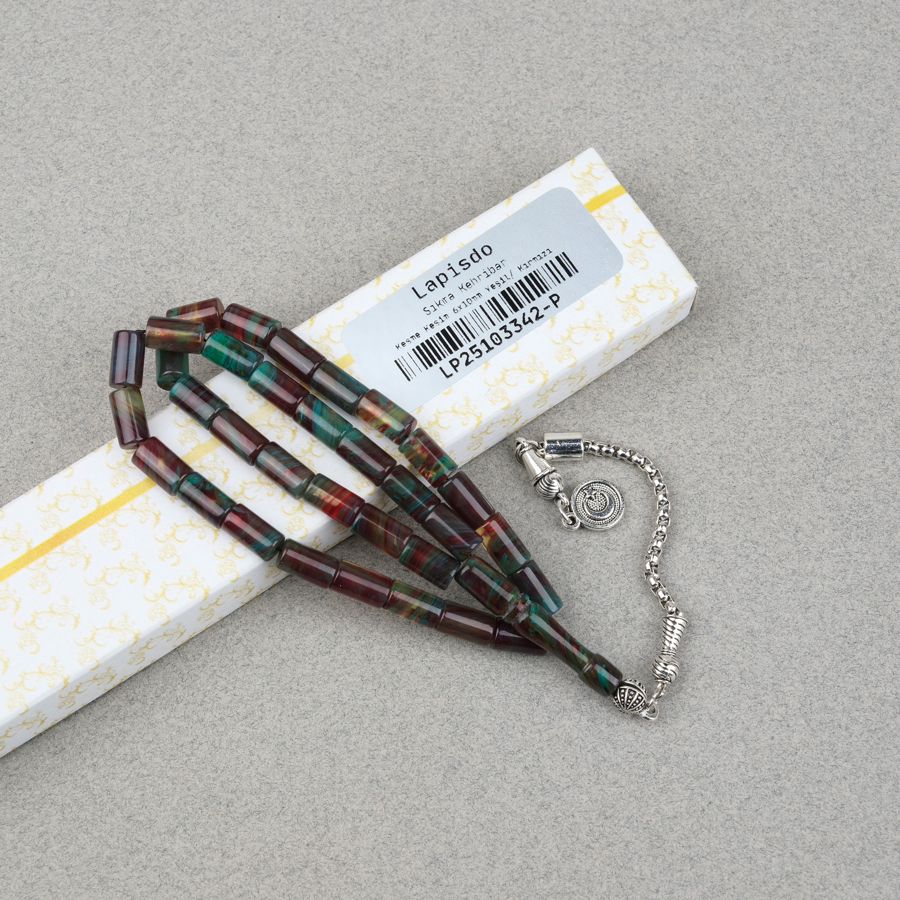 Sıkma Kehribar Alpaka Püsküllü Kesme Kesim 6x10mm Tesbih - Yeşil Kırmızı
