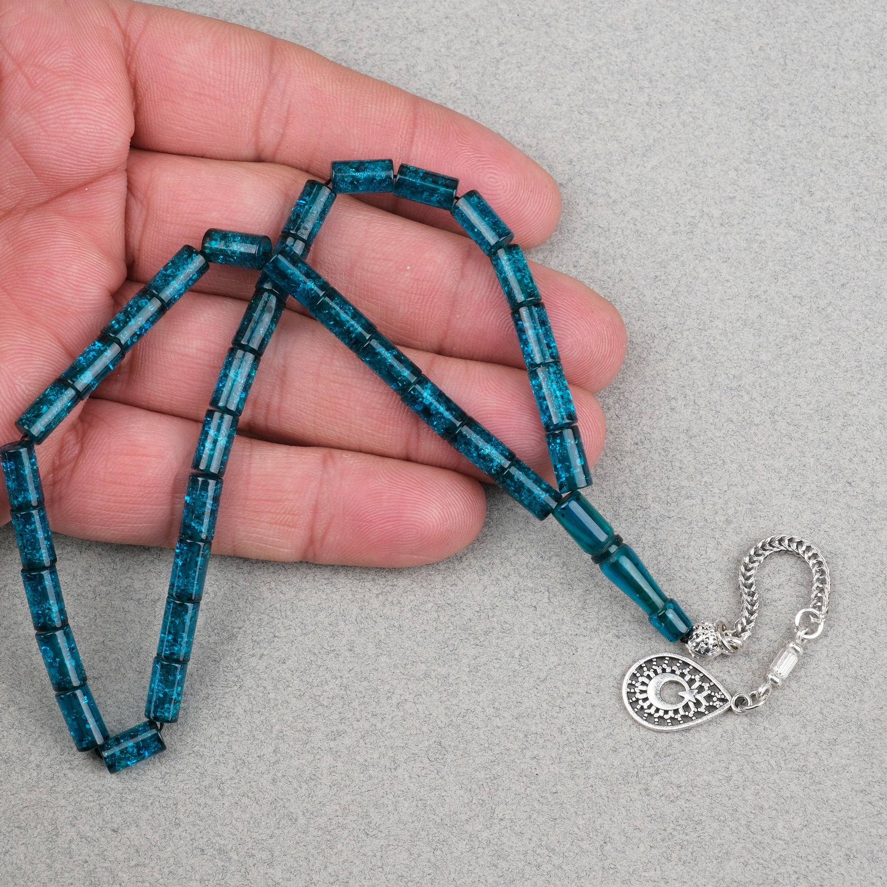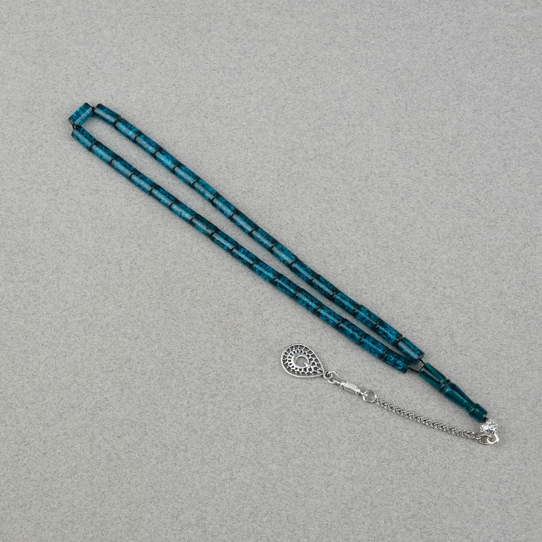 Sıkma Kehribar Bilek Boy Alpaka Püsküllü Kesme Kesim 5x9mm Tesbih -Koyu Yeşil