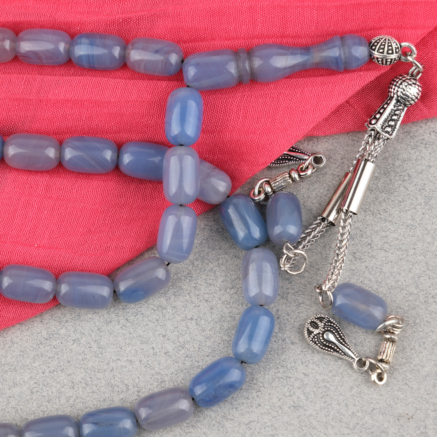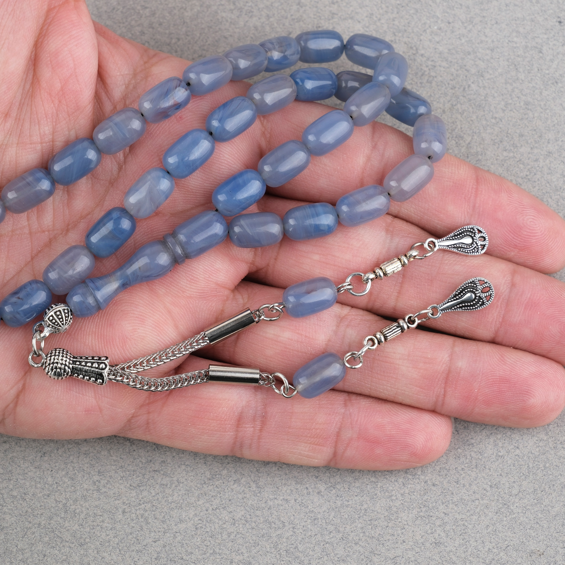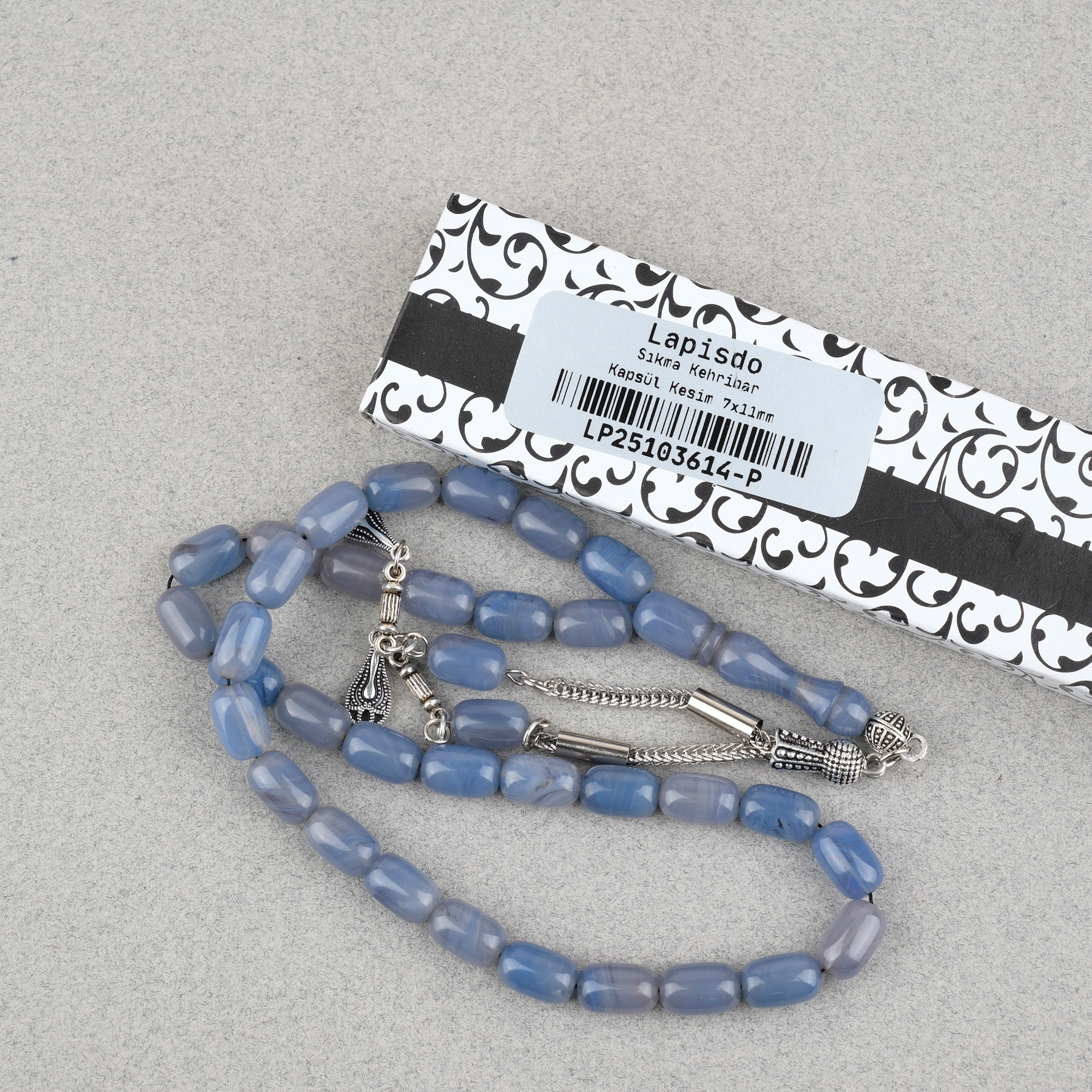 Sıkma Kehribar Kapsül Kesim Alpaka Püsküllü 7x11mm Tesbih Gök Mavisi
