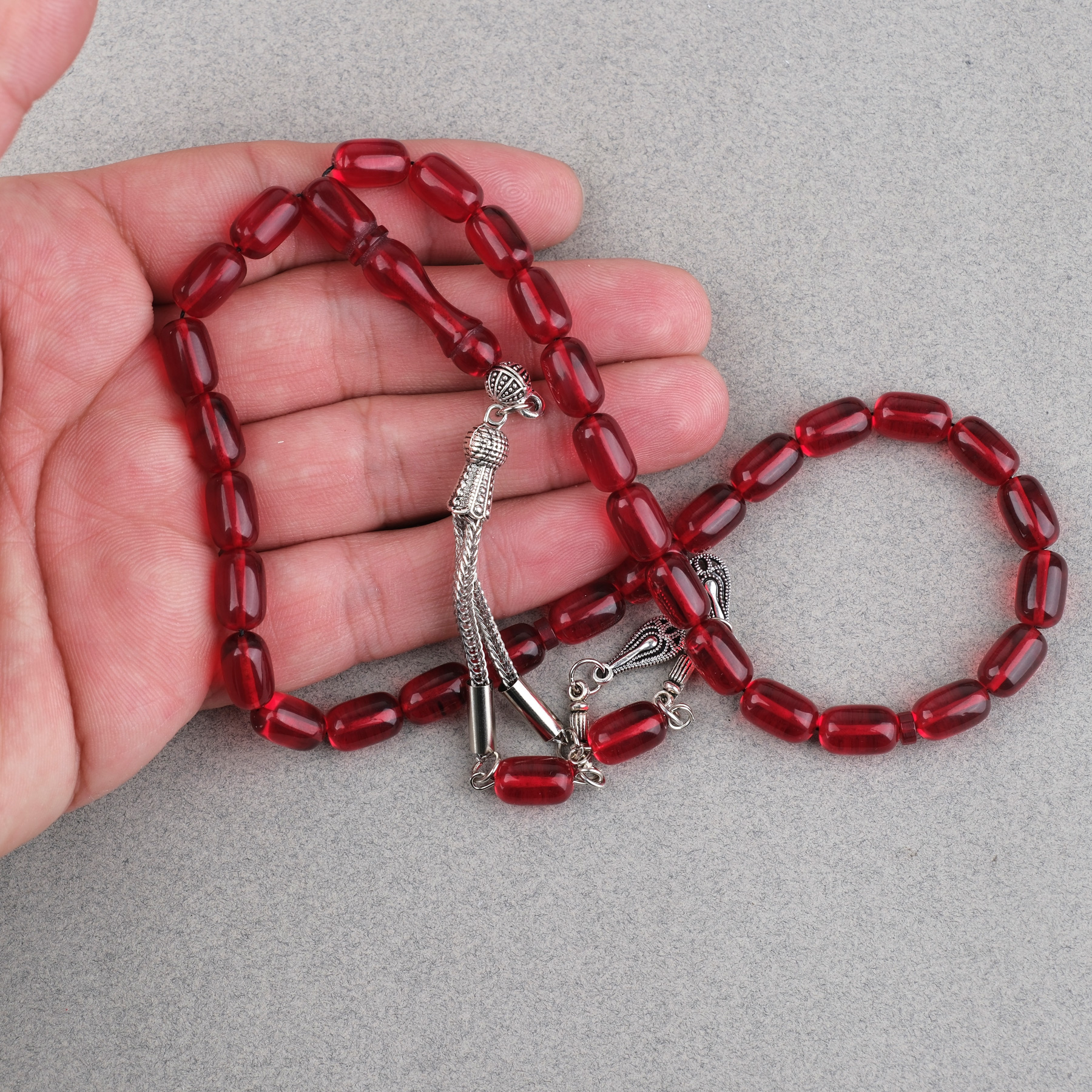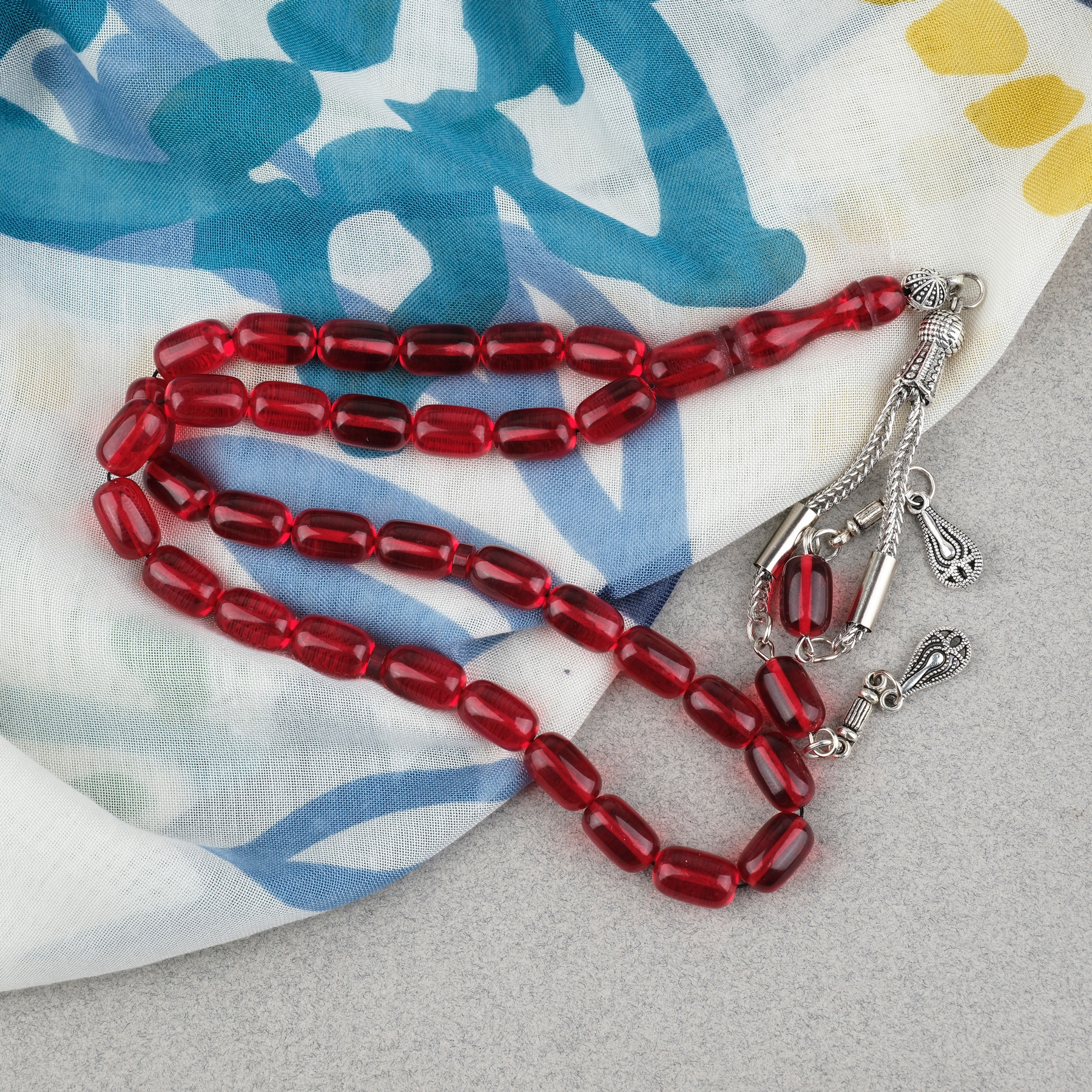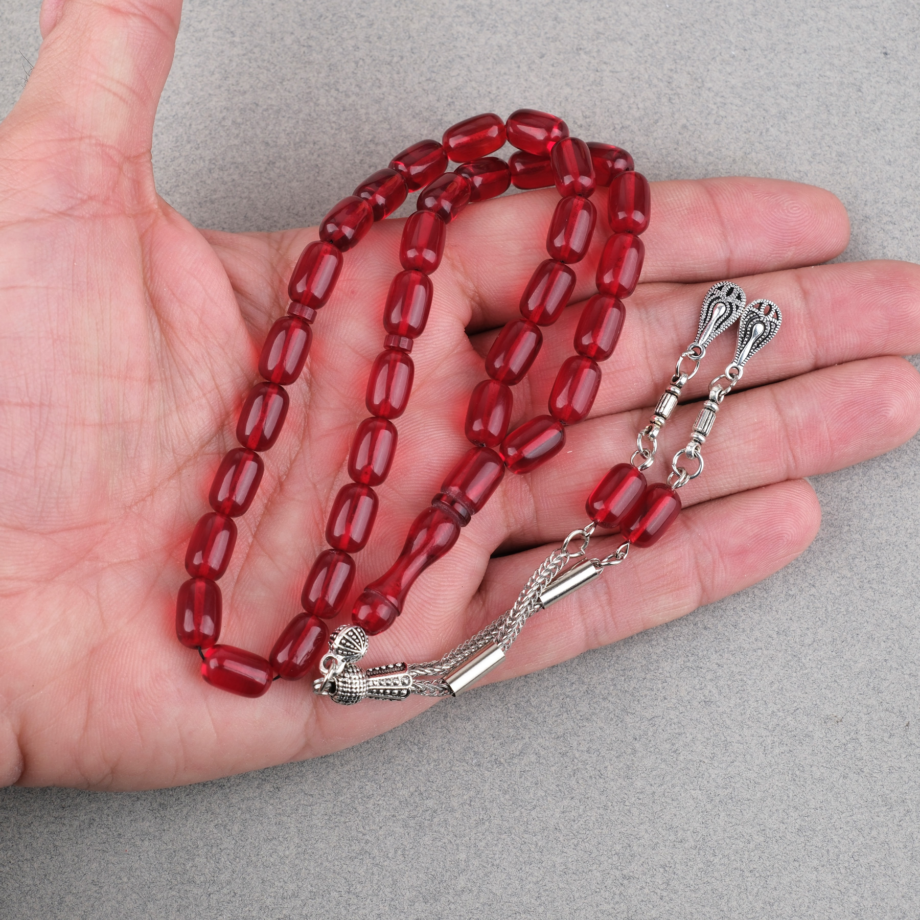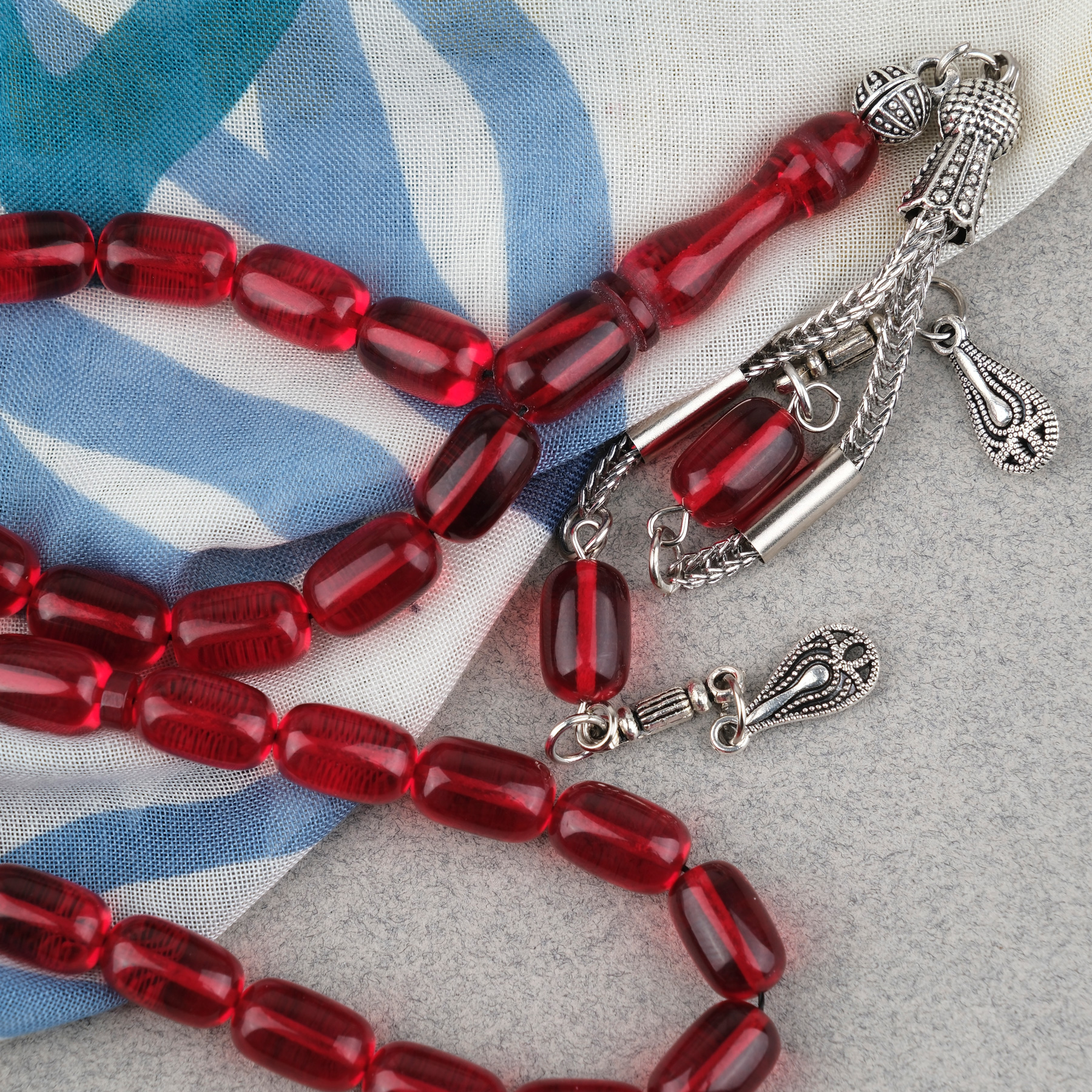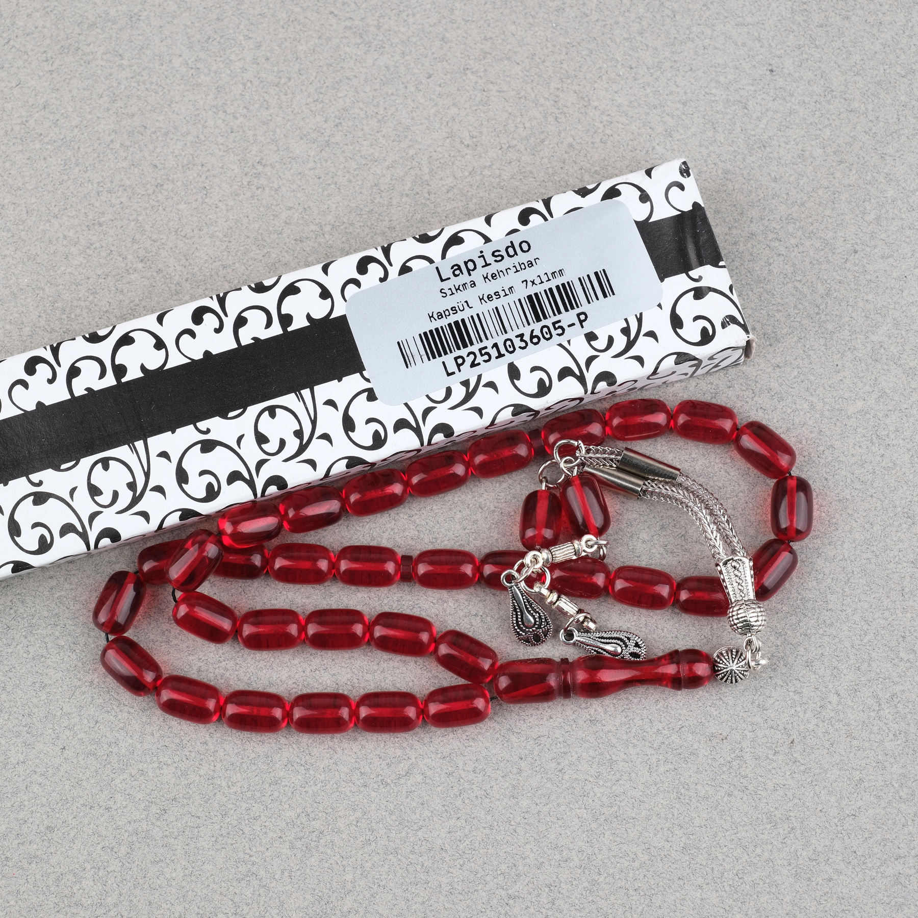 Sıkma Kehribar Kapsül Kesim Alpaka Püsküllü 7x11mm Tesbih Kırmızı