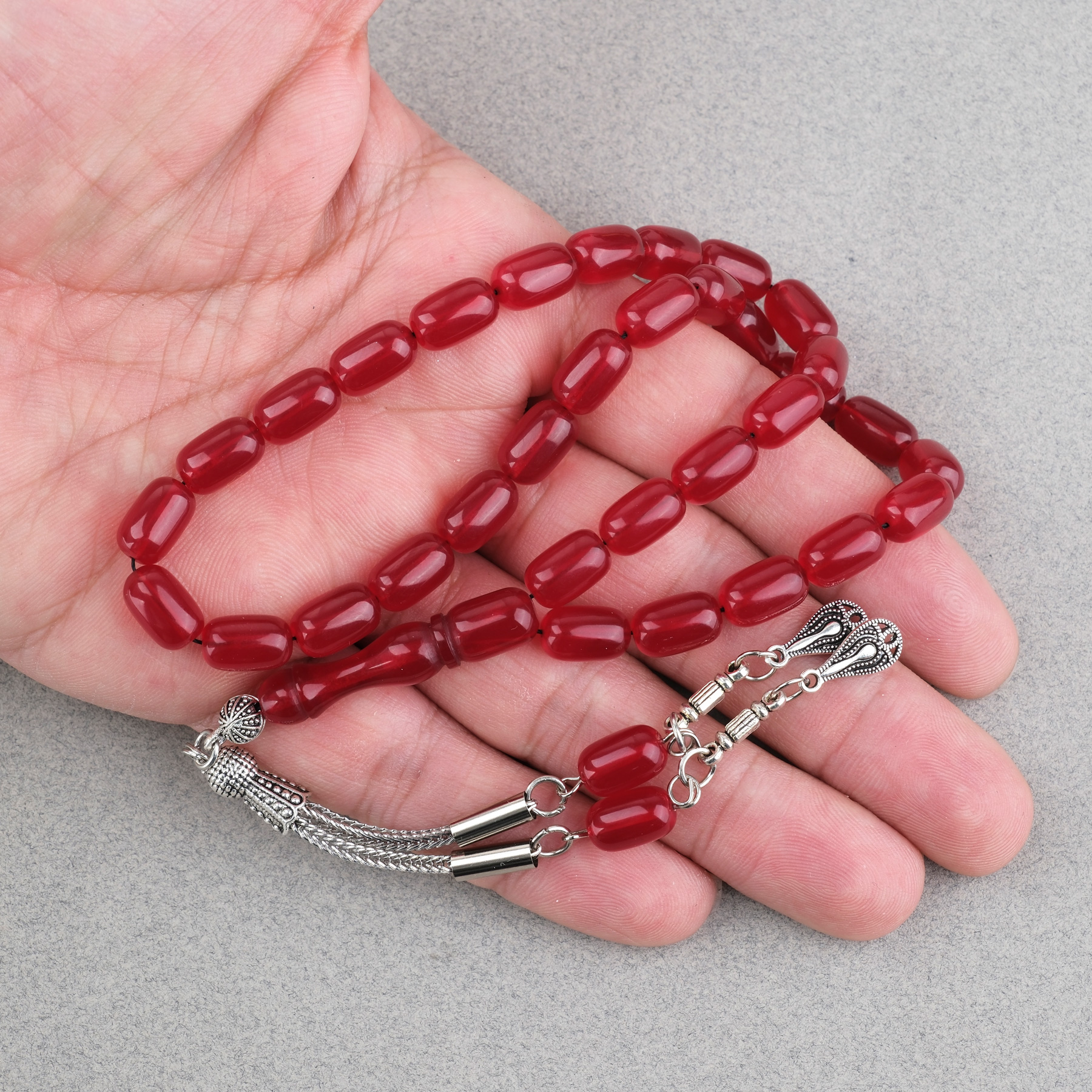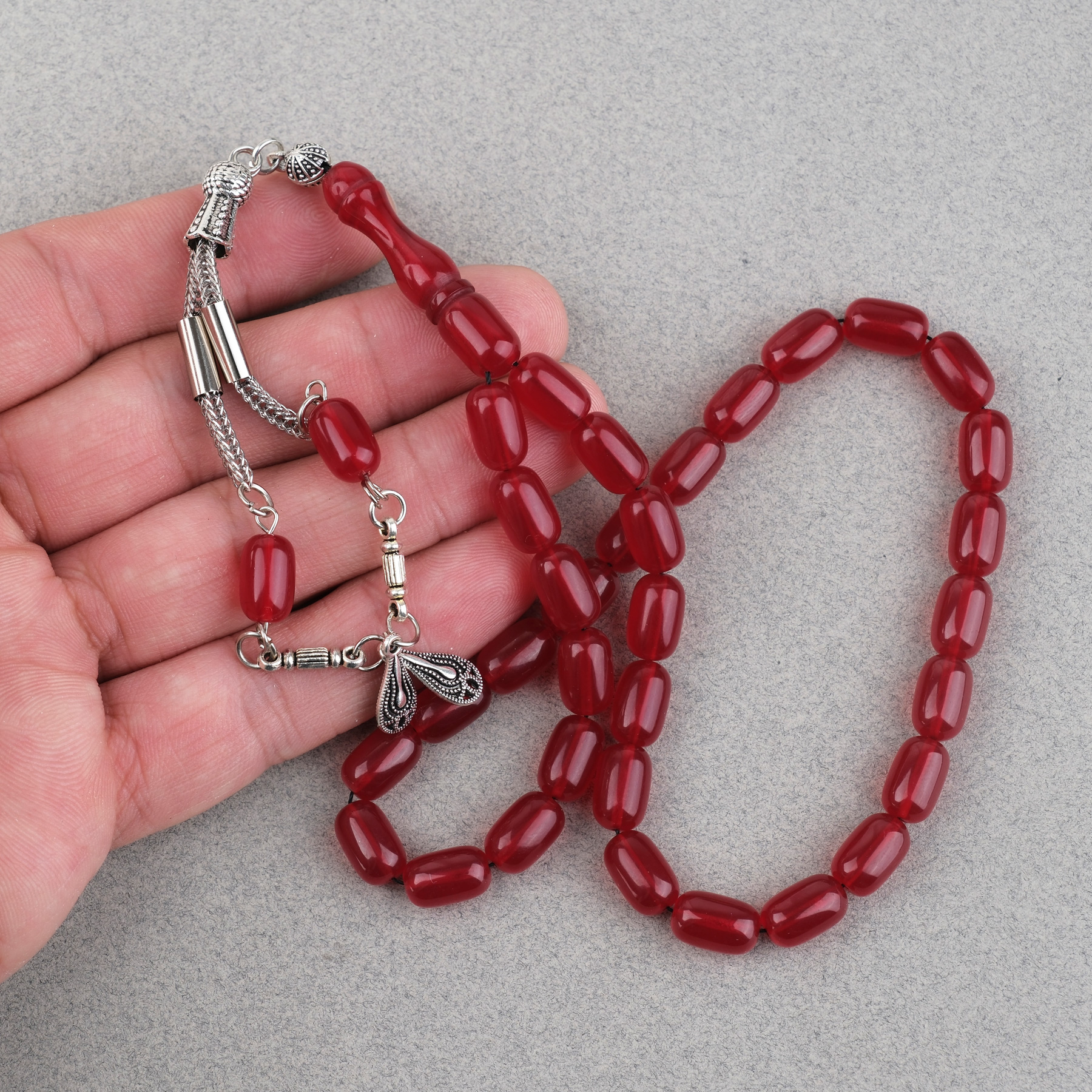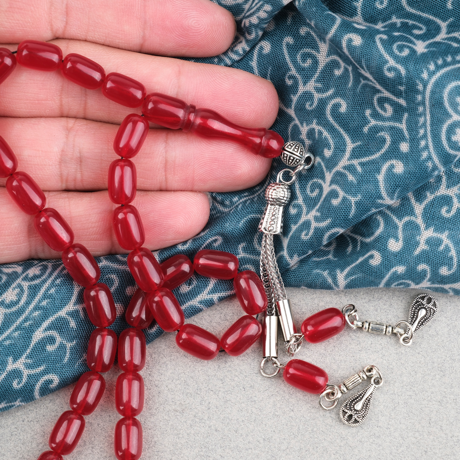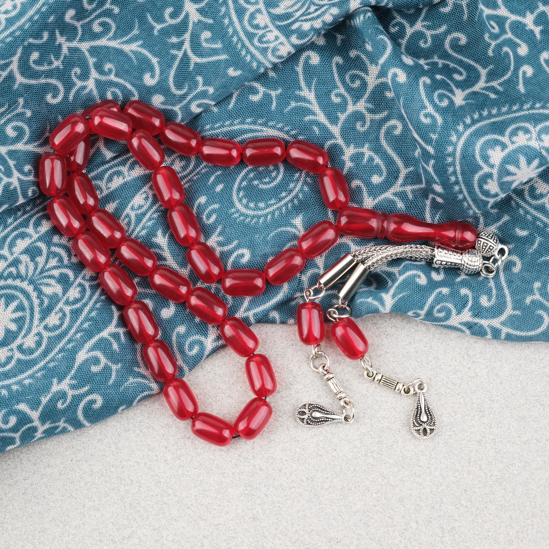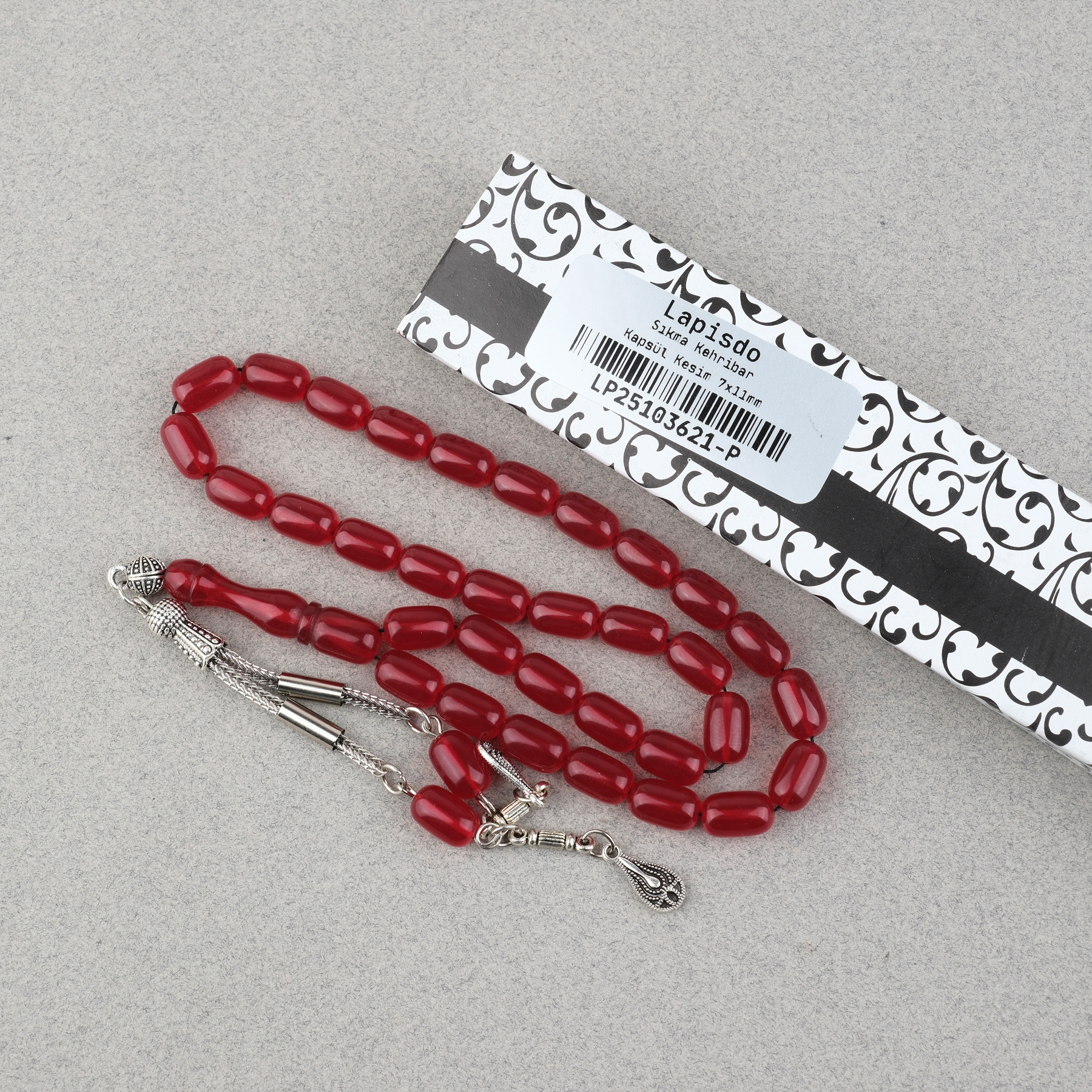Sıkma Kehribar Kapsül Kesim Alpaka Püsküllü 7x11mm Tesbih Kırmızı