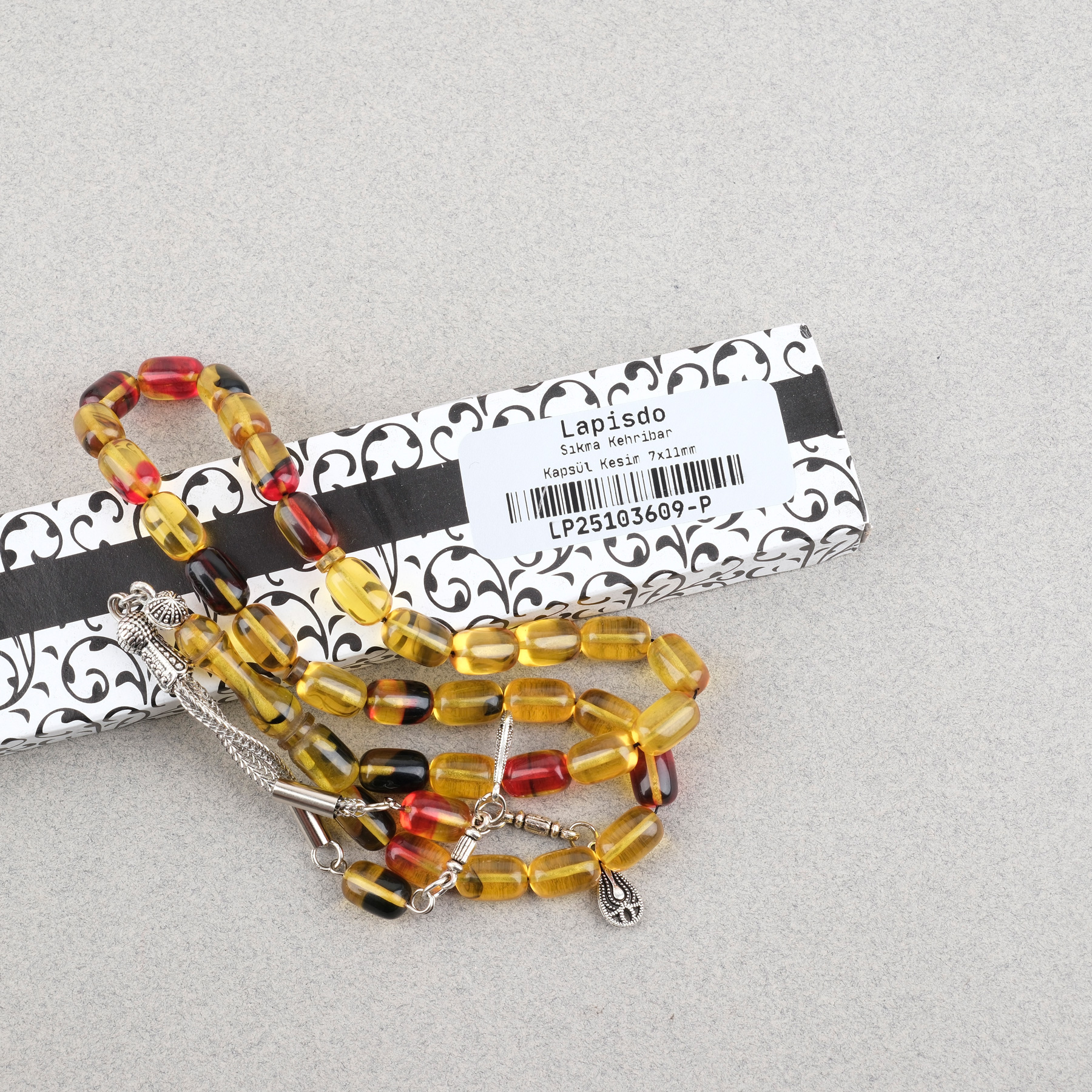Sıkma Kehribar Kapsül Kesim Alpaka Püsküllü 7x11mm Tesbih