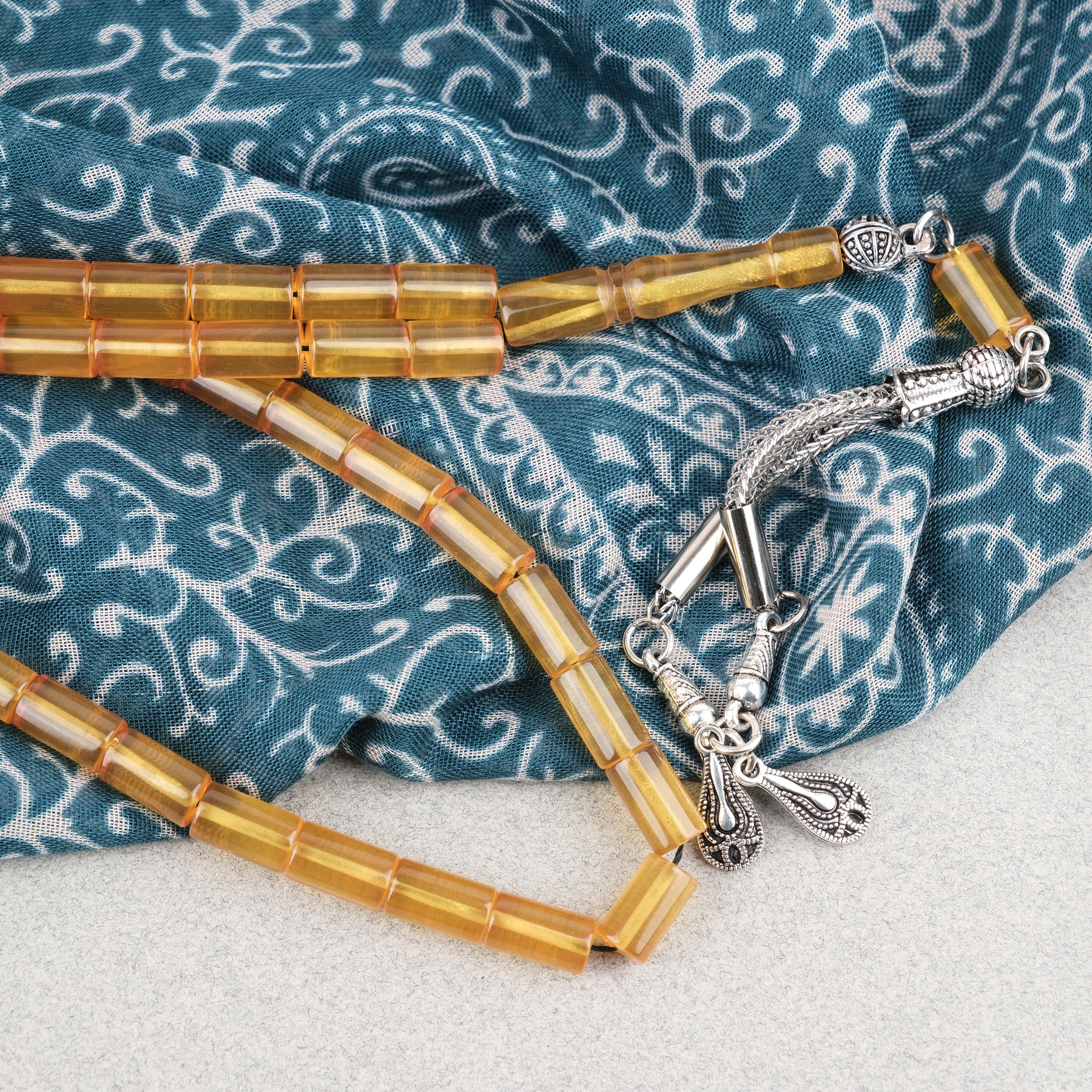 Sıkma Kehribar Kesme Kesim Alpaka Püsküllü 6x10mm Tesbih